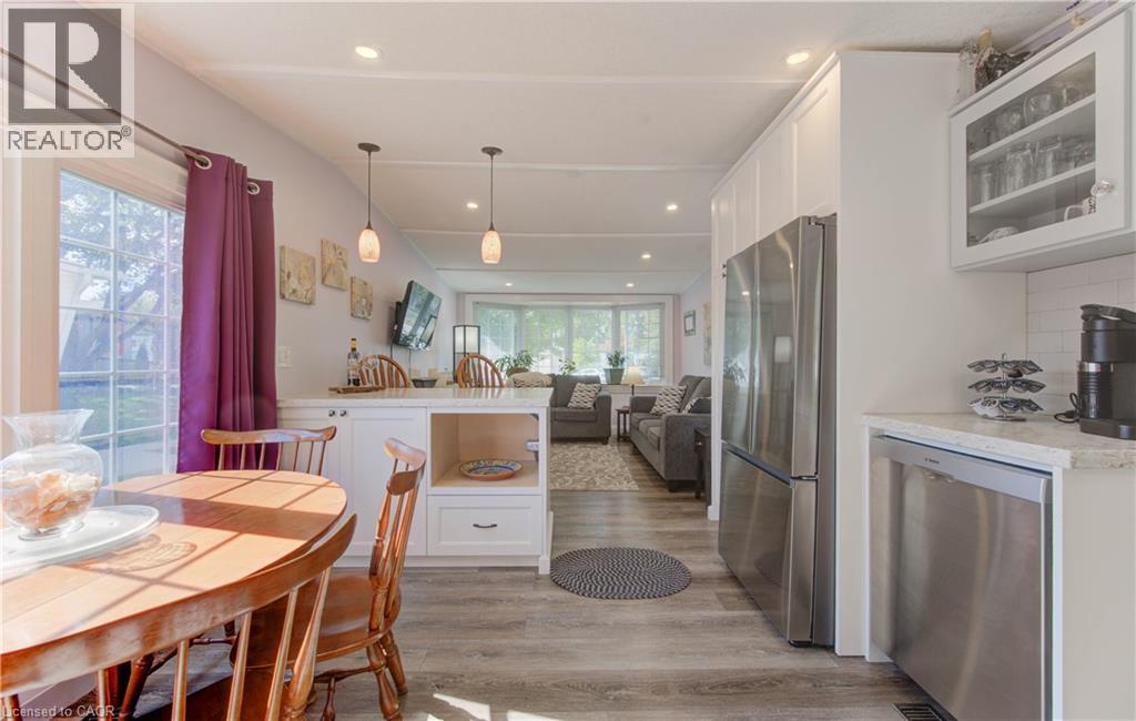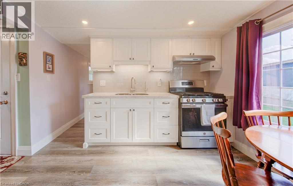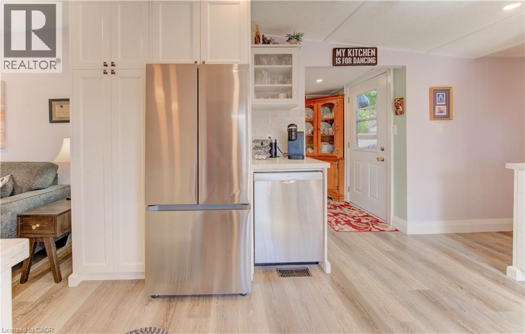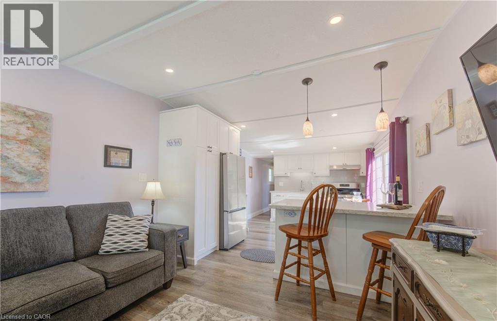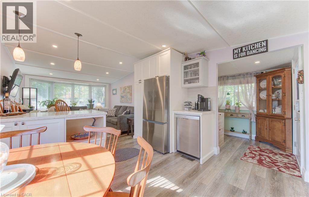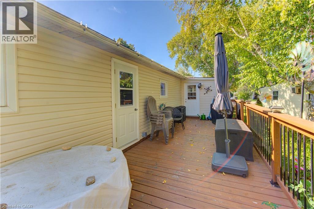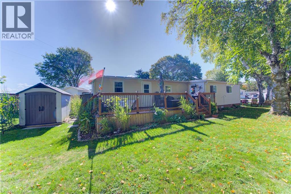 Incredible opportunity to live close to nature, in this updated and cozy home. Perfect for anyone that wants outdoor space and affordable year-round living. This lovely 2 Bedroom, fully winterized mobile home offers all the comforts and so much more than condo living. With parking for 2 and a gorgeous 10 x 30 deck (2 yrs) to relax on, you CAN have it all. Upgrades since 2021 include renovated open concept kitchen and living room, trim, pot lights, laundry and bathroom with double sink and walk-in glass shower. The kitchen boasts gas stove, tile backsplash, granite counters and breakfast bar. The living room is beautiful with Bay windows overlooking the shady front yard and gardens. With full-size washer/dryer, and a primary bedroom fully customized closet organizers and built ins, there is ample storage. The yard has multiple sheds for storing belongings and a wonderful community surrounding it. (front door 2024) roof (May 2025) Reverse Osmosis (R.O.) Water System installed Land lease fee: $775.00/mnth + common element fee $45.63/mnth payable to Park Close to expressway for easy commuting Minutes from the vibrant St. Jacobs Market and local amenities (id:64974)