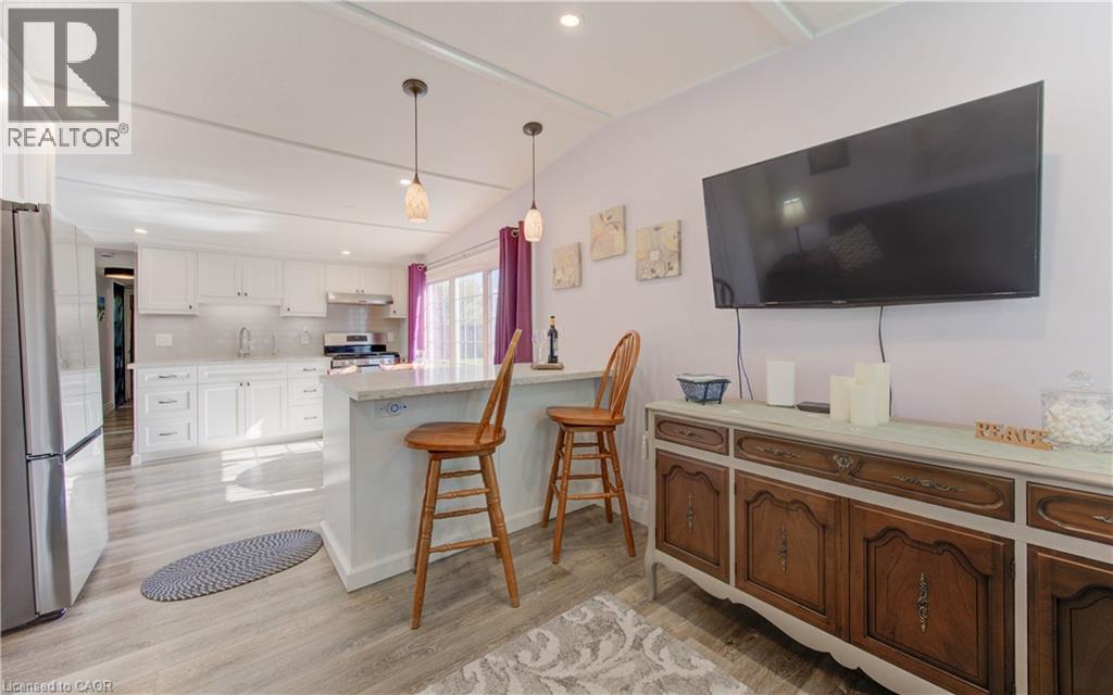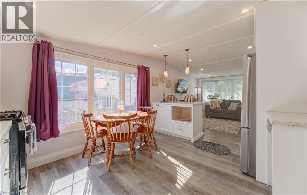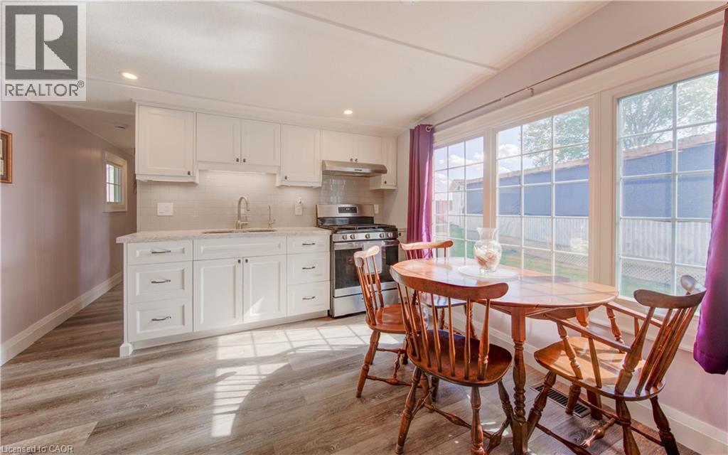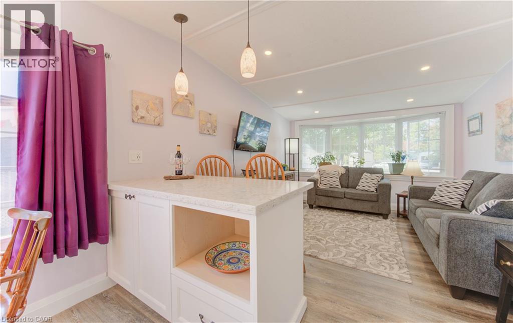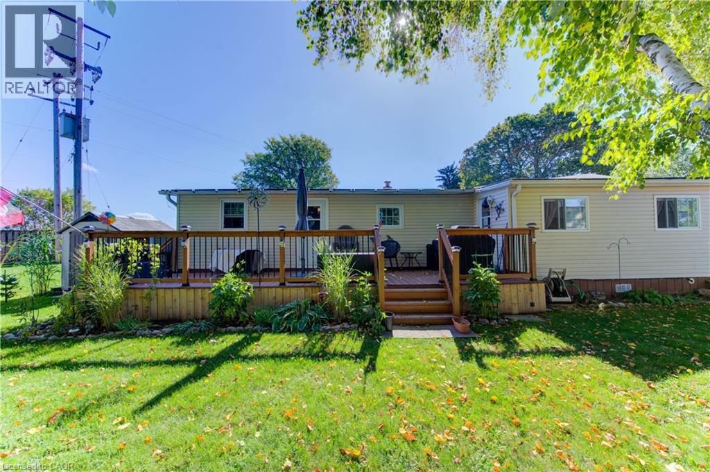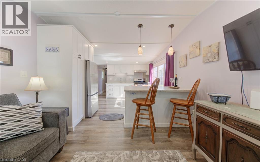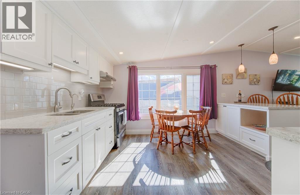 Incredible opportunity to live close to nature, in this updated and cozy home. Perfect for anyone that wants outdoor space and affordable year-round living. This lovely 2 Bedroom, fully winterized mobile home offers all the comforts and so much more than condo living. With parking for 2 and a gorgeous 10 x 30 deck (2 yrs) to relax on, you CAN have it all. Upgrades since 2021 include renovated open concept kitchen and living room, trim, pot lights, laundry and bathroom with double sink and walk-in glass shower. The kitchen boasts gas stove, tile backsplash, granite counters and breakfast bar. The living room is beautiful with Bay windows overlooking the shady front yard and gardens. With full-size washer/dryer, and a primary bedroom fully customized closet organizers and built ins, there is ample storage. The yard has multiple sheds for storing belongings and a wonderful community surrounding it. (front door 2024) roof (May 2025) Reverse Osmosis (R.O.) Water System installed Land lease fee: $775.00/mnth + common element fee $45.63/mnth payable to Park Close to expressway for easy commuting Minutes from the vibrant St. Jacobs Market and local amenities (id:64974)