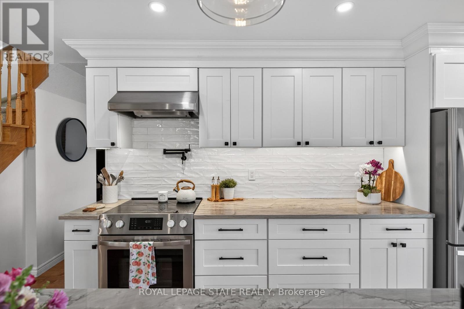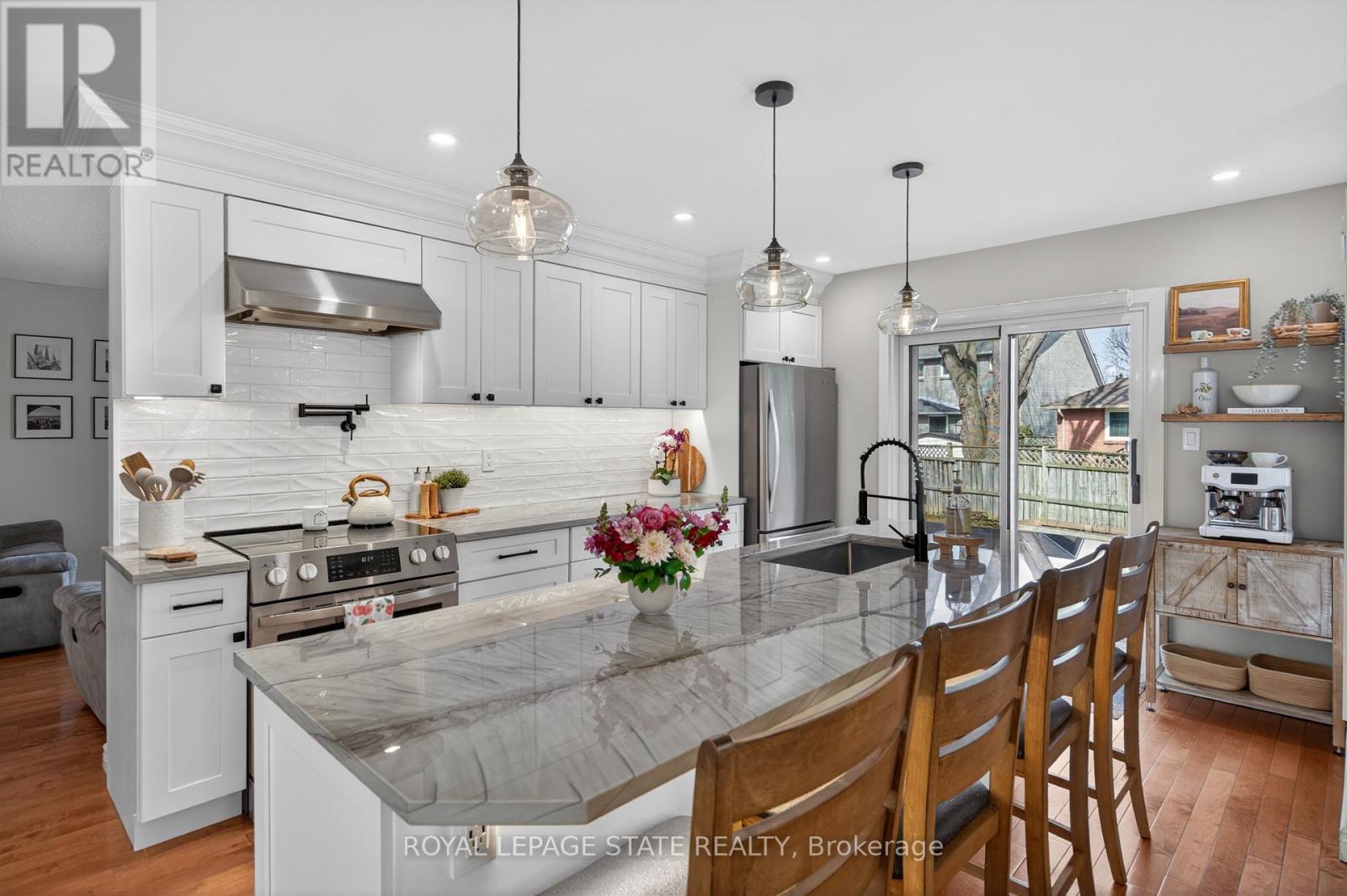 Welcome to this inviting family home offering 1,523 sq ft above grade plus a fully fin bsmnt, set on a pie-shaped lot. With 3 bdrms & 2.5 baths, this home offers an exceptional blend of comfort, function & lifestyle; ideal for growing families seeking both space and convenience. Set on a quiet, dead-end court, the home enjoys a serene, private setting with a spacious yard, along with a 1.5-car garage & 4 driveway spaces, providing ample parking for busy households and guests. Inside, enjoy a bright, open-concept main flr designed for everyday living & entertaining. The renovated kitch (2022) is the heart of the home, seamlessly flowing into the bright front living rm, anchored by large windows, and into the dining area, creating an ideal space for gatherings. The kitch is beautifully appointed with white cab, pot lighting, S/S app (fridge '22, dishwasher '22, stove '24), stunning quartzite countertops & island, a stylish backsplash & a convenient pot filler by the stove. A renovated 2pc bath (2022) & a cozy family rm with a charming wood-burning FP complete the main lvl. Upstairs feat 3 well-sized bdrms, including a spacious primary retreat feat a 4pc ensuite with a shower/tub combo, along with an updated & stylish 5pc main bath (2025) with a double vanity & shower/tub combo designed for busy family living. The fully fin bsmnt extends the living space with a large rec rm, a separate rm currently used as a home gym & a generous laundry/storage area with stacked washer & dryer (2022). Step outside to the expansive pie-shaped backyard offering both green space & patio, perfect for kids, pets & summer entertaining. Significant mechanical upd provide peace of mind, incl furnace (2025), hot water tank (2025), A/C unit (2026), windows (2026) & more. Ideally located in Burlington's sought-after Maple neighbourhood, just minutes to Mapleview Shopping Centre, Joseph Brant Hospital, downtown & the Burlington Waterfront; close to parks, shopping, dining & commuter routes. (id:64974)
