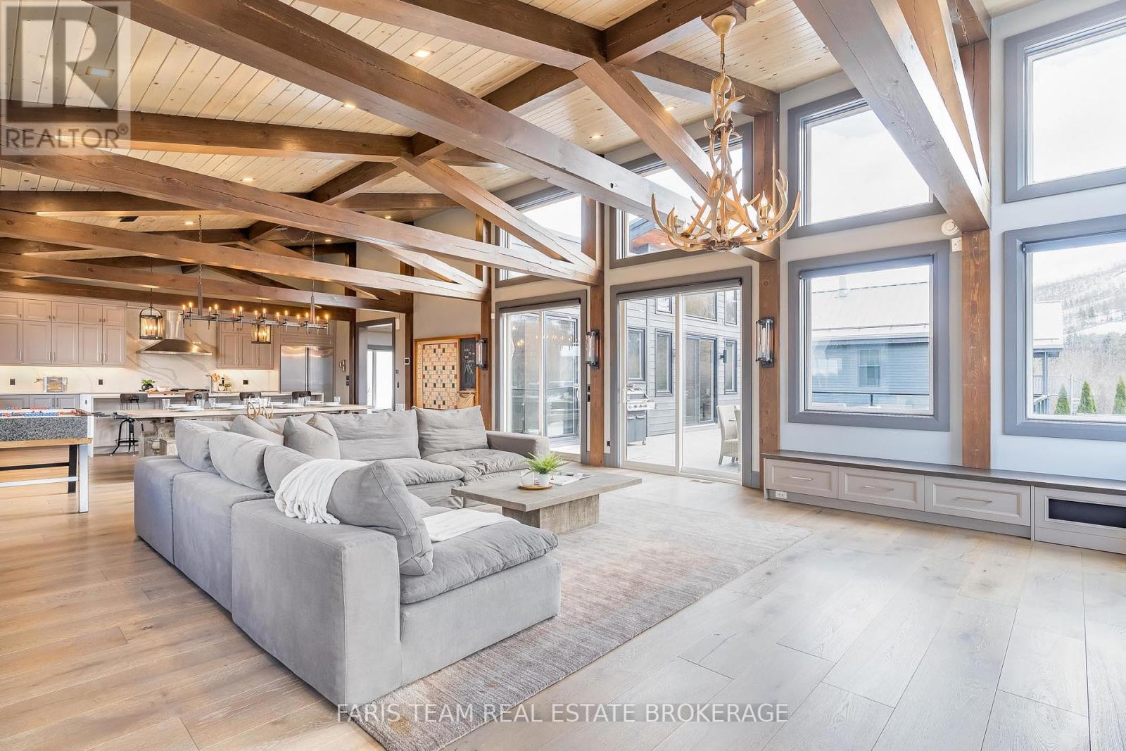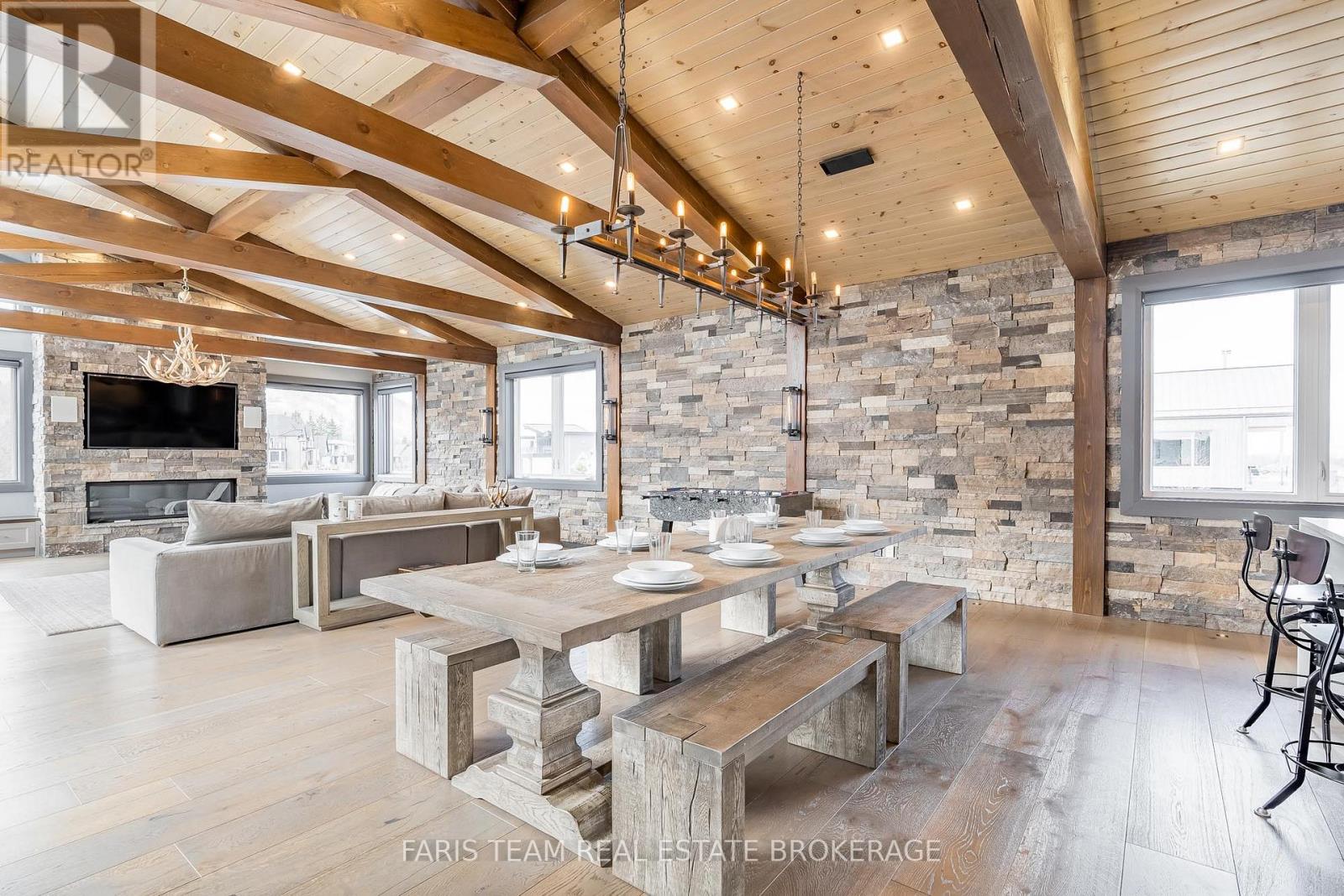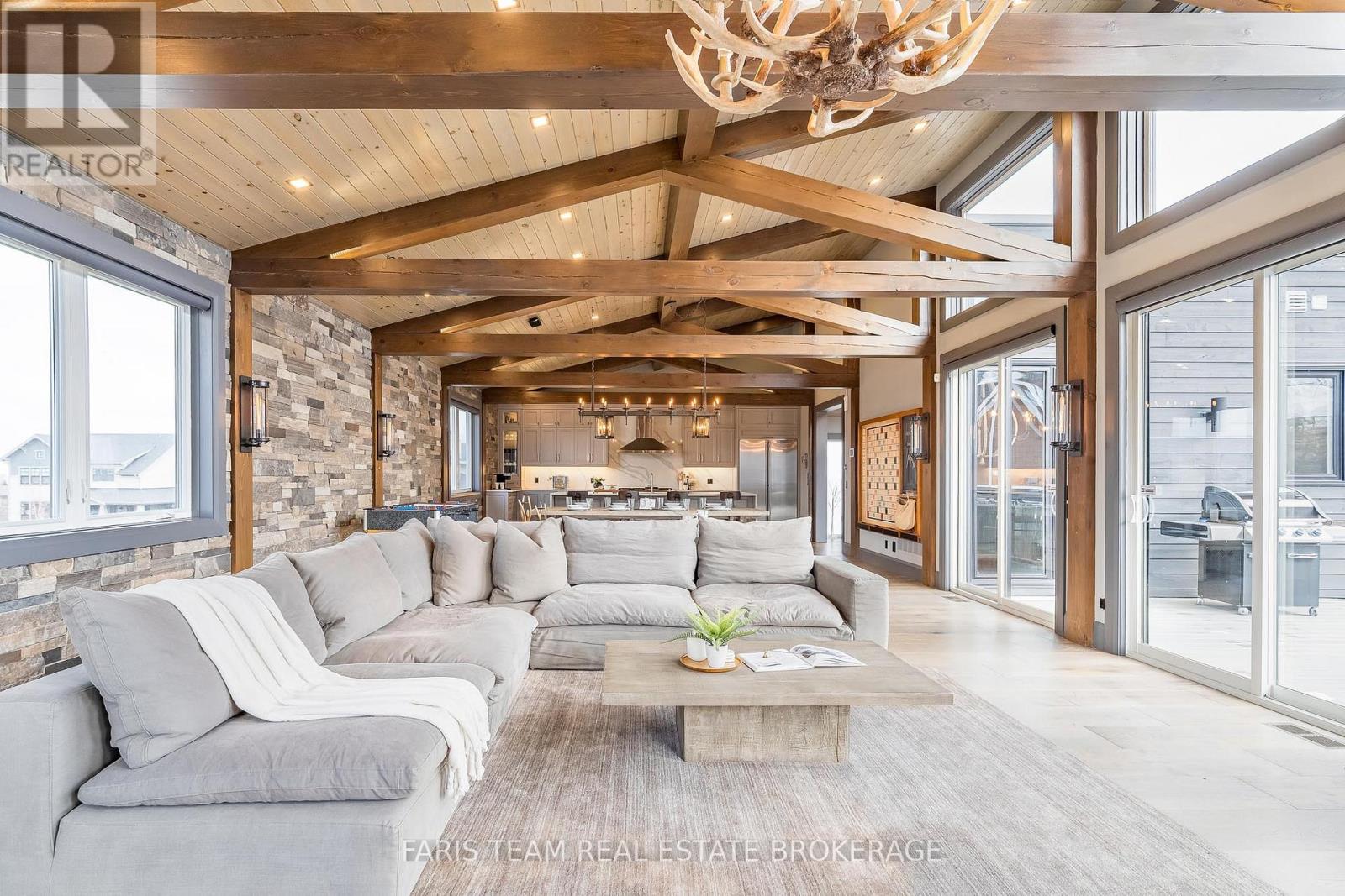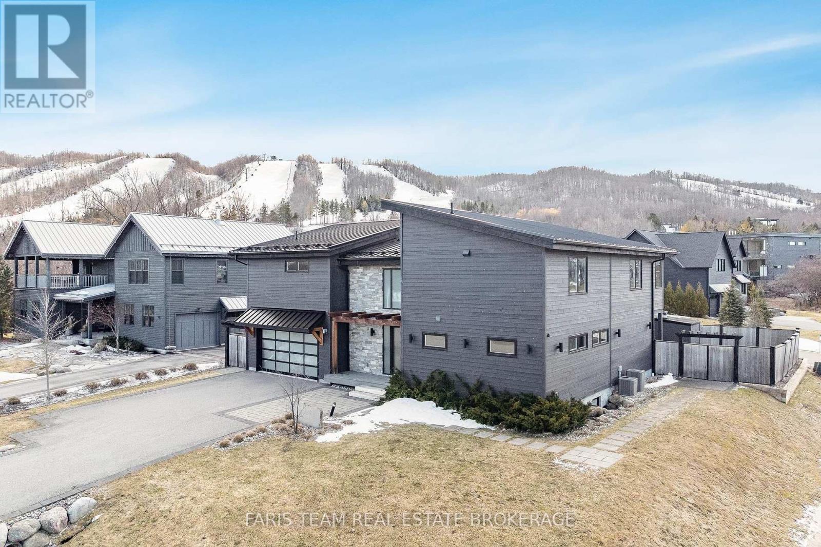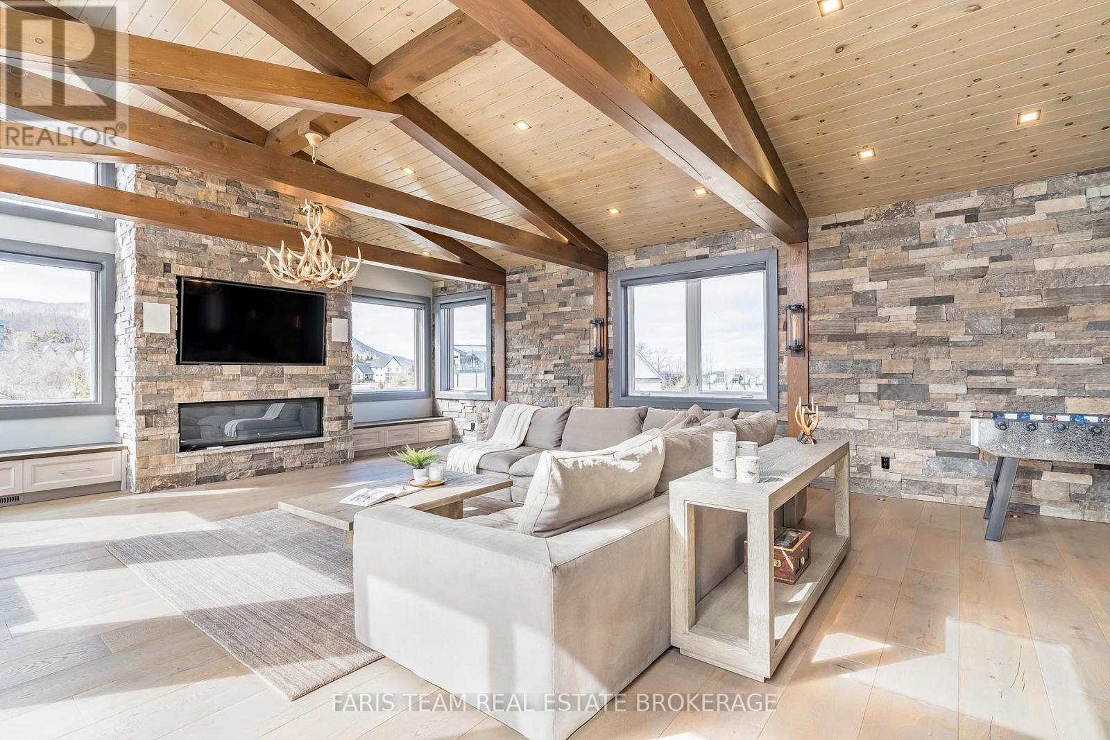 Top 5 Reasons You Will Love This Home: 1) Steps from Alpine and Craigleith Ski Clubs, this architecturally distinctive custom Nipissing Ridge chalet delivers the ultimate four-season Blue Mountain lifestyle, combining refined design, advanced smart-home technology, and resort-style outdoor living, designed with a reverse floor plan to capture ski hill views, this impressive residence offers five bedrooms and four-and-a-half bathrooms 2) Distinctive architectural details elevate the interior, including dramatic vaulted ceilings, exposed beam trusses, reclaimed wood accent walls, and a striking floor-to-ceiling stone fireplace anchoring the main living space, along with wide-plank custom hardwood floors, quartz countertops, solid wood doors and trim, televisions integrated into select showers, wall-hung toilets, and subtle in-floor lighting enhancing the refined design 3) Engineered with a level of construction detail rarely found in recreational properties, the home features a whole-home Control4 automation system providing seamless control of lighting, security, cameras, blinds, and climate, complemented by a professionally designed Dolby Atmos theatre delivering a true private cinema experience 4) Comfort and efficiency are enhanced by radiant in-floor heating in tiled areas and the garage slab, dual furnaces and air conditioning systems designed to minimize bulkheads, hot water on demand with backup tanks, and extensive sound insulation throughout the home 5) Outdoor living is equally impressive with a 37'x14' heated saltwater fibreglass pool, Bullfrog STIL hot tub, wood sauna, and covered entertainment area with natural gas fire feature and outdoor television, plus professionally landscaped grounds with irrigation and a no-maintenance steel roof complete this private four-season retreat just minutes from skiing, Georgian Bay, and Blue Mountain Village. 3,143 above grade sq.ft. plus a finished basement. (id:64974)
