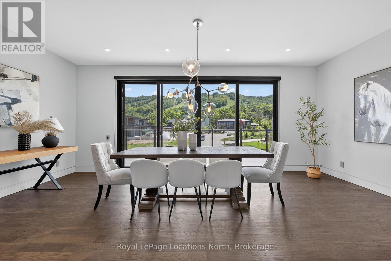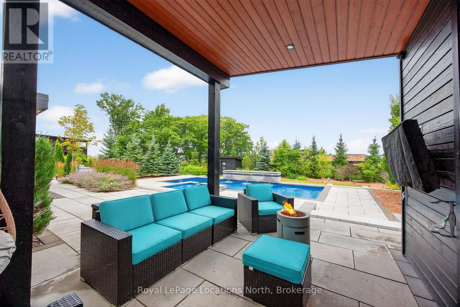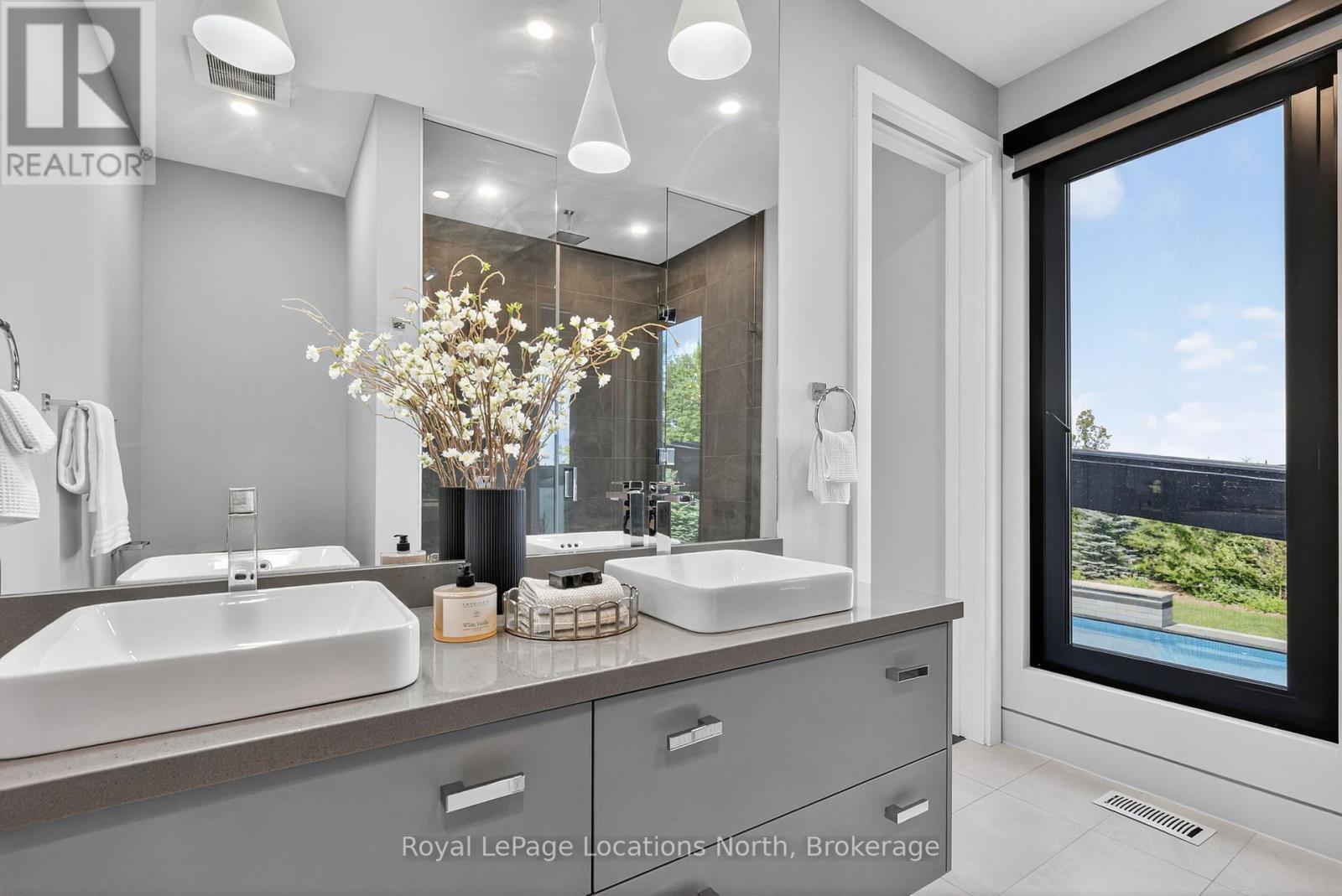 Discover the epitome of luxury living at this exquisite 5-bedroom, 3.5-bath custom-built home in Nipissing Ridge III, Blue Mountains. Boasting approximately 3,800 sq. ft. of sophisticated living space, this property offers unparalleled panoramic views of the Escarpment, ski hills, and Georgian Bay. Experience seamless indoor-outdoor living with over 1,200 sq. ft. of outdoor porcelain tile terraces, indoor and outdoor speakers, a classic cabana featuring an outdoor kitchen, and a stunning saltwater pool with a waterfall. The gourmet kitchen, featuring high-end appliances and an expansive island, is perfectly positioned to capture magnificent views. The main floor has a majestic foyer and has three bedrooms and two bathrooms. The primary bedroom overlooks the beautifully landscaped backyard and pool. It has a spa inspired 4 pce ensuite and a large walk in closet. The two additional bedrooms are spacious, with views of the ski hills, and share a 5-piece bathroom. The lower level offers in-floor heating, a spacious mudroom, two guest bedrooms, a three-piece bathroom, and a family room with a wet bar and walkout. Other features are a spacious 2.5 car garage with direct access to 1000sqft of heated storage, indoor and outdoor speakers throughout, top of the line heat pump and air steam humidifier, a grocery lift, a commercial grade Ubiquiti home network to keep your electronics connected and for your convenience a grocery lift connecting the mudroom to the kitchen. This sought-after location provides direct access to Craigleith/Alpine Ski Clubs and Nipissing Ridge Tennis Courts. Enjoy an active lifestyle with proximity to Blue Mountain skiing, fine dining, select shops, private ski clubs, the Georgian Trail for hiking and biking, and numerous exclusive and public golf courses. This is more than a home; it's a lifestyle between the escarpment and Georgian Bay. (id:64974)