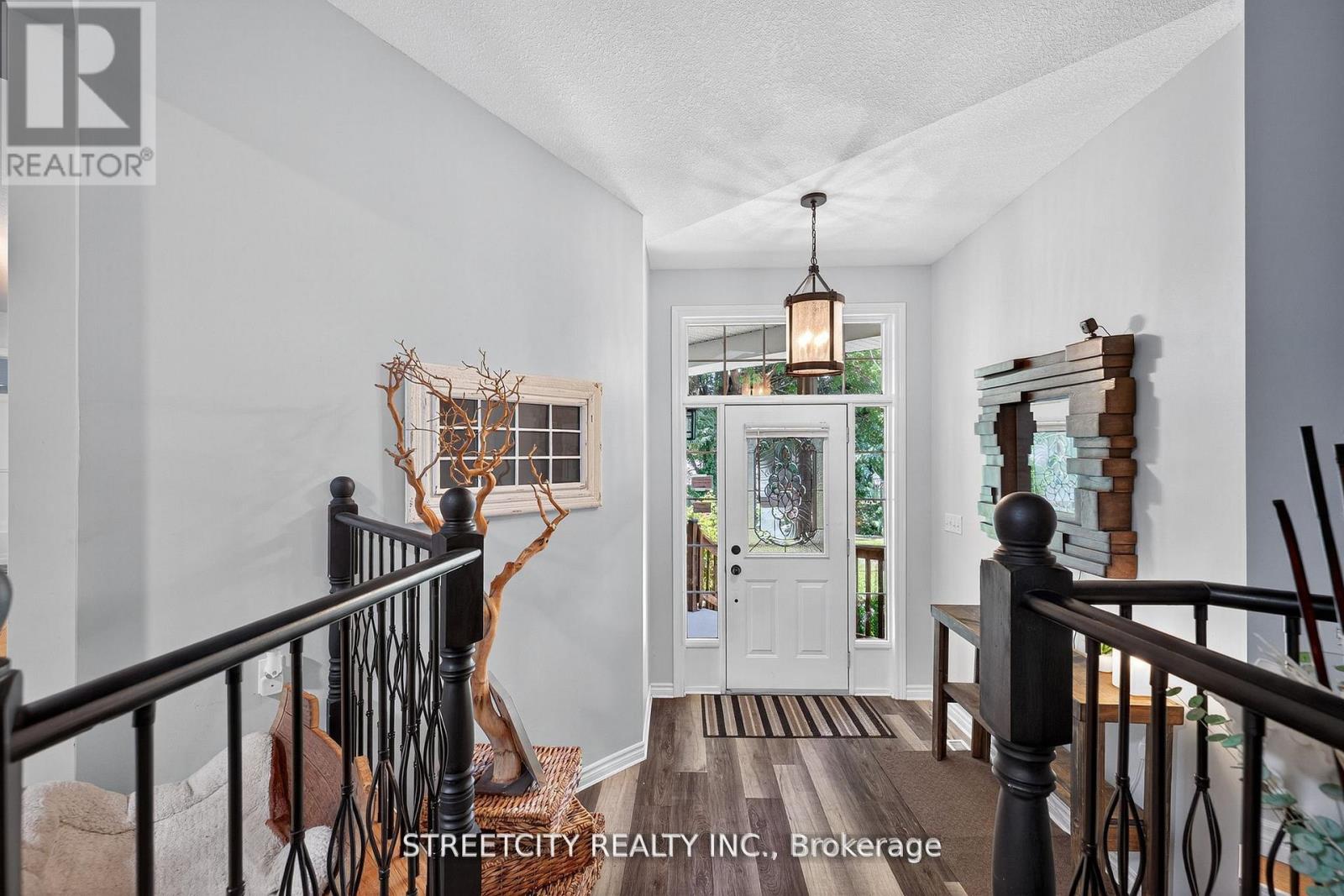 Where Urban Sophistication Meets Secluded Country Prestige. Tucked within a private, tree-lined setting just minutes from Highway 401 and the airport, this exceptional estate offers a rare blend of convenience and tranquility-ideal for those who value both privacy and accessibility. A true standout is the extraordinary three-car garage, thoughtfully designed for automotive enthusiasts or skilled craftsmen. Featuring oversized doors, soaring ceilings suitable for a hoist, a mezzanine for added storage, and a private staircase to the fully finished lower level, it's far more than a garage-it's a rare, purpose-built workspace. The outdoor living experience is equally refined, with lush landscaping, multiple decks, a sparkling pool, serene koi pond, and intimate patios that create a private oasis for relaxation and entertaining. Inside, over 3,500 sq. ft. of finished living space showcases warm, elegant design. Highlights include custom wood beam fireplace mantels, stylish accent walls, and a barn-style door opening to a chef-inspired kitchen with premium appliances and generous workspace. The primary suite offers a luxurious retreat with a cozy fireplace and spacious layout. Three full bathrooms and a powder room provide both comfort and function. The fully finished lower level features a versatile in-law suite with in-floor heating, accessible from the main level, garage, or a private entrance-ideal for multi-generational living or income potential. This is a rare offering-where refined living, exceptional functionality, and peaceful surroundings come together seamlessly. (id:64974)