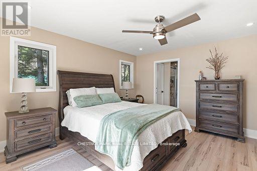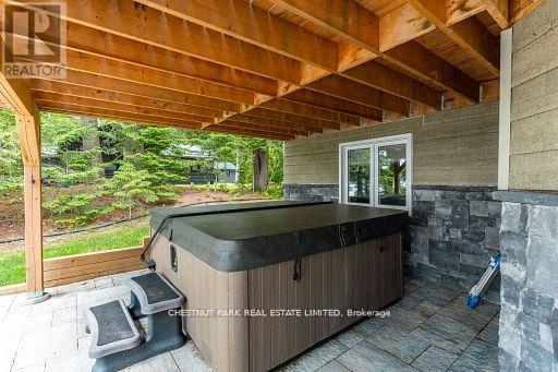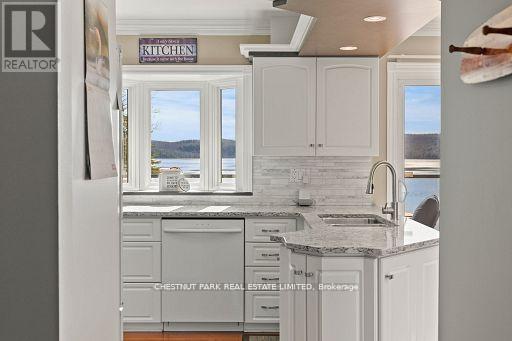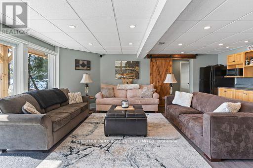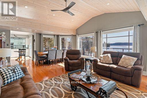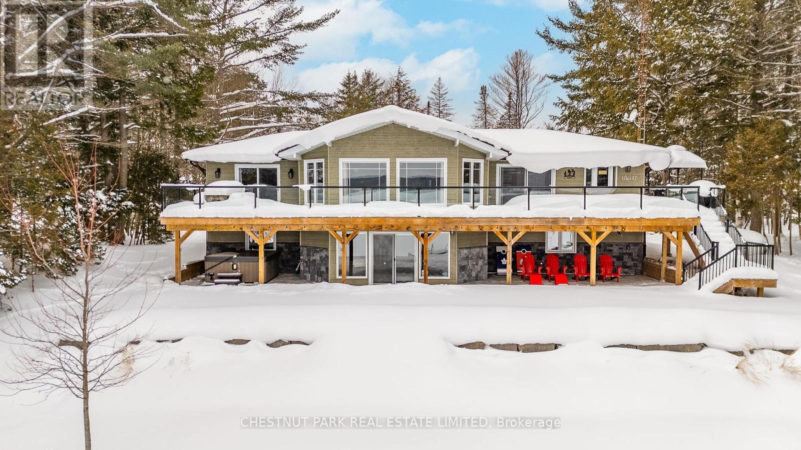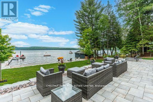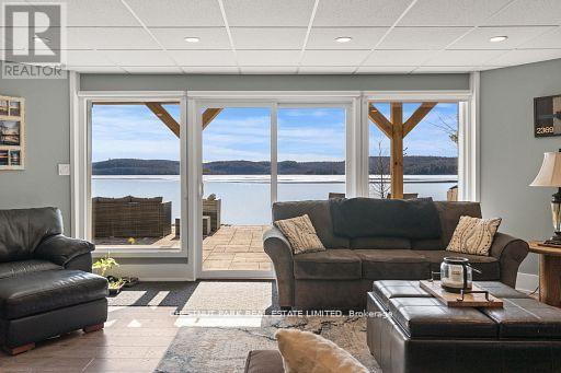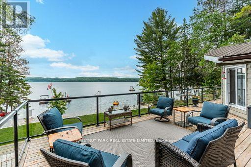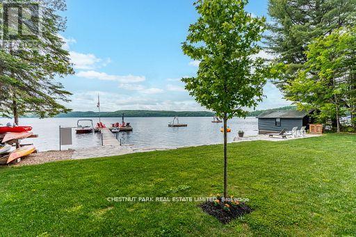 This refined Haliburton Lake waterfront residence offers a rare combination of luxury, privacy, and four-season recreation on one of the area's most prestigious lakes. Ideal for year-round living or an elevated cottage retreat, the home features 2,850 sq. ft. of well-designed living space on a level, treed 1.1-acre lot with 100 feet of prime sandy shoreline and clear, deep water. The shoreline offers both shallow entry and deep water off the dock-perfect for swimming, boating, and fishing-while wide lake views and southeast-facing exposure provide excellent natural light and tranquil sunrise vistas. Multiple walkouts connect to a 60-foot lakeside patio, creating seamless indoor-outdoor living ideal for entertaining. Inside, the 4+1 bedroom, 3 bathroom layout is defined by cathedral ceilings, hardwood floors, two propane fireplaces, and an open-concept kitchen and living area designed for both everyday comfort and hosting. The property has extensive landscaping with exceptional perennial gardens, enhancing privacy and curb appeal while complementing the natural setting. Additional features include a fitness/games room and a 3-car garage, with one insulated and heated bay ideal for vehicles and recreational equipment. Well suited for winter use, the home offers easy year-round access and proximity to extensive four-season activities including snowmobiling, ice fishing, skating, cross-country skiing, and downhill skiing at Sir Sam's Ski / Ride, just 20 minutes away. Modern comforts include central air, central vacuum, a high-efficiency propane furnace, and a full backup generator. A distinguished offering in Haliburton real estate, this waterfront property delivers understated luxury and year-round enjoyment in a premier lakefront setting. (id:64974)