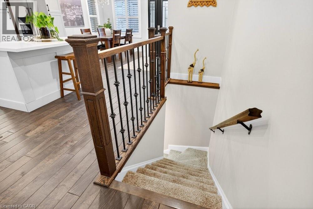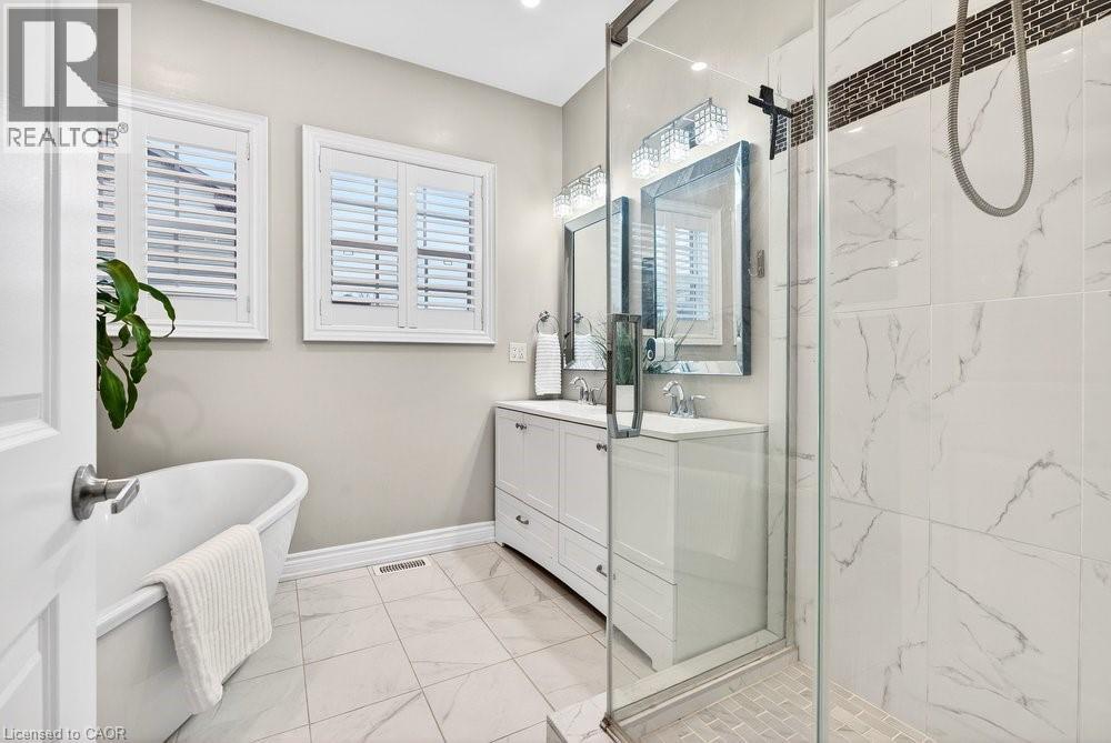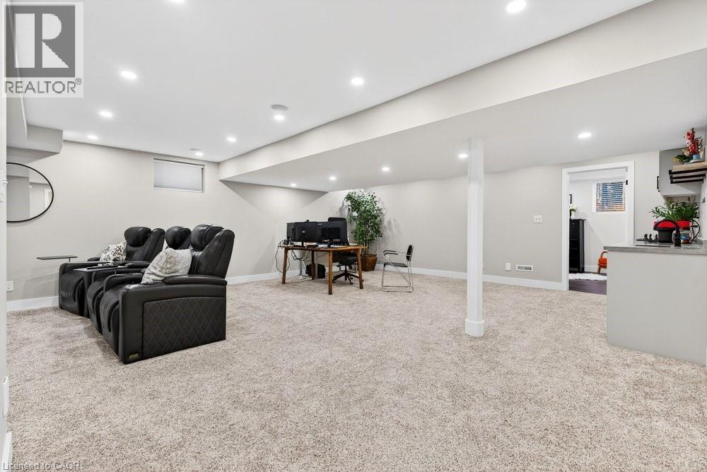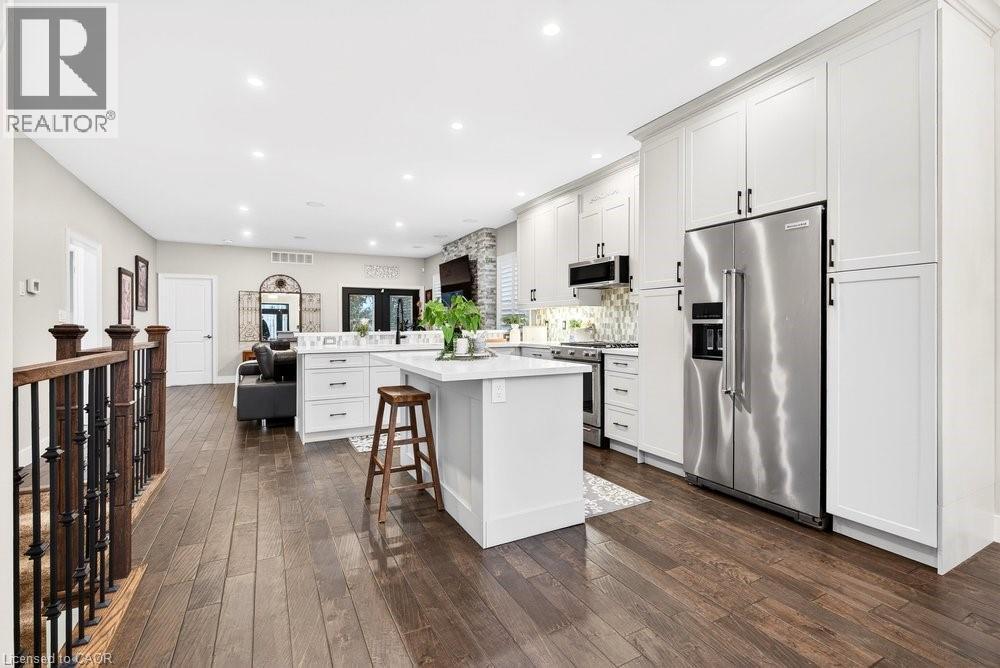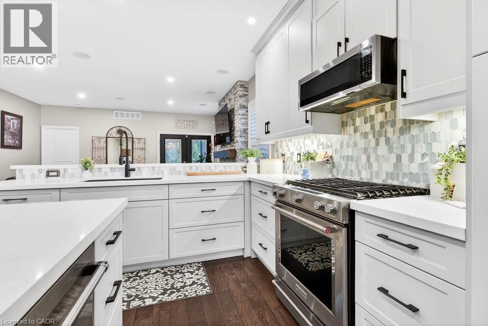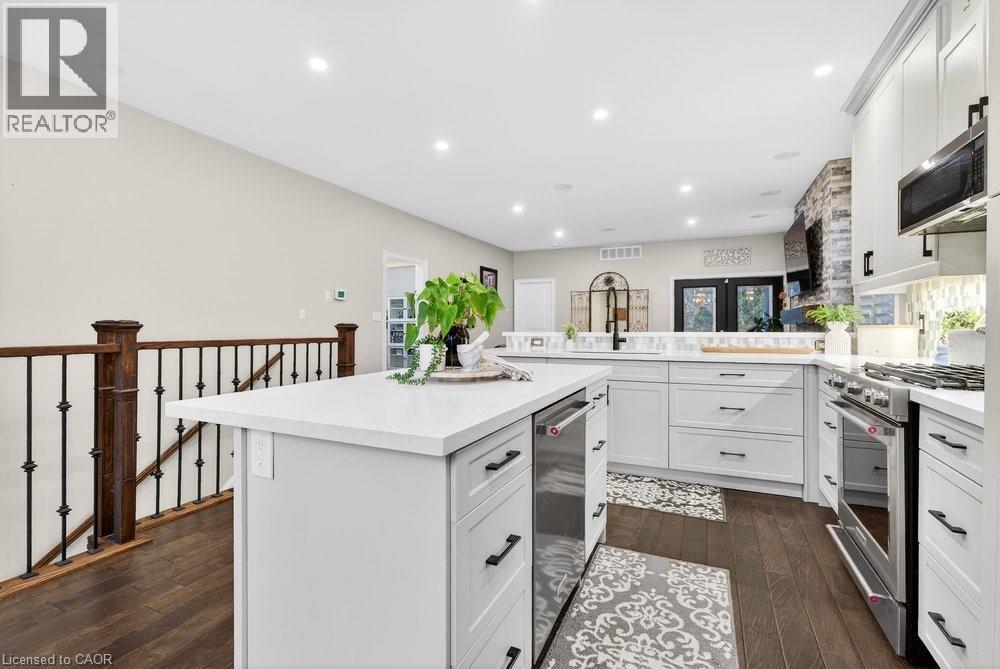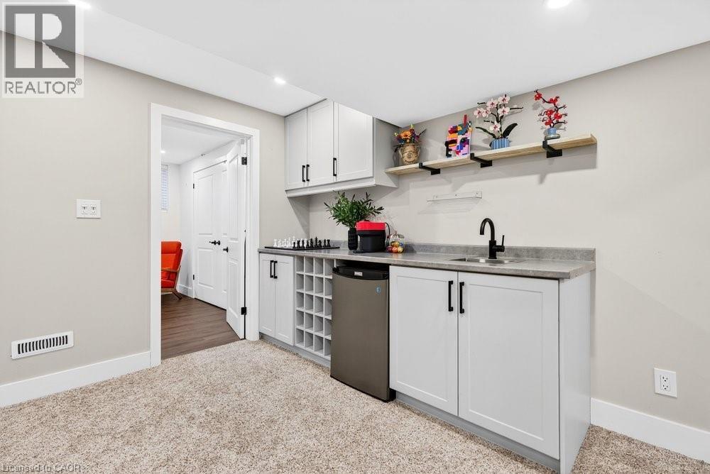 Impeccable 3+1 BR, 3 bath bungalow offering over 1400 sq ft plus a fully finished basement this 8 year old Mountainview built home located on the west side of Welland with easy access to Webber Rd for the commuter, is not to be missed! Gorgeous finishes throughout including the custom kitchen with extended height & pantry cabinets, quartz counters, & island with breakfast bar; engineered hardwood floors throughout the main level; 9' main floor ceilings; primary with a beautiful ensuite that features a stand alone soaker tub, separate shower & double sinks; the primary also hosts a walk out to a private deck that's perfect for your morning coffee or nightcap. The lower level rivals the main floor finishings with recent carpet; wet bar/kitchenette; large bedroom; family room built-ins flanking the shiplap surround for the electric fireplace; built in speakers; tons of pot lights and a laundry room that might let you actually enjoy doing laundry! The exterior does not disappoint with the brick and stone façade, concrete double drive, inground sprinklers, the back offers a tiered deck that leads to the hot tub and lower stamped concrete patio in the fully fenced backyard. This is one to truly experience live! (id:64974)