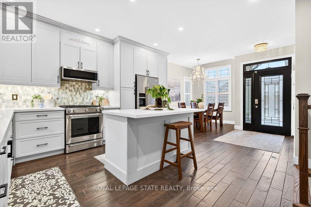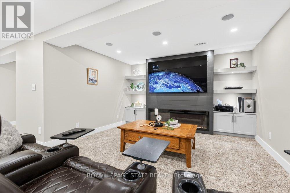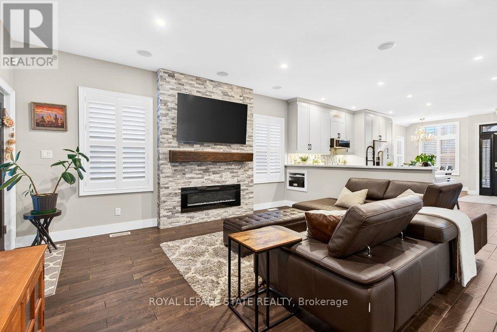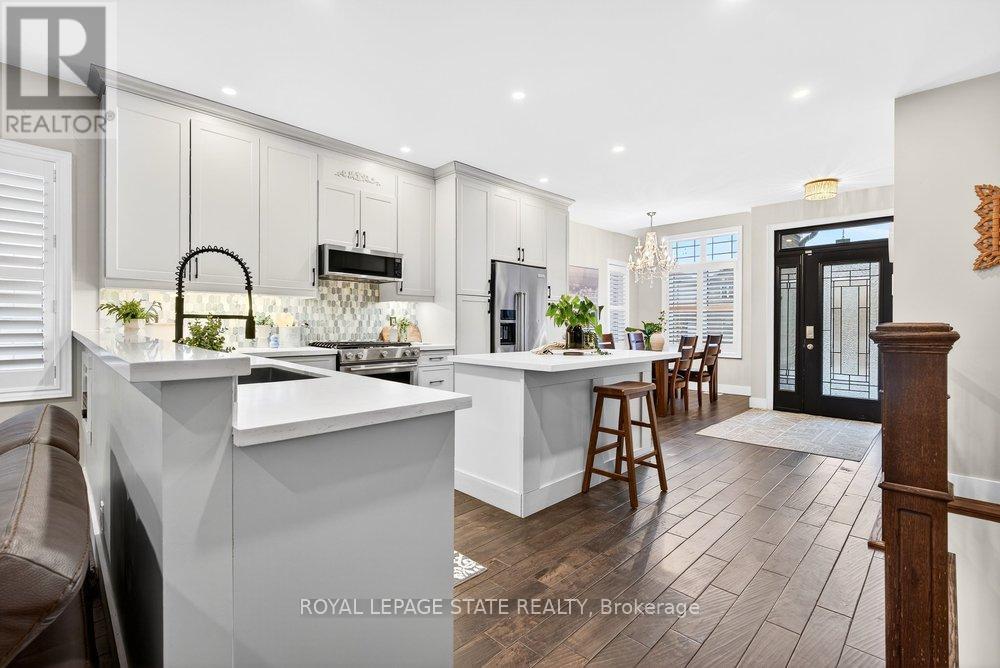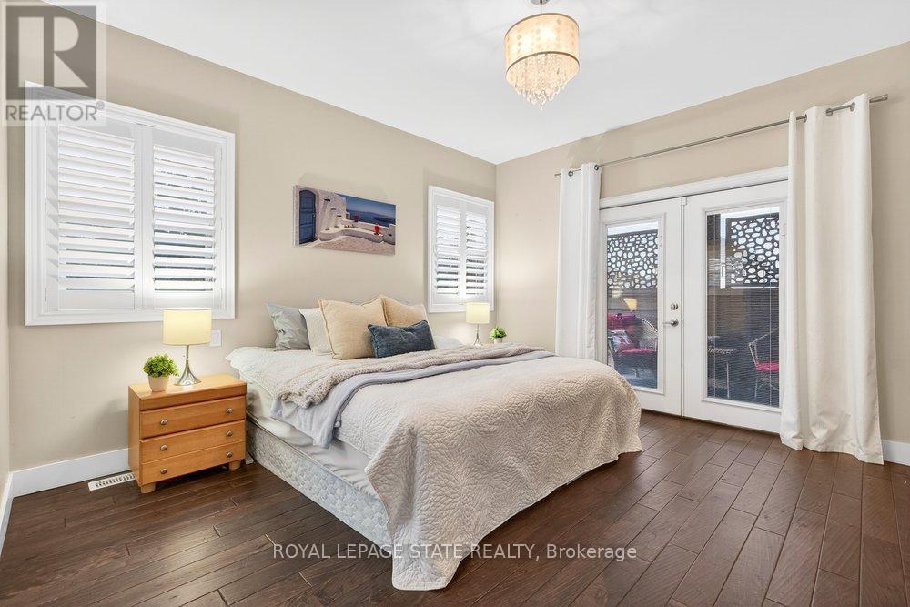 Impeccable 3+1 BR, 3 bath bungalow offering over 1400 sq ft plus a fully finished basement this 8 year old Mountainview built home located on the west side of Welland with easy access to Webber Rd for the commuter, is not to be missed! Gorgeous finishes throughout including the custom kitchen with extended height & pantry cabinets, quartz counters, & island with breakfast bar; engineered hardwood floors throughout the main level; 9' main floor ceilings; primary with a beautiful ensuite that features a stand alone soaker tub, separate shower & double sinks; the primary also hosts a walk out to a private deck that's perfect for your morning coffee or nightcap. The lower level rivals the main floor finishings with recent carpet; wet bar/kitchenette; large bedroom; family room built-ins flanking the shiplap surround for the electric fireplace; built in speakers; tons of pot lights and a laundry room that might let you actually enjoy doing laundry! The exterior does not disappoint with the brick and stone façade, concrete double drive, inground sprinklers, the back offers a tiered deck that leads to the hot tub and lower stamped concrete patio in the fully fenced backyard. This is one to truly experience live! (id:64974)