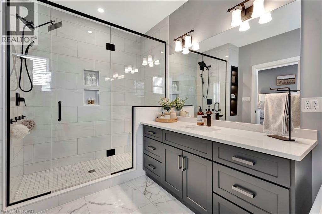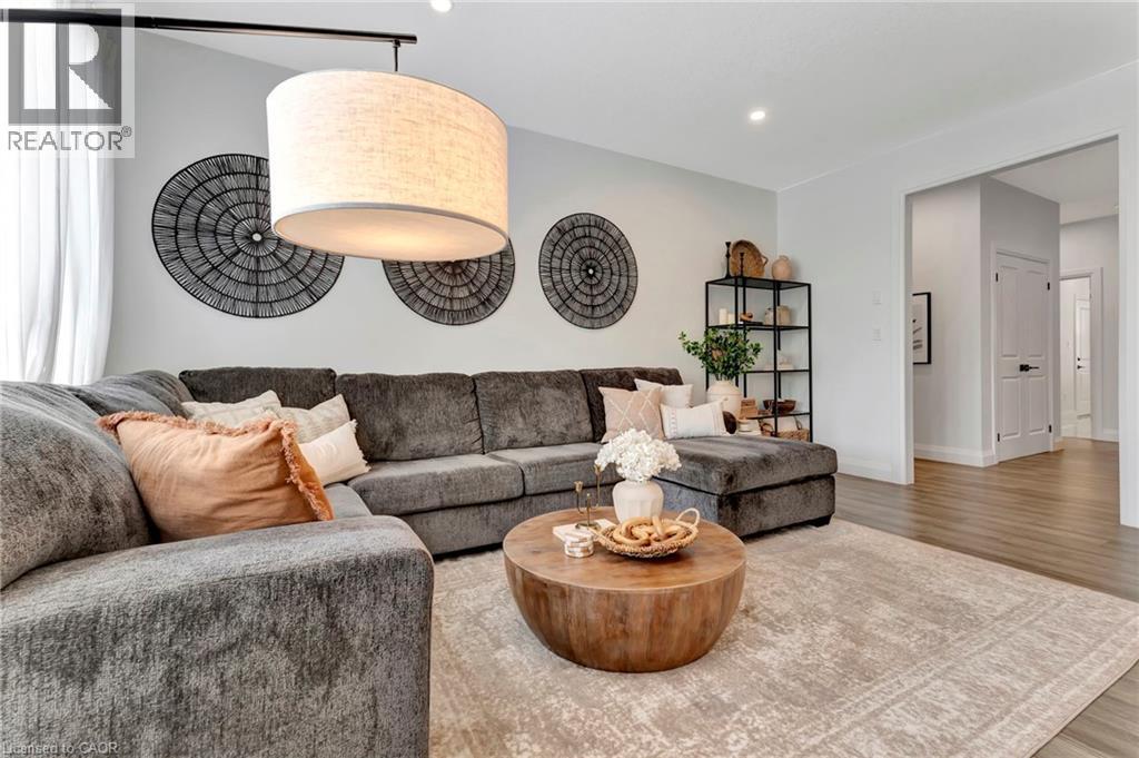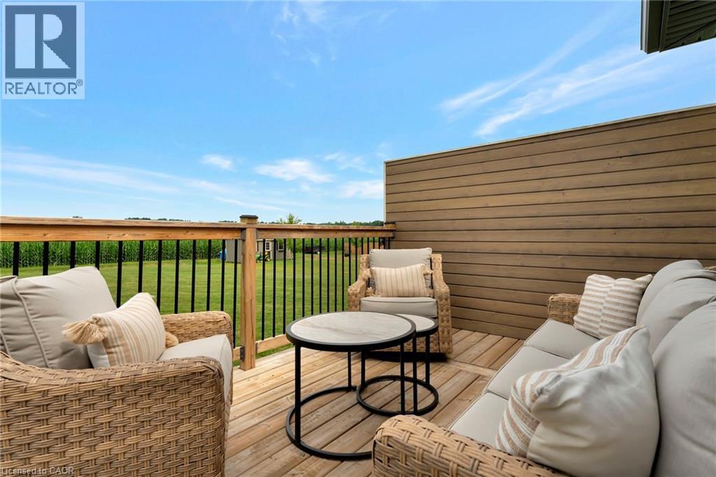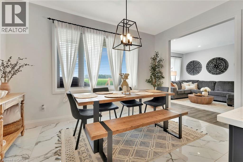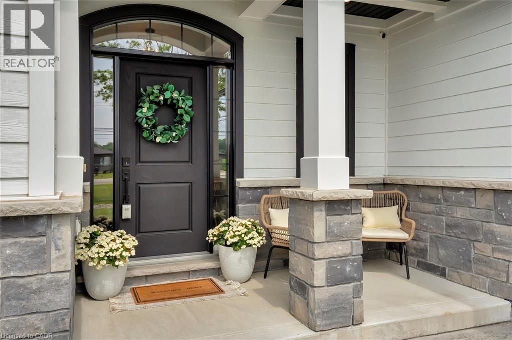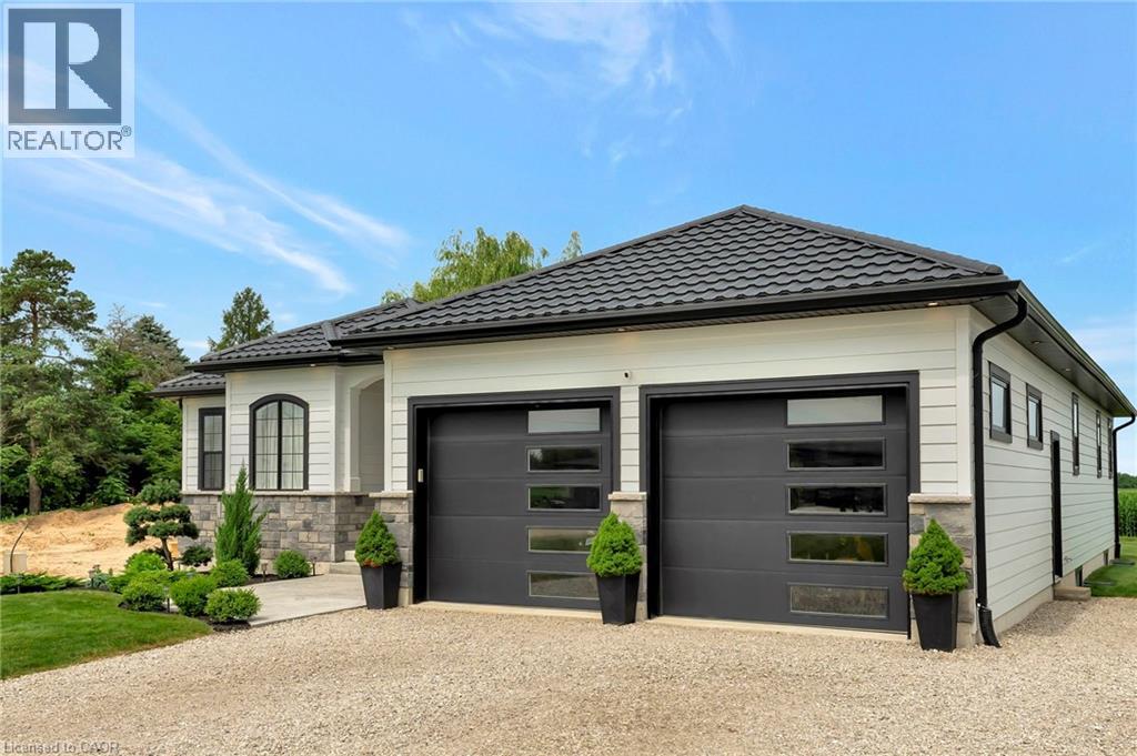 This stunning 2,141 sq. ft. bungalow is set on a picturesque lot and offers exceptional curb appeal with a double-car garage, elegant stone accents, metal roof, and sleek black trim. Beautiful landscaping and a wide concrete walkway welcome you into a thoughtfully designed home featuring soaring 9-foot ceilings and upscale finishes throughout. The gourmet kitchen is a showstopper, complete with rich dark cabinetry extending to the ceiling, striking high-contrast quartz countertops, upgraded fixtures, and tiled floors and backsplash. The oversized island is ideal for casual dining and entertaining, while the adjoining dinette offers a more formal dining space with walk-out access to the raised deck-perfect for indoor/outdoor living and enjoying scenic views. The living room invites you to unwind by the cozy stone corner gas fireplace. Additional main-floor conveniences include a stylish 2-piece powder room and a separate laundry room with custom cabinetry and quartz counters. The primary bedroom serves as a private retreat, featuring a luxurious 4-piece ensuite with a stunning glass shower and a relaxing soaker tub. Two additional bedrooms offer generous space for family, guests, or a home office, and are supported by a full 4-piece bathroom. The expansive double-car garage provides ample room for vehicles and storage, while the single-wide driveway expands to a triple-wide apron, offering abundant parking. The unfinished basement includes a finished staircase, bathroom rough-in, and deep windows-an excellent opportunity to create additional living space tailored to your needs. Ideally located close to schools, shopping, and everyday amenities, this exceptional home is also just 30 minutes from Amazon, Toyota, and Volkswagen's Battery Plant-making it a perfect blend of modern style, functionality, and convenient commuting. (id:64974)