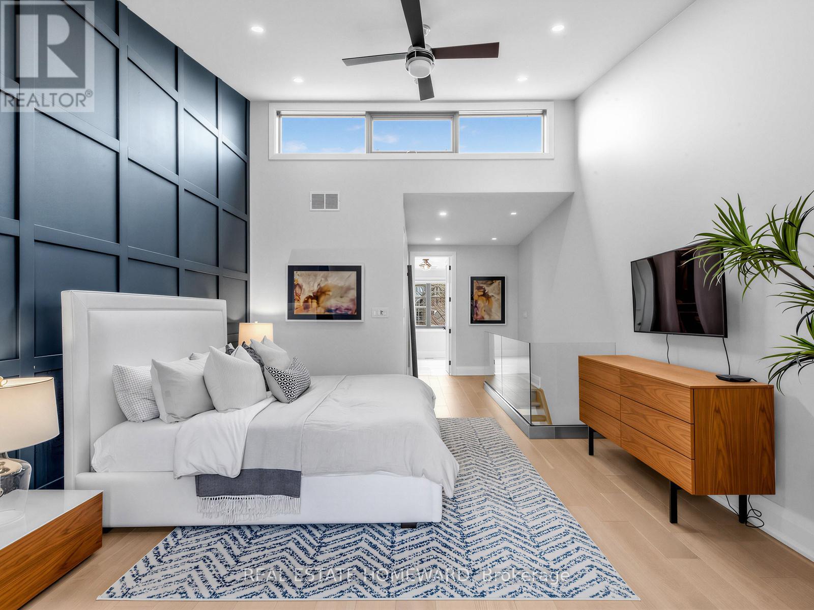 Welcome to this stunning, design-forward home in the heart of Leslieville, offering exceptional finishes and a thoughtfully curated layout. The bright, open-concept main floor features soaring 10' ceilings, wide-plank white oak flooring, and a sleek electric fireplace set within a marble surround. Large east and west-facing window fills the space with natural light, while the modern staircase with glass railings adds architectural elegance. The chef-inspired kitchen is both stylish and functional, showcasing custom cabinetry with extra-tall uppers, Caesarstone countertops, and a porcelain herringbone backsplash. Premium stainless steel appliances, including a gas range, French-door fridge, wine fridge, and integrated dishwasher, elevate the space. A large sliding door opens to the beautifully landscaped backyard-perfect for entertaining. Upstairs, spacious bedrooms offer 9' ceilings, solid wood doors, and custom closet organizers. The primary retreat is a true standout, featuring dramatic vaulted ceilings and a walk-in closet. The spa-like ensuite includes a glass shower with rain head, floating double vanity, and designer fixtures. The exterior is equally impressive with professionally landscaped front and backyards, stone walkways, and a lower patio area in the backyard ideal for relaxing or hosting. Additional highlights include composite front decking with glass railings, backyard deck with gas BBQ line, and a custom carport with garage access. A rare blend of modern design, luxury finishes, and prime Leslieville living-this spacious home is truly move-in ready. (id:64974)