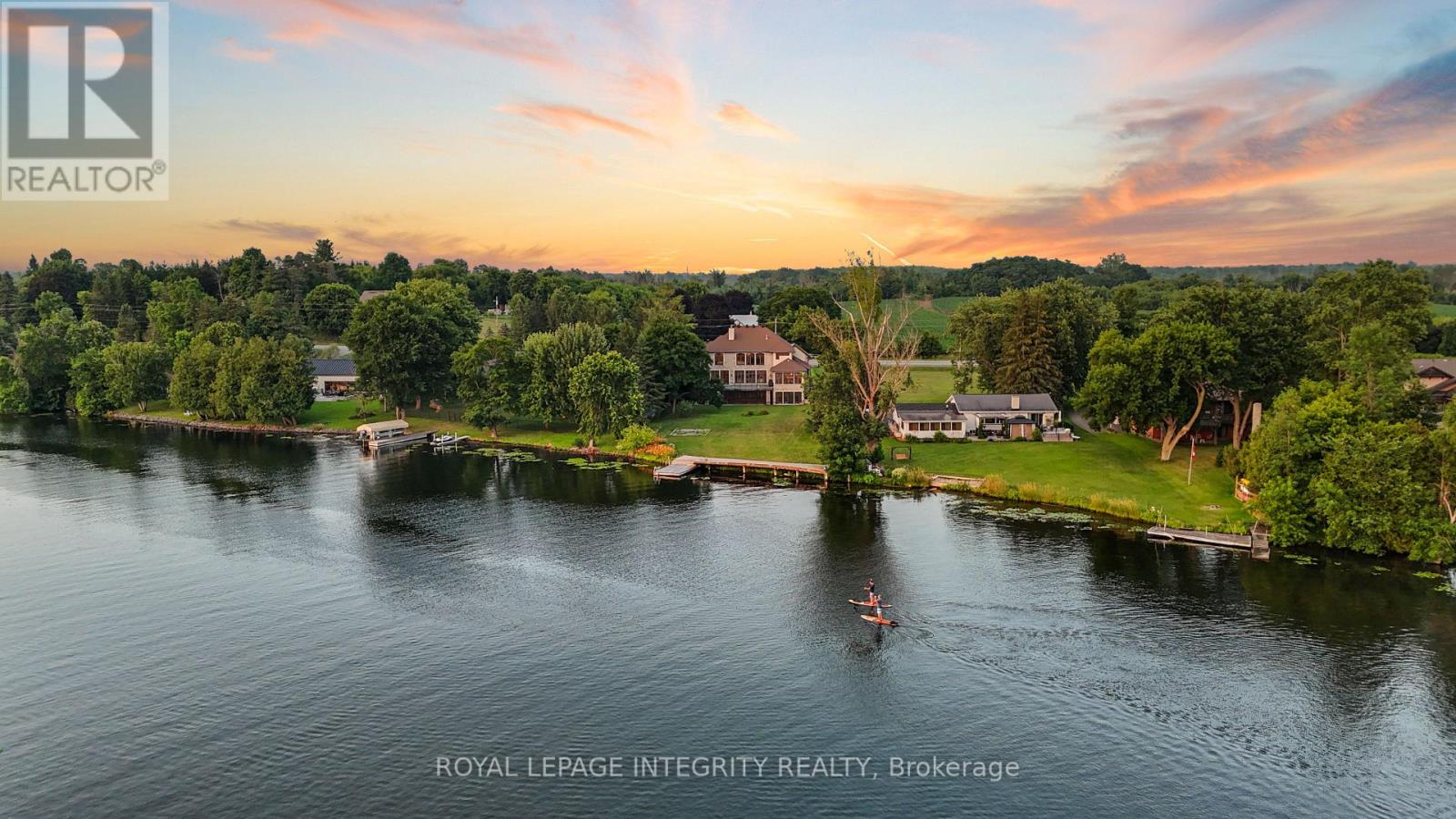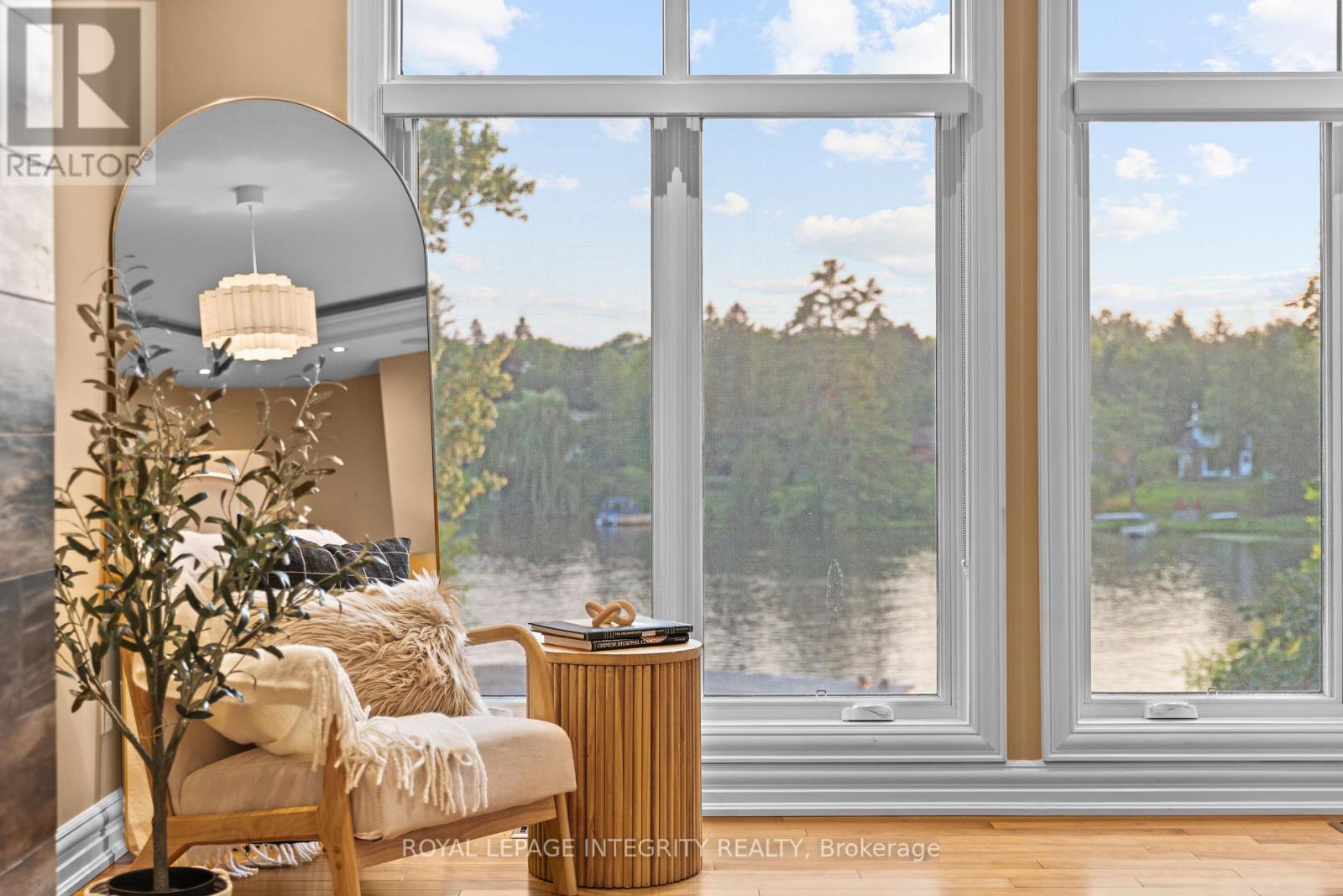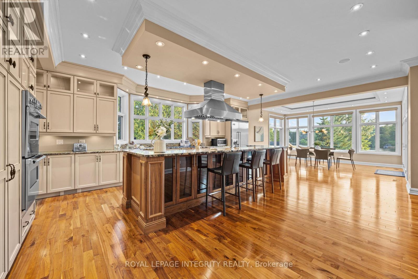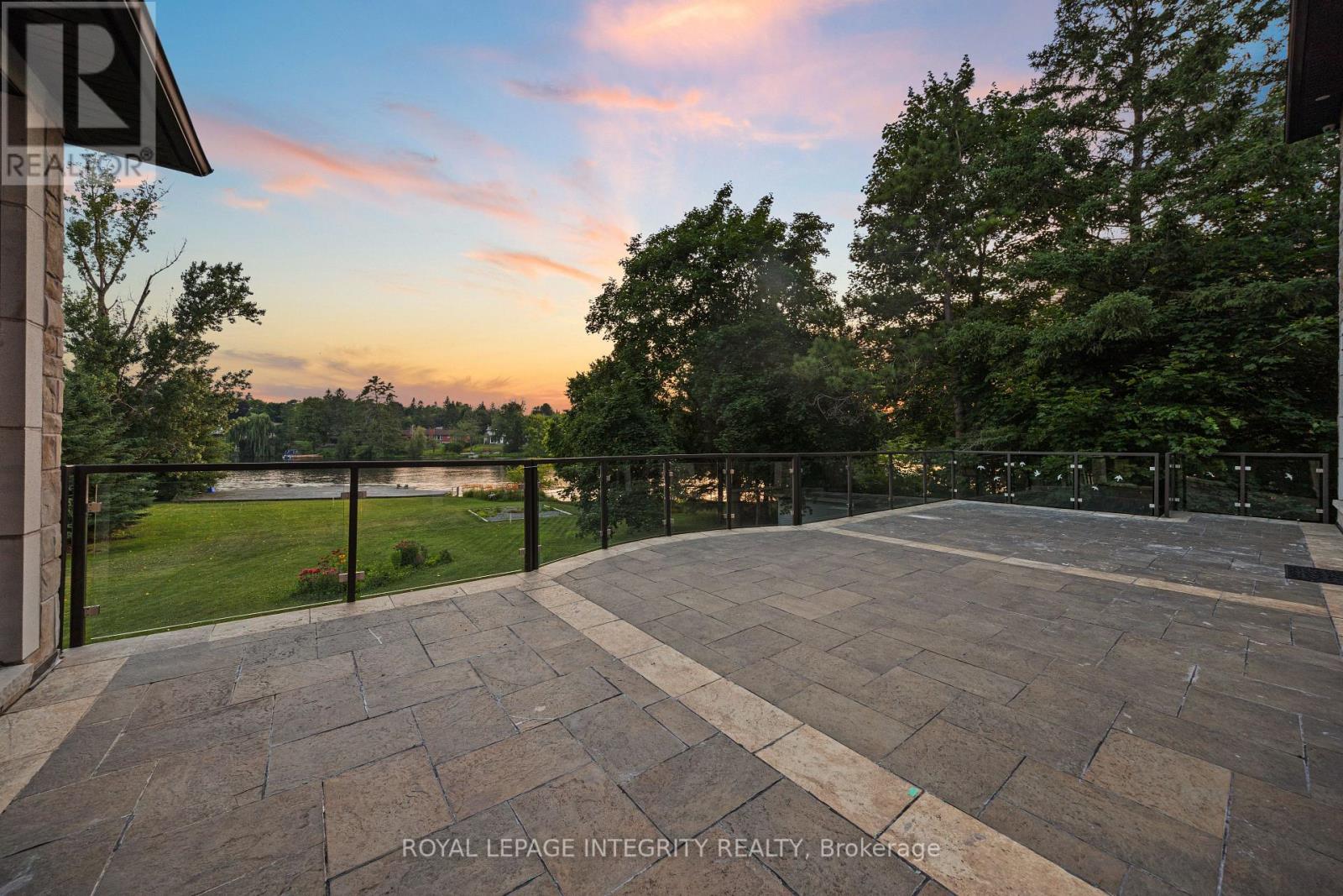 Perched along the serene Rideau River, this magnificent Italian-style villa seamlessly blends timeless elegance with modern luxury. Spanning over 7,400 sq. ft. of meticulously crafted living space, the residence delights at every turn with breathtaking river views, exquisite craftsmanship, and luxurious amenities. Beyond the dramatic 20-foot marble foyer that makes an unforgettable first impression, the home unfolds with graceful elegance. Soaring 10-foot ceilings and rich hardwood flooring flow throughout the main level, while multiple rooms showcase exquisite tray ceilings with recessed lighting, creating an ambiance of refined warmth. The formal dining room impresses with its 14-foot arched ceiling and stunning arched window that fills the space with natural light while framing picturesque outdoor views. The gourmet kitchen features a 13-foot granite island, top-tier Viking appliances, and custom walnut and Pashmina White cabinetry, complemented by a walk-in pantry for effortless entertaining. The adjoining breakfast area and family room bathe in natural light and offer panoramic water views, enhanced by a convenient wet bar and rough-in elevator. The main floor also includes a spacious executive office with private balcony access, along with a full bathroom that doubles as a guest suite. Upstairs, four bedroom suites each boast generous walk-in closets and spa-like Ensuite offers a massage shower & granite counter tops. The walkout basement serves as a versatile retreat, featuring high ceilings, oversized windows, a fifth bedroom, and a full bath. Enjoy whole-home indoor & outdoor audio system. Outside, the home's full stone façade exudes sophistication, while the expansive 650 sq. ft. balcony and private dock invite you to enjoy the breathtaking riverfront setting. Every detail of this exceptional residence has been thoughtfully designed to deliver an extraordinary living experience. (id:64974)
