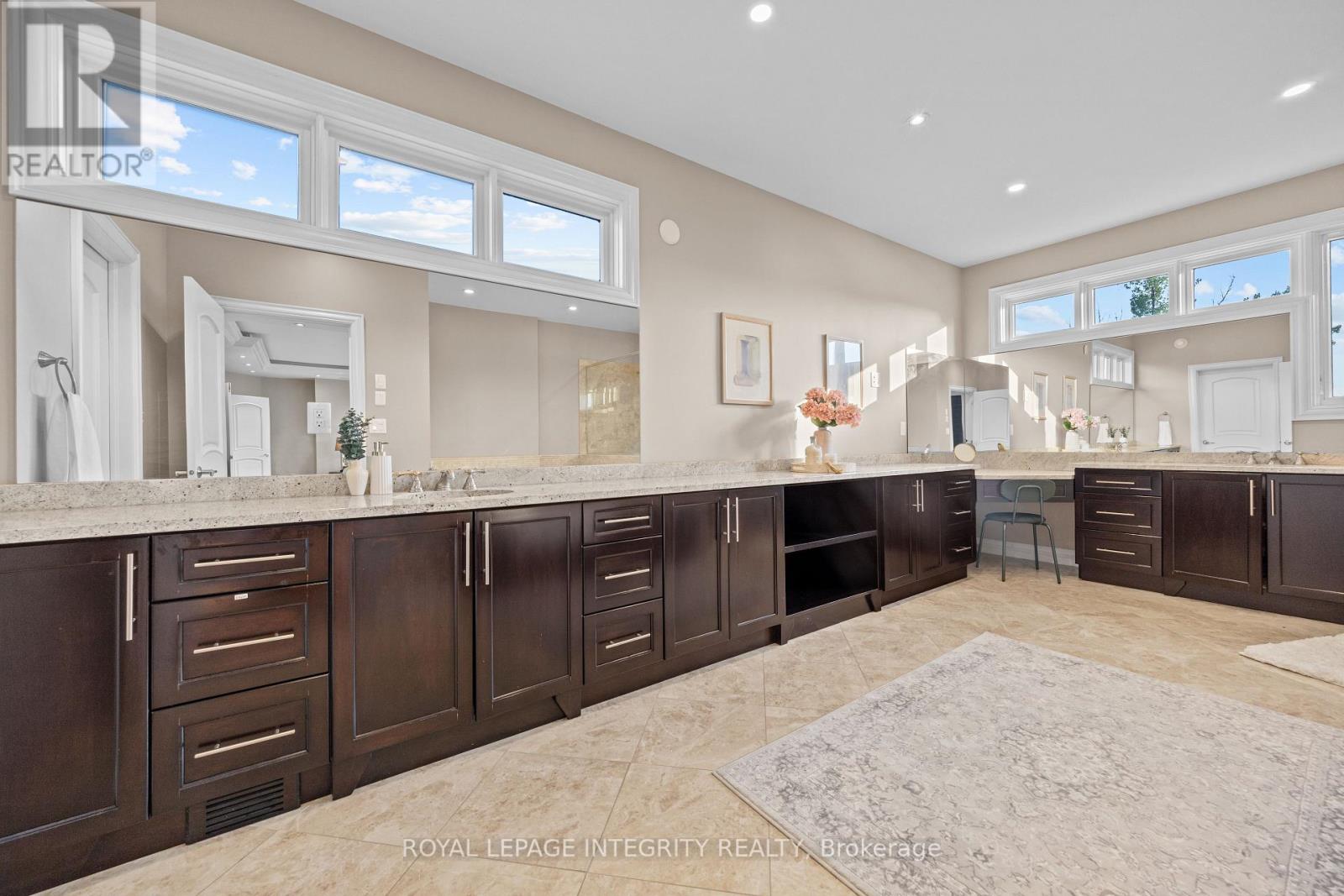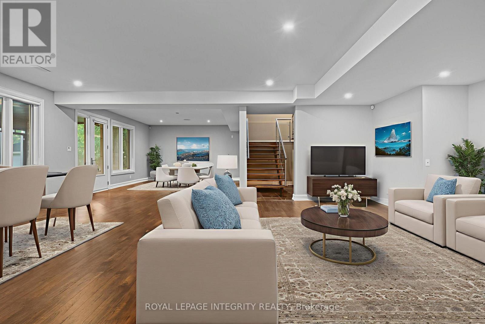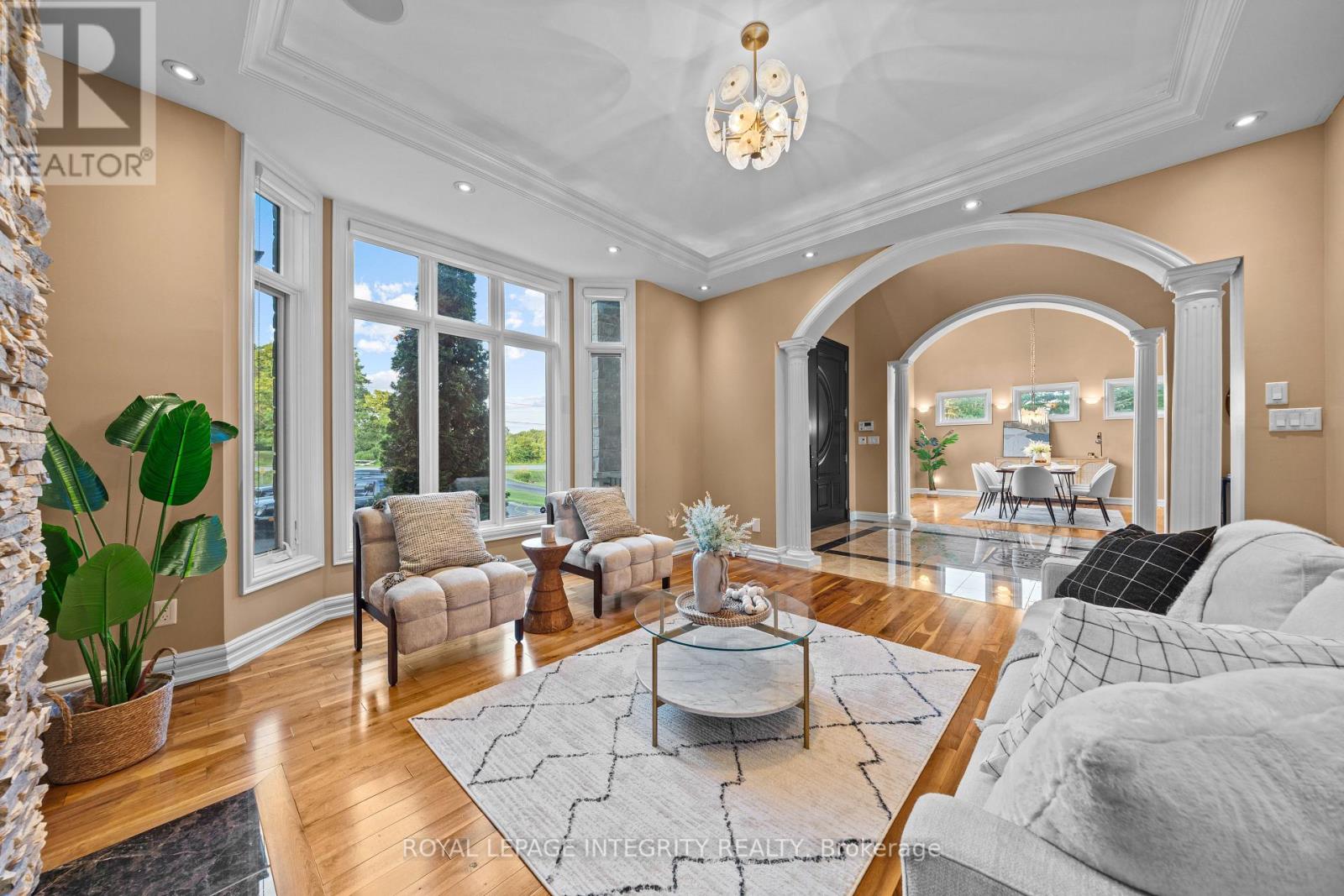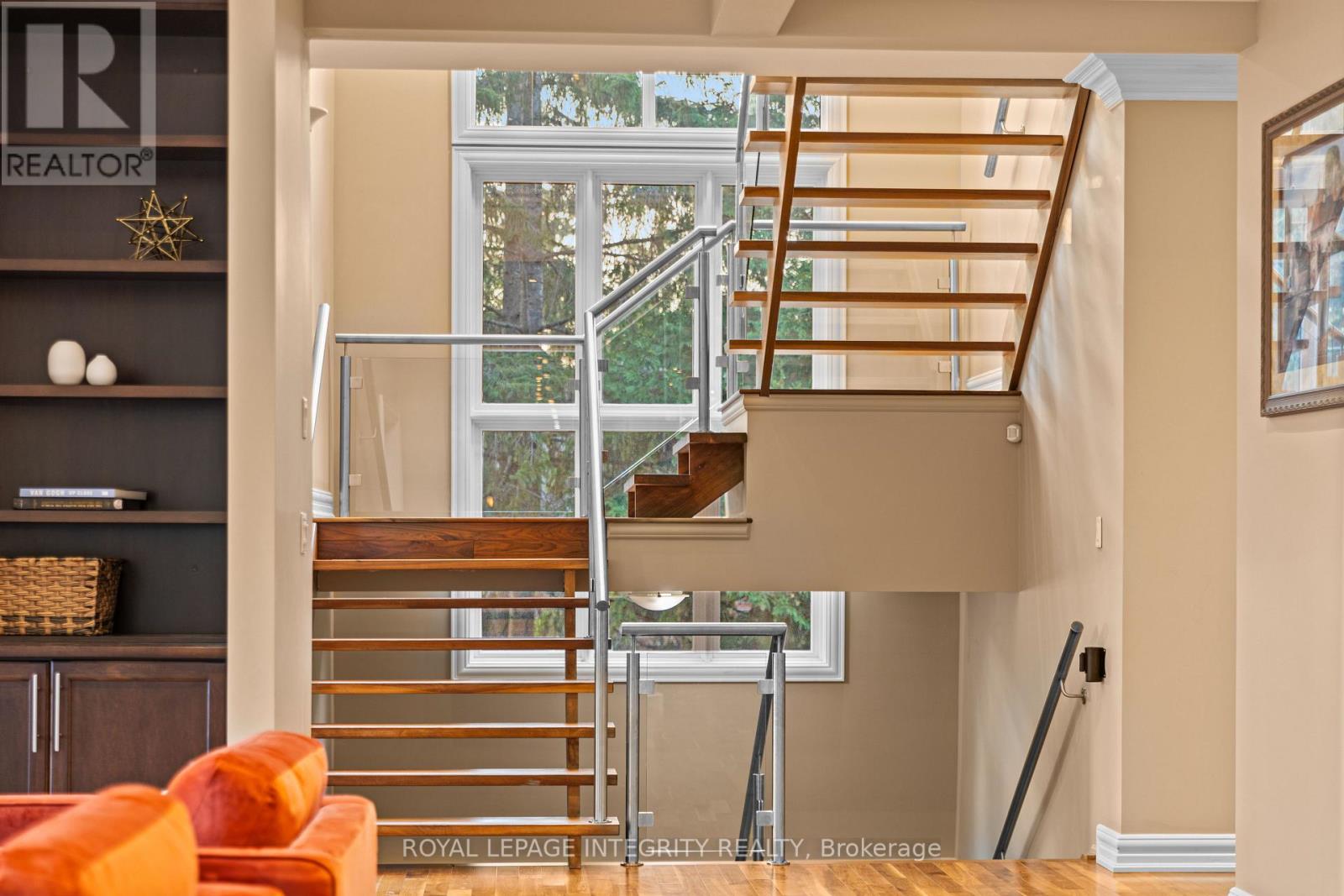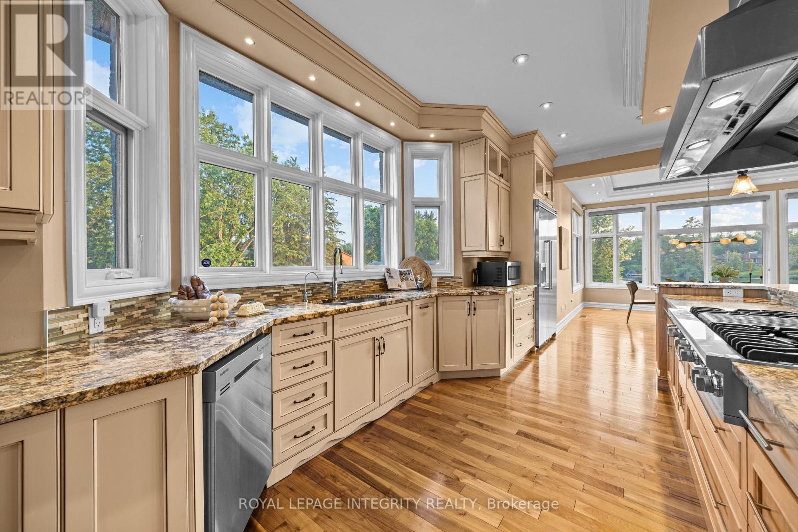 Perched along the serene Rideau River, this magnificent Italian-style villa seamlessly blends timeless elegance with modern luxury. Spanning over 7,400 sq. ft. of meticulously crafted living space, the residence delights at every turn with breathtaking river views, exquisite craftsmanship, and luxurious amenities. Beyond the dramatic 20-foot marble foyer that makes an unforgettable first impression, the home unfolds with graceful elegance. Soaring 10-foot ceilings and rich hardwood flooring flow throughout the main level, while multiple rooms showcase exquisite tray ceilings with recessed lighting, creating an ambiance of refined warmth. The formal dining room impresses with its 14-foot arched ceiling and stunning arched window that fills the space with natural light while framing picturesque outdoor views. The gourmet kitchen features a 13-foot granite island, top-tier Viking appliances, and custom walnut and Pashmina White cabinetry, complemented by a walk-in pantry for effortless entertaining. The adjoining breakfast area and family room bathe in natural light and offer panoramic water views, enhanced by a convenient wet bar and rough-in elevator. The main floor also includes a spacious executive office with private balcony access, along with a full bathroom that doubles as a guest suite. Upstairs, four bedroom suites each boast generous walk-in closets and spa-like Ensuite offers a massage shower & granite counter tops. The walkout basement serves as a versatile retreat, featuring high ceilings, oversized windows, a fifth bedroom, and a full bath. Enjoy whole-home indoor & outdoor audio system. Outside, the home's full stone façade exudes sophistication, while the expansive 650 sq. ft. balcony and private dock invite you to enjoy the breathtaking riverfront setting. Every detail of this exceptional residence has been thoughtfully designed to deliver an extraordinary living experience. (id:64974)