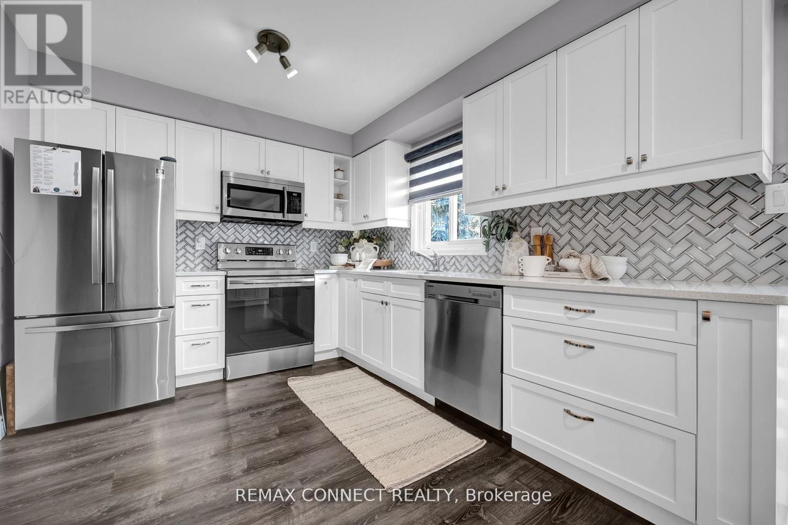 Offers welcome anytime. Beautifully maintained 3 bedroom family home in the highly desirable Maple Ridge community of Pickering. A stamped concrete walkway creates a warm first impression as you arrive. Inside, the home has been freshly painted and features new, modern laminate flooring that flows effortlessly throughout the main level, creating a bright and cohesive living space. The newly renovated kitchen is filled with natural light and thoughtfully designed with abundant cabinetry, a wall to wall pantry for exceptional storage, and a walk-out to the spacious backyard. Step outside to enjoy a private deck and gazebo - ideal for entertaining or relaxing with family and friends. Upstairs, generously sized bedrooms offer beautiful hardwood flooring. The primary bedroom is bright and inviting, complete with a walk-in closet. The updated main bathroom showcases a sleek glass shower for a contemporary finish. The fully finished basement extends your living space with pot lights, ample storage, and a spacious laundry area. Ideally located close to schools, parks, everyday amenities, Pickering Town Centre, recreation centre, with quick access to Highway 401 and the Pickering GO Station, this move in ready home offers exceptional convenience in a family friendly neighbourhood. A fantastic opportunity to settle into one of Pickering's most sought after communities! (id:64974)