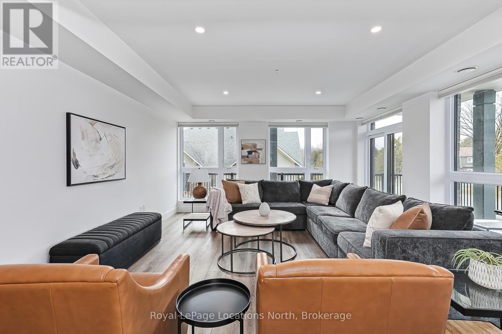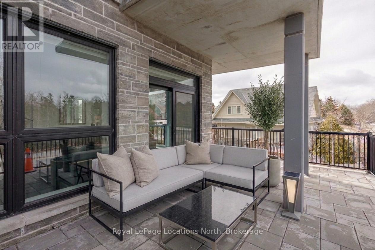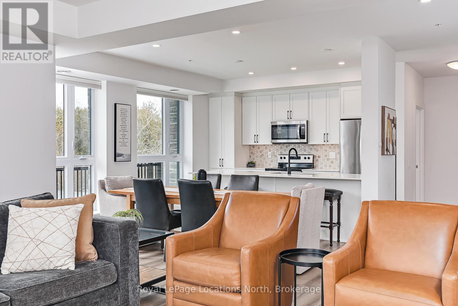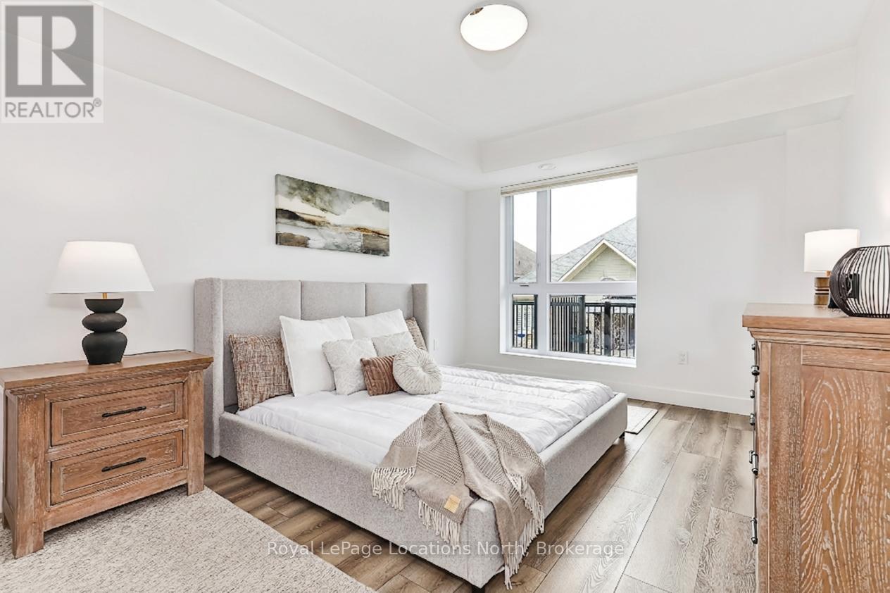 Elevate your lifestyle at Royal Windsor, a beautifully upgraded 2-bedroom, 2-bathroom, 1410 sq ft condo showcasing a bright and modern open-concept layout. The upgraded white kitchen features premium finishes, pot drawers, and a spacious pantry cupboard, perfect for everyday living and entertaining. The living, dining, and kitchen areas flow seamlessly to a wraparound balcony, which fills the space with natural light and extends your living area outdoors. The balcony has a desirable northwest exposure, facing away from the parking lot and neighbouring yards. Enjoy added comfort with Hunter Douglas WiFi-enabled blinds for easy control of light, privacy, and temperature. The primary suite offers a walk-in closet and an upgraded ensuite, while the second bedroom includes a double closet, ideal for guests or a home office. Additional features include stackable laundry, ample storage, two tandem parking spaces(with power for an EV charger,) a main floor locker, and a sleek, modern design throughout. Residents enjoy exceptional amenities, including a stylish party room, a rooftop terrace with a BBQ area overlooking Blue Mountain, an indoor pool, fitness centre, golf simulator, a games room and more - perfect for both entertaining and everyday enjoyment. A perfect blend of style, function, and comfort just moments from scenic trails and the shores of Georgian Bay! (id:64974)