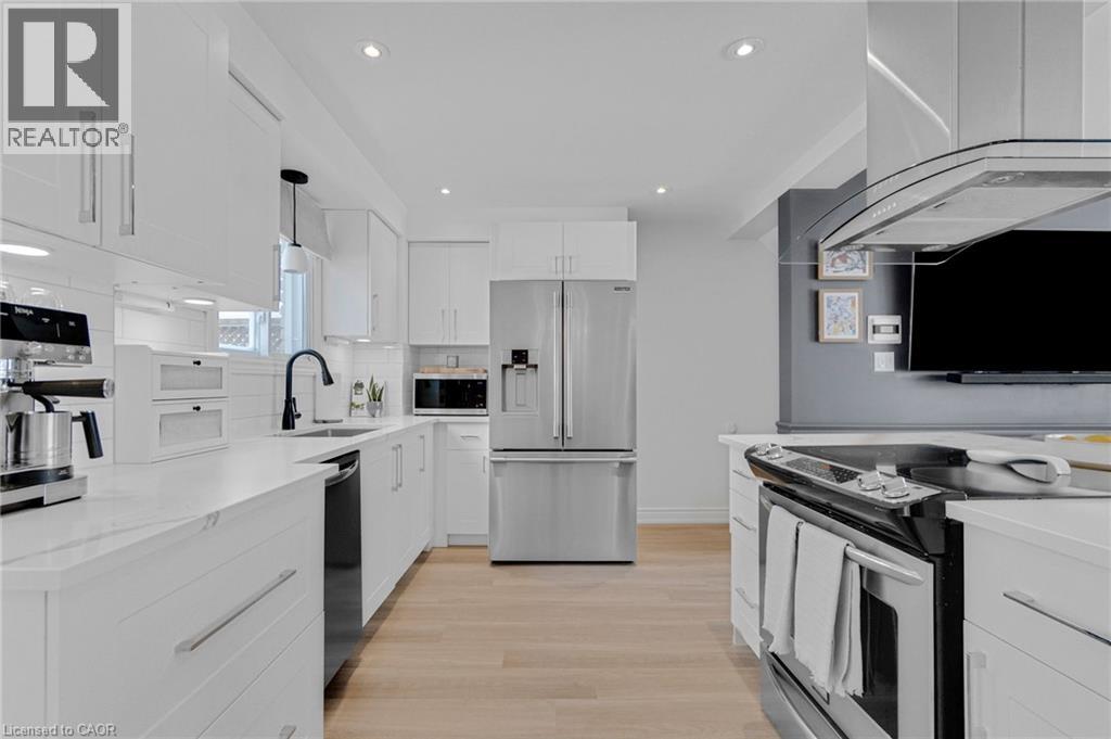 Welcome to 119 Dorothy Street! Beautifully renovated two-storey home tucked away on a quiet, tree-lined street in St. Catharines' sought-after north end. Steps away from the newly redesigned Elma Street Park, making this an ideal location for families seeking green space, playgrounds, and a true neighbourhood feel. The heart of the home is the stunning, modern kitchen featuring quartz countertops, a centre island with seating, slide-in range, stainless steel hood vent, soft-close cabinetry, under-mount lighting, backsplash, and Moen faucets, perfect for everyday living and entertaining alike. Thoughtful design touches like wainscoting, a beautiful bay window, updated lighting, and stylish hardware add warmth and character throughout. The home offers engineered hardwood flooring and updated bathrooms, including a newly refreshed bathroom in 2025 and a beautifully finished basement bath with glass-tiled shower and granite vanity. 200-amp service panel, plumbing, HVAC and ductwork, a new staircase with wrought iron railings, and improved insulation throughout all updated in 2021. Recent updates continue to add peace of mind, including furnace (2025), eavestroughs and downspouts (2024), fridge (2024), central air (2021), and roof (2018). Outside, enjoy a private backyard oasis with a newly built deck, shed, and fresh concrete walkways and patio completed in 2023, perfect for summer evenings and family gatherings. This is a truly move-in ready home in one of St. Catharines' most desirable north end neighbourhoods, modern, functional, and ideally located for family living. (id:64974)