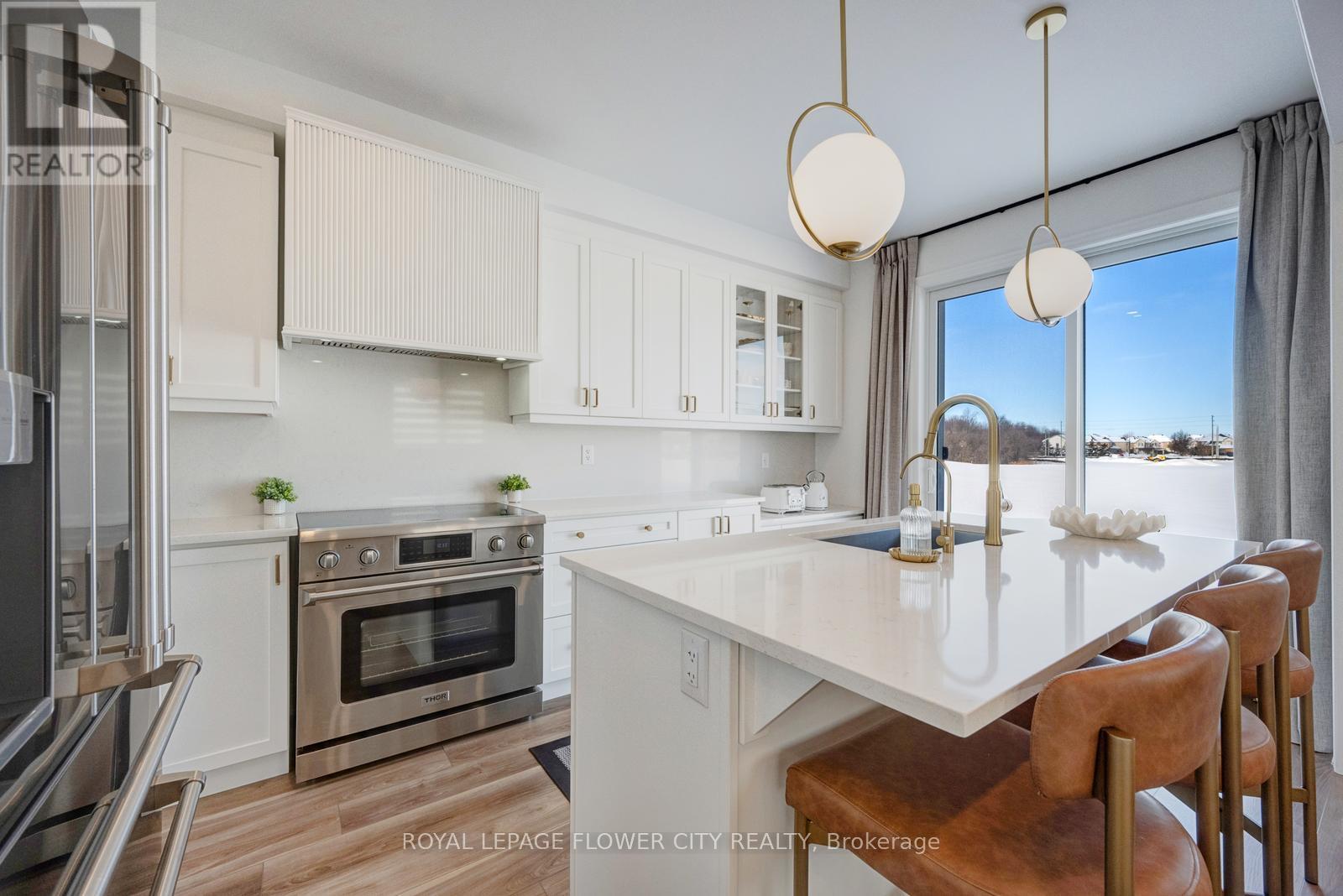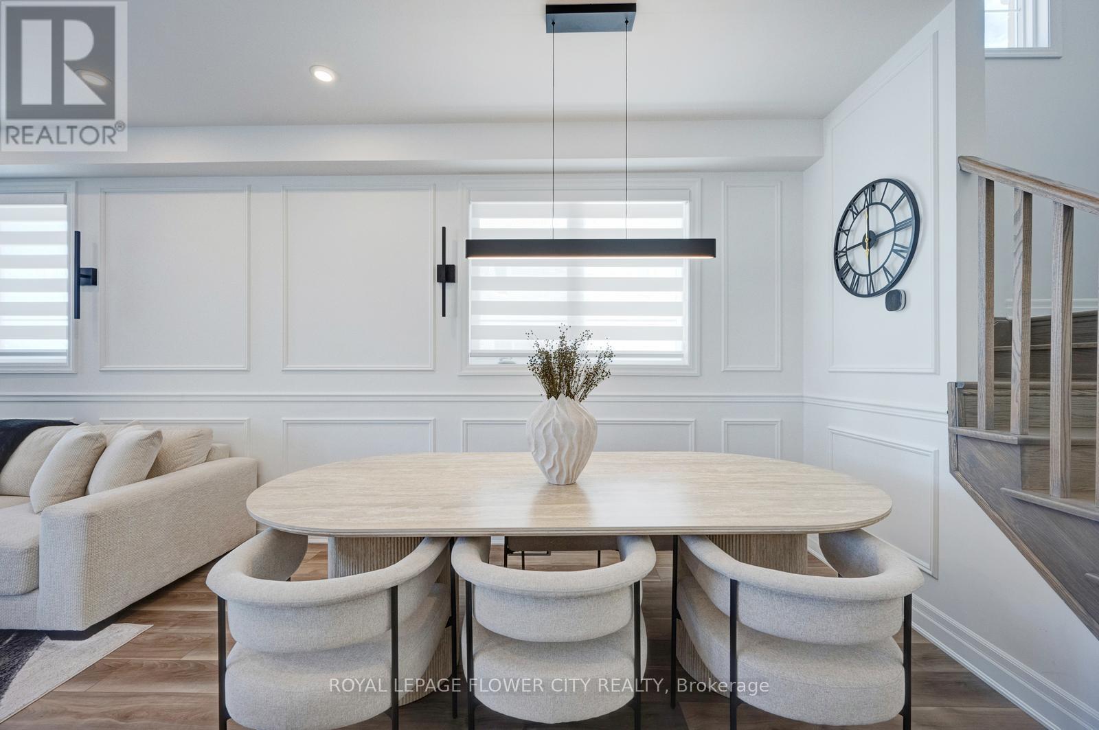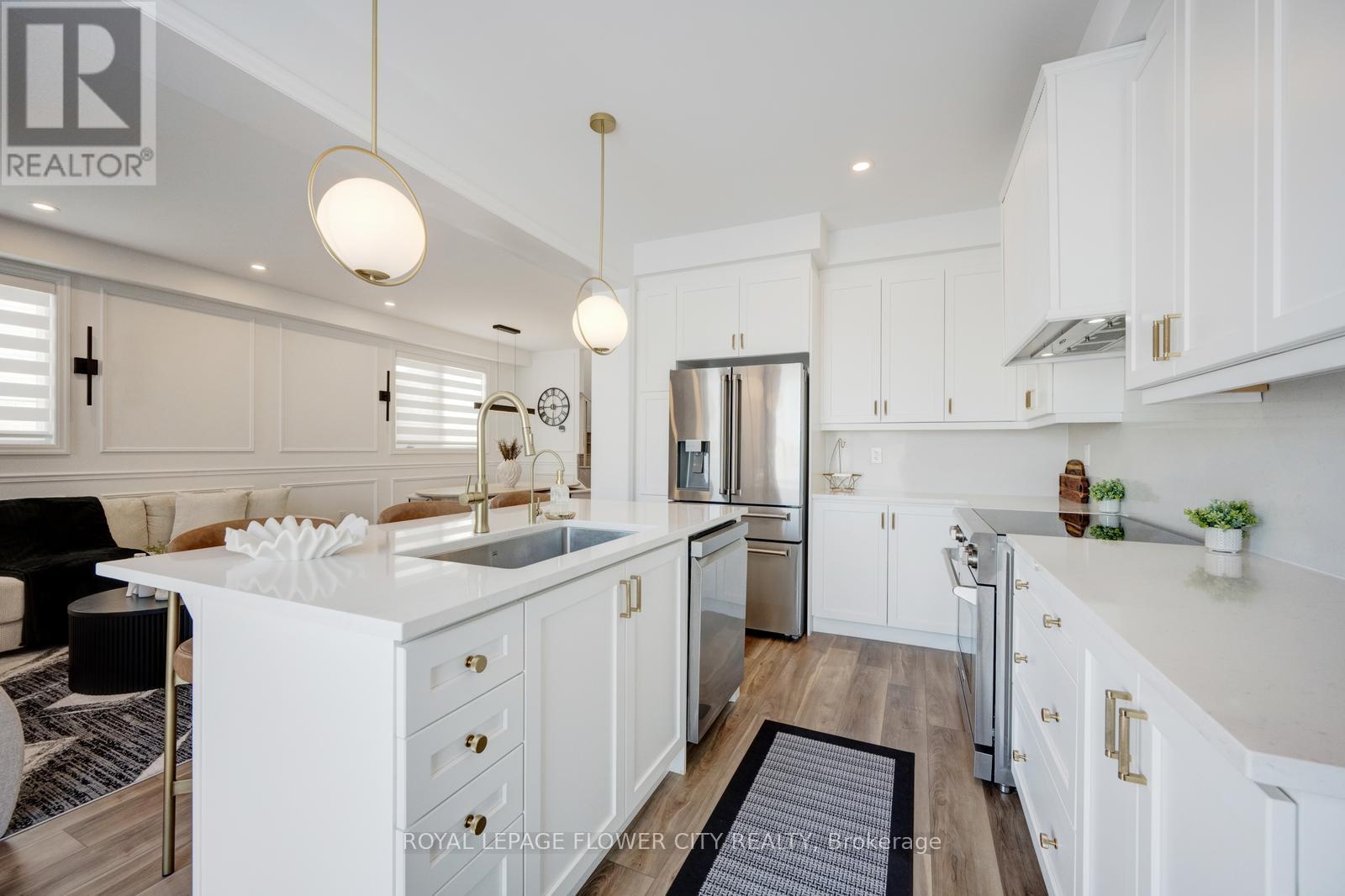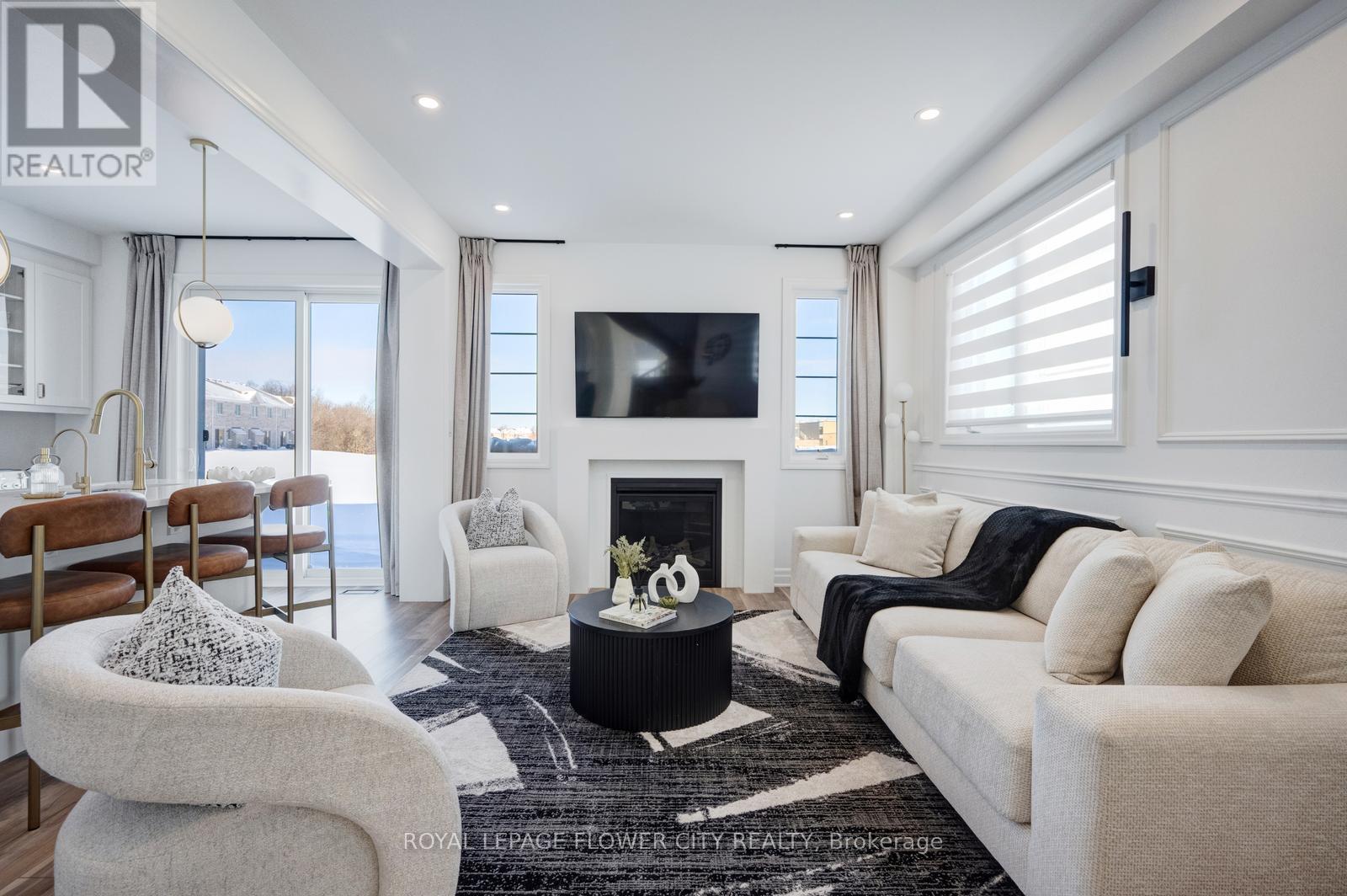An exceptional opportunity to own a nearly new, freehold 2-storey End unit townhome offering 4 bedrooms and 3 bathrooms in the prestigious, family-oriented Bowes neighbourhood of Milton. Showcasing an elegant stone and stucco exterior, the home welcomes you into a refined foyer finished with porcelain tile flooring bright, open-concept layout. The main level features 9-foot Smooth ceilings, carpet-free flooring on both the main and second levels with premium finishes throughout. Sun filled kitchen features a large Whistler Polished Quartz island, quartz backsplash, high end stainless steel appliances and custom cabinetry. Expansive windows illuminate the living and dining spaces, creating an atmosphere that is both warm and effortlessly upscale ideal for entertaining or quiet evenings at home.A custom oak staircase leads to the upper level, where four spacious bedrooms offer comfort and privacy. The primary suite is a true sanctuary, complete with a walk-in closet and a spa-like ensuite with double vanity, upgraded quartz countertops, and a frameless glass shower. All interior doors have been upgraded for a refined finishes. The convenience of an upper-level laundry room further enhances everyday living. This meticulously maintained home offers a rare combination of modern luxury, thoughtful design, and an exceptional location, making it perfectly suited for discerning buyers seeking comfort, elegance, and long-term value. (id:64974)