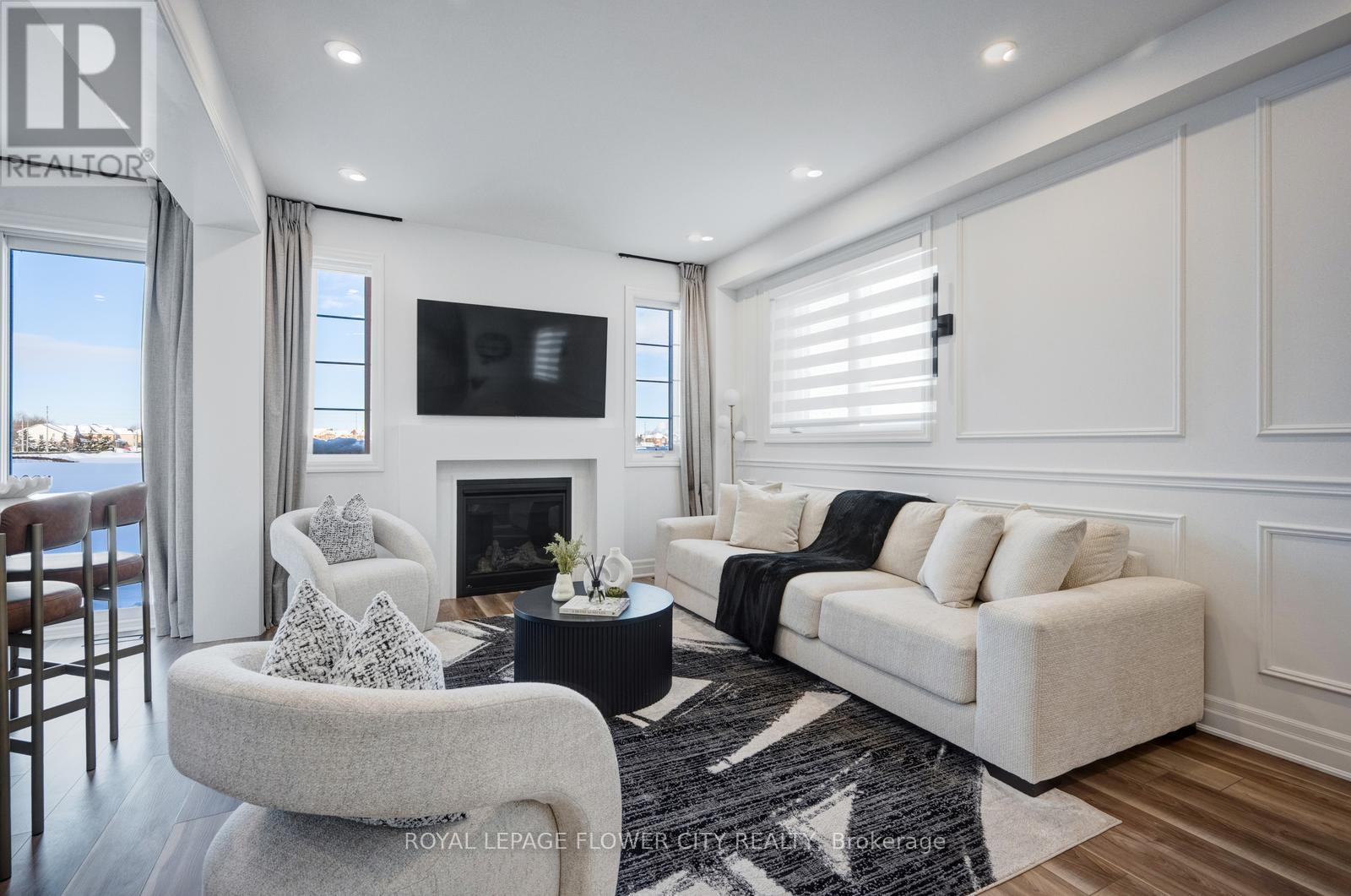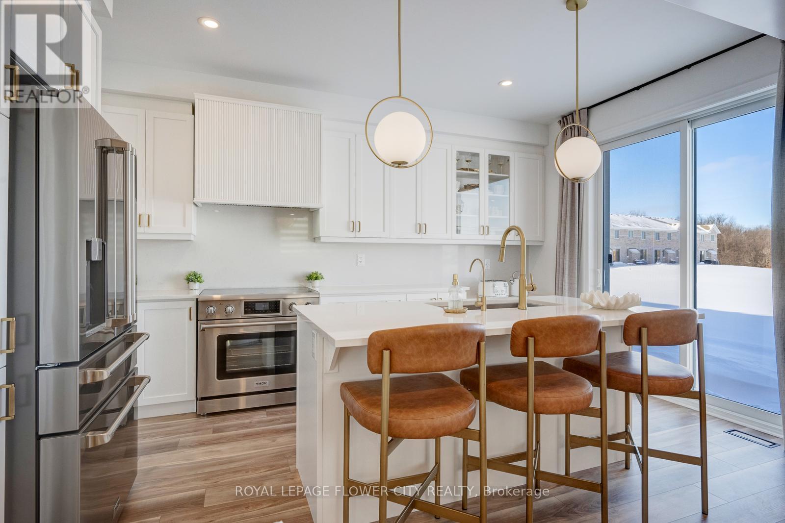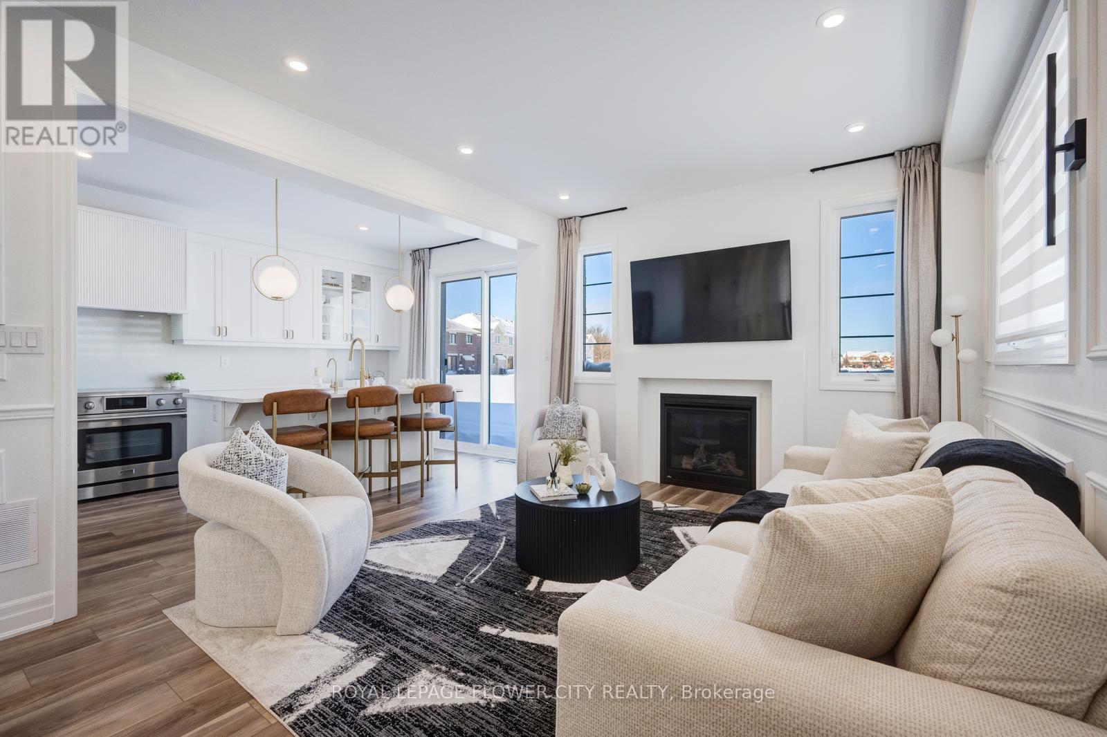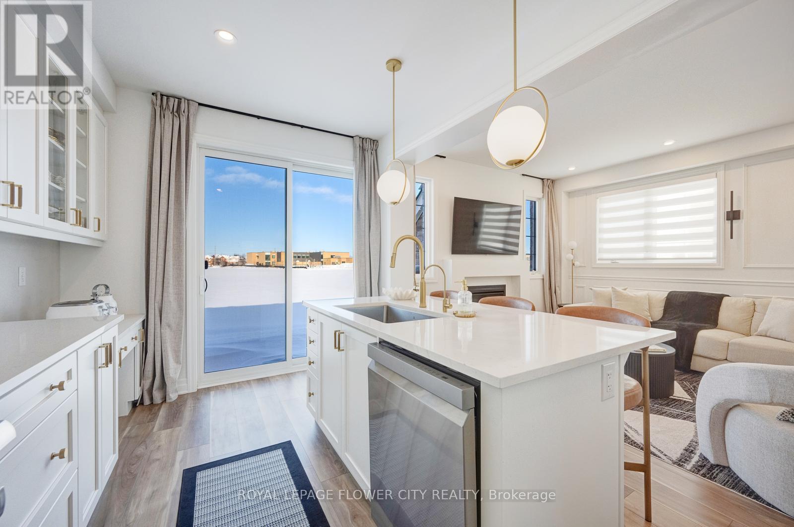 An exceptional opportunity to own a nearly new, freehold 2-storey End unit townhome offering 4 bedrooms and 3 bathrooms in the prestigious, family-oriented Bowes neighbourhood of Milton. Showcasing an elegant stone and stucco exterior, the home welcomes you into a refined foyer finished with porcelain tile flooring bright, open-concept layout. The main level features 9-foot Smooth ceilings, carpet-free flooring on both the main and second levels with premium finishes throughout. Sun filled kitchen features a large Whistler Polished Quartz island, quartz backsplash, high end stainless steel appliances and custom cabinetry. Expansive windows illuminate the living and dining spaces, creating an atmosphere that is both warm and effortlessly upscale ideal for entertaining or quiet evenings at home.A custom oak staircase leads to the upper level, where four spacious bedrooms offer comfort and privacy. The primary suite is a true sanctuary, complete with a walk-in closet and a spa-like ensuite with double vanity, upgraded quartz countertops, and a frameless glass shower. All interior doors have been upgraded for a refined finishes. The convenience of an upper-level laundry room further enhances everyday living. This meticulously maintained home offers a rare combination of modern luxury, thoughtful design, and an exceptional location, making it perfectly suited for discerning buyers seeking comfort, elegance, and long-term value. (id:64974)