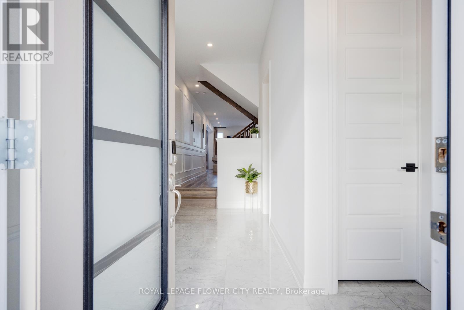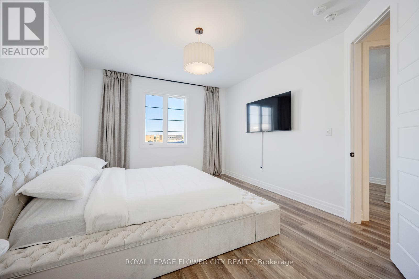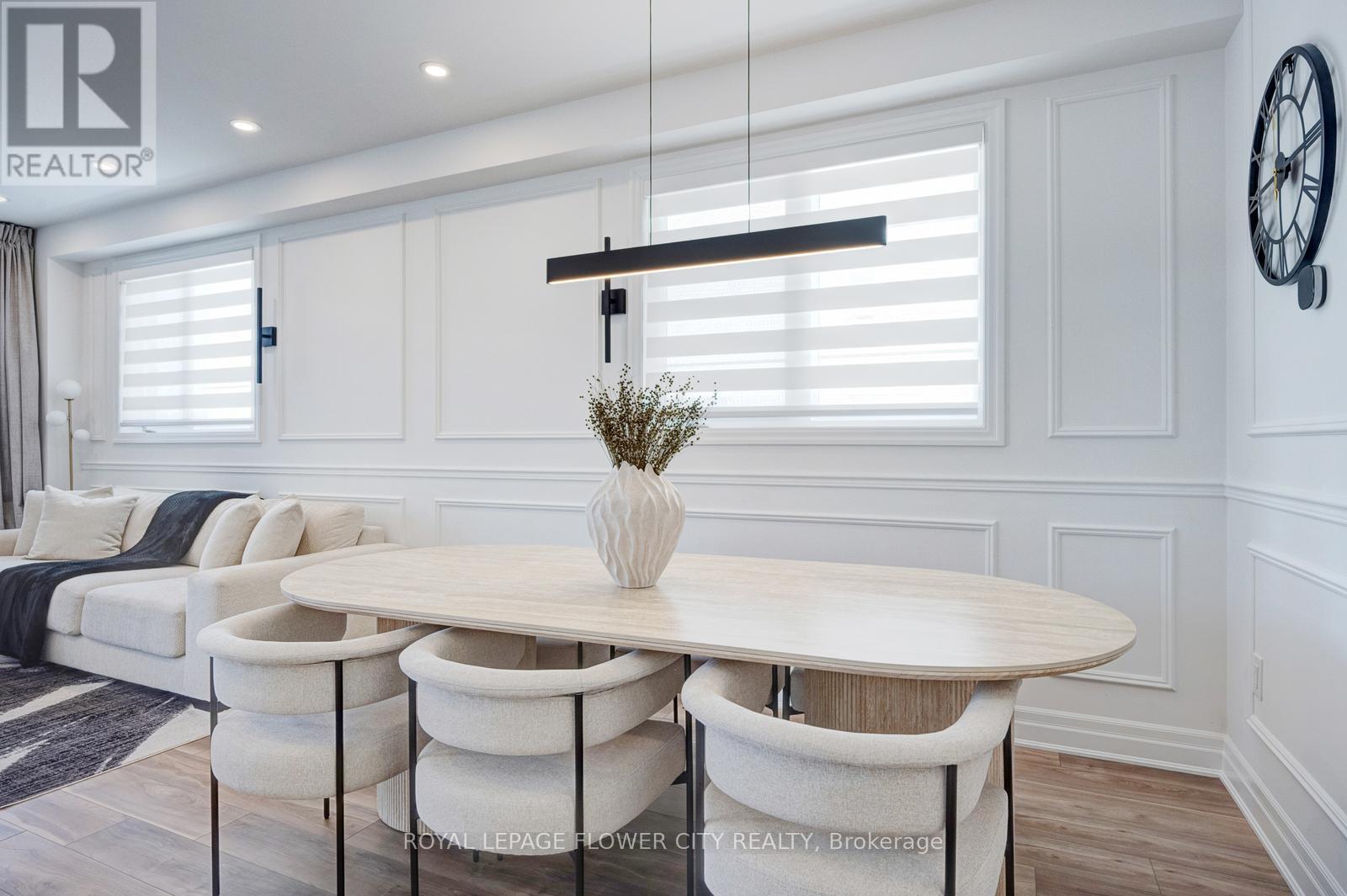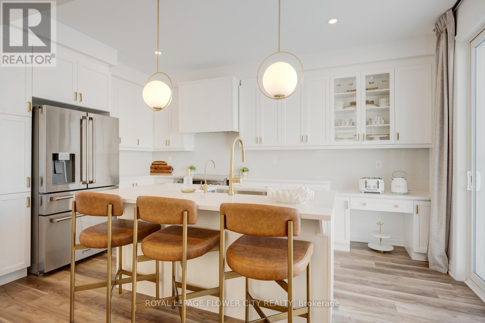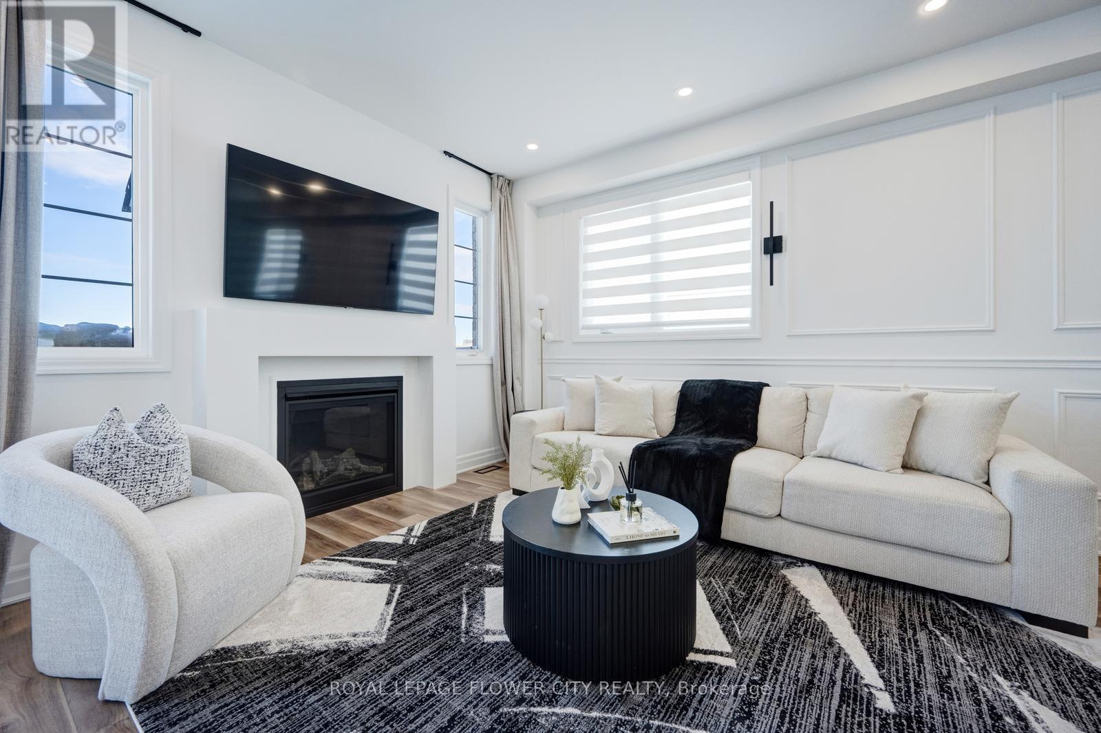 An exceptional opportunity to own a nearly new, freehold 2-storey End unit townhome offering 4 bedrooms and 3 bathrooms in the prestigious, family-oriented Bowes neighbourhood of Milton. Showcasing an elegant stone and stucco exterior, the home welcomes you into a refined foyer finished with porcelain tile flooring bright, open-concept layout. The main level features 9-foot Smooth ceilings, carpet-free flooring on both the main and second levels with premium finishes throughout. Sun filled kitchen features a large Whistler Polished Quartz island, quartz backsplash, high end stainless steel appliances and custom cabinetry. Expansive windows illuminate the living and dining spaces, creating an atmosphere that is both warm and effortlessly upscale ideal for entertaining or quiet evenings at home.A custom oak staircase leads to the upper level, where four spacious bedrooms offer comfort and privacy. The primary suite is a true sanctuary, complete with a walk-in closet and a spa-like ensuite with double vanity, upgraded quartz countertops, and a frameless glass shower. All interior doors have been upgraded for a refined finishes. The convenience of an upper-level laundry room further enhances everyday living. This meticulously maintained home offers a rare combination of modern luxury, thoughtful design, and an exceptional location, making it perfectly suited for discerning buyers seeking comfort, elegance, and long-term value. (id:64974)