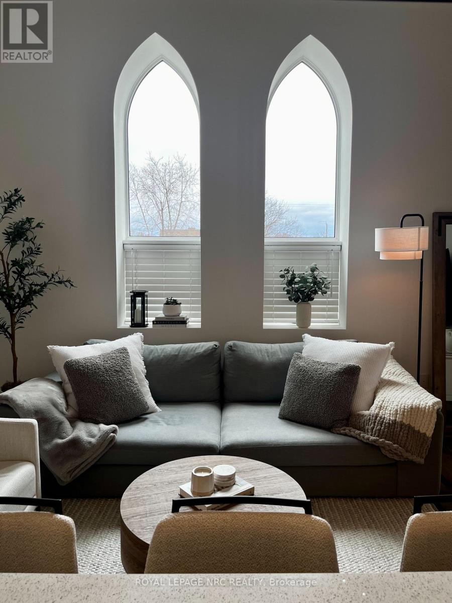 Welcome to a truly special place to call home! Once the historic St. James Church, this beautiful building was thoughtfully transformed in 2019 into a charming boutique condominium that blends timeless character with modern comfort.This bright and spacious two-bedroom residence spans two levels, offering a warm and inviting layout perfect for everyday living. Elegant flooring, soaring ceilings, graceful windows, and a stylish kitchen island create a space that feels both sophisticated and comfortable. Natural light pours through the skylight, filling the home with sunshine and highlighting its unique architectural features. The unit has also been recently professionally painted, giving it a fresh, clean, and move-in-ready feel.Enjoy your morning coffee on the balcony or relax in the cozy loft space above. With grocery stores, shopping, and great dining options just minutes away, everyday errands are easy and convenient. Commuting is simple too, thanks to nearby highways and transit access.As the largest unit in the building, this home offers a rare opportunity to enjoy extra space in a truly distinctive setting. More than just a condo, it's a bright, welcoming lifestyle in a one-of-a-kind historic conversion. (id:64974)