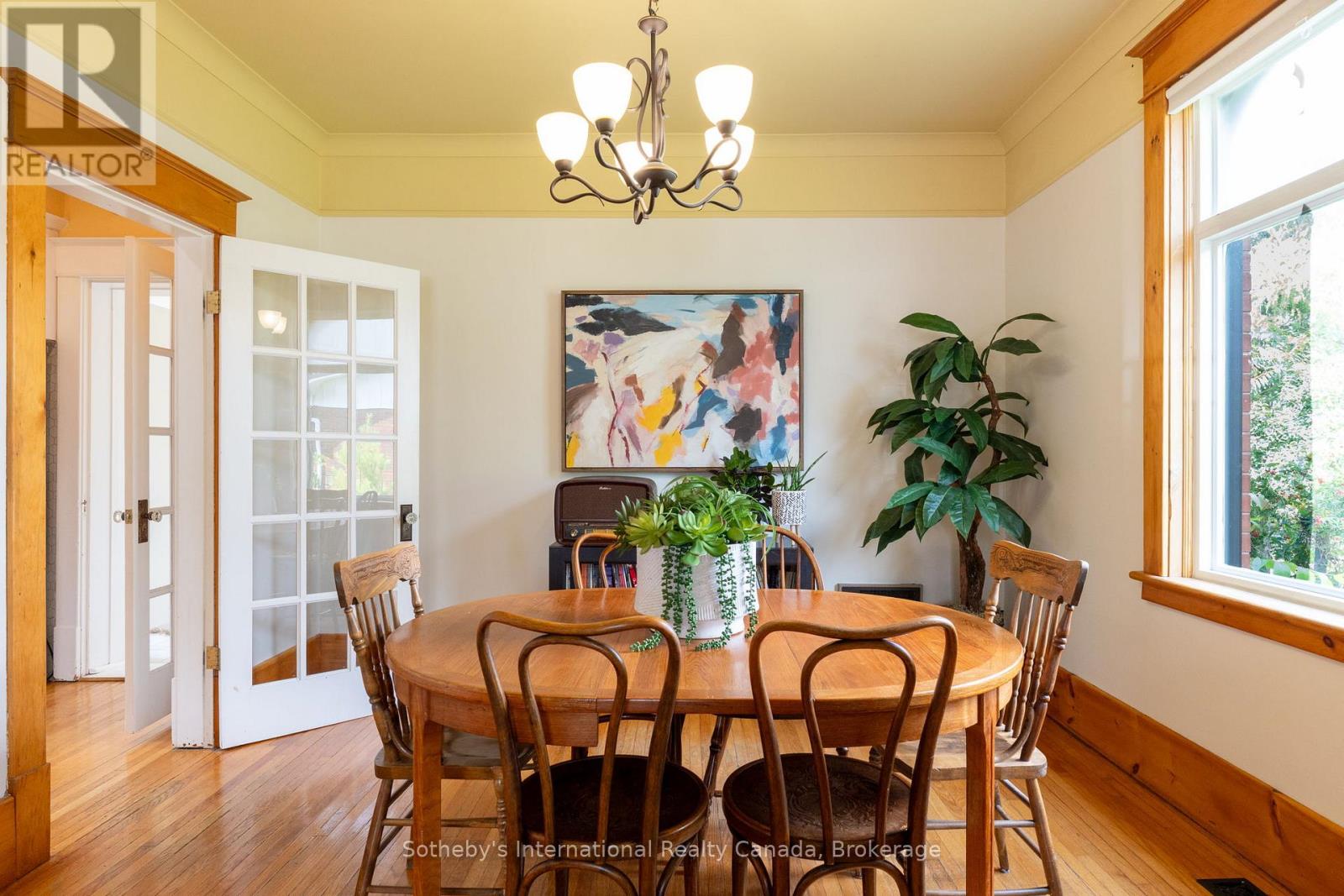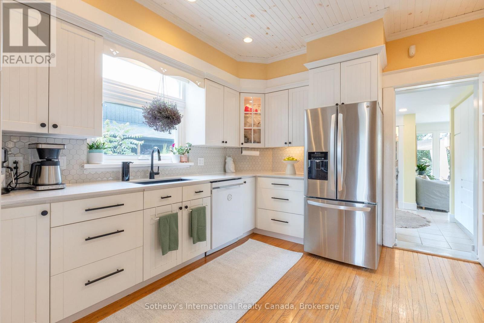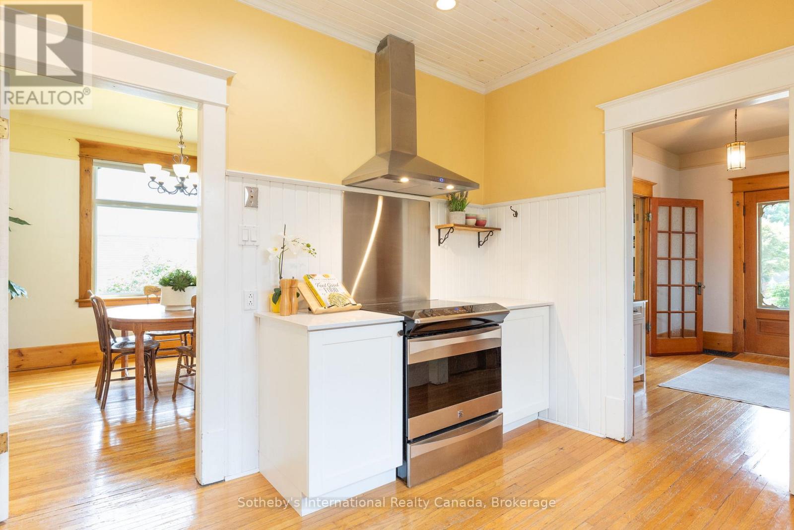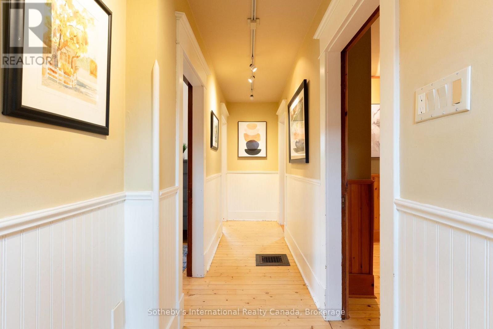 Step into this beautifully renovated 1921 Edwardian brick home that sits on a lovely 65 x 165 foot lot. Featuring 4+1 bedrooms, 2 baths, and 2,185 sq. ft.of warm, welcoming living space, this home is brimming with personality. Original solid wood trim, paneled doors, and detailed casings showcase the craftsmanship of a bygone era, adding depth and soul to every room. The main floor offers refinished strip oak hardwood, elegant wainscoting, and a Vermont gas wood stove for cozy evenings. The main floor features a renovated 3 piece bathroom and a brand-new four-season sunroom (2024) which floods the home with natural light and overlooks a fully fenced backyard with fruit trees and perennial gardens perfect for peaceful mornings or summer entertaining. The chef's kitchen, fully renovated in 2024, boasts quartz counters, a double undermount sink, and a crisp ceramic tile backsplash. Upstairs features four spacious bedrooms, a versatile bonus room (library), and a charming three-season sunroom. The finished attic is a private primary retreat with a skylight and loads of natural light. Updates include new windows top to bottom (2019), a heat pump(2024), a steel roof, and a custom Douglas Fir porch (2023). Car lovers and hobbyists will appreciate the heated double-car garage with a heated workshop and a large concrete driveway. Ready for you to move in, fall in love, and make it your own. The fully fenced yard boasts apple and cherry trees, raised garden beds, and a spacious back deck with gas BBQ hookup. The property also includes a solar panel contract generating approx.$3,000/year, which can be assumed or removed. Just a short stroll to the local school and rec center and Creemores shops, cafes, and restaurants! (id:64974)