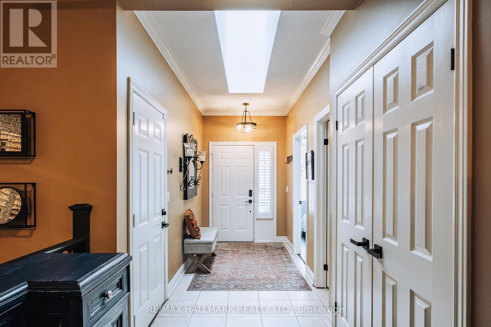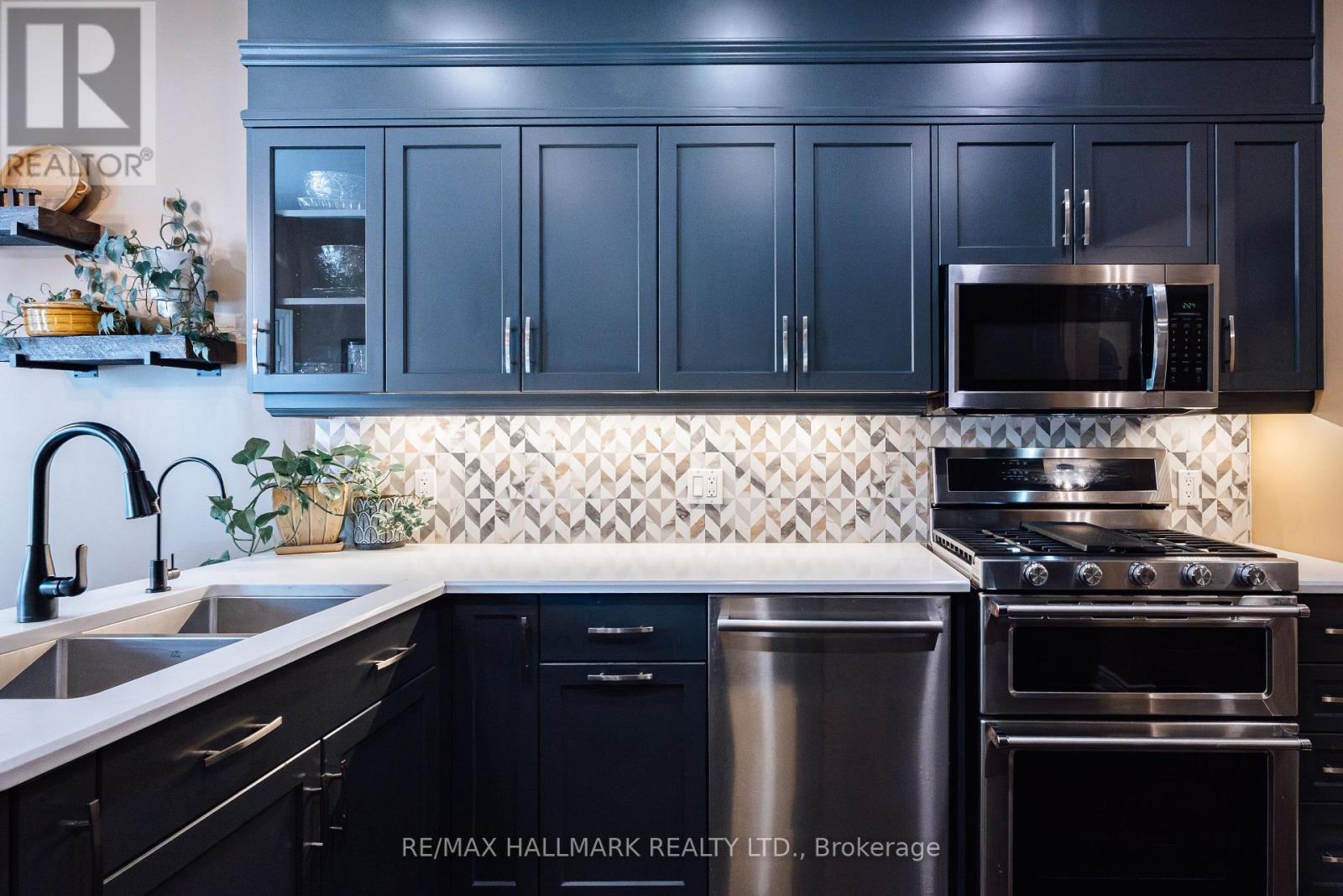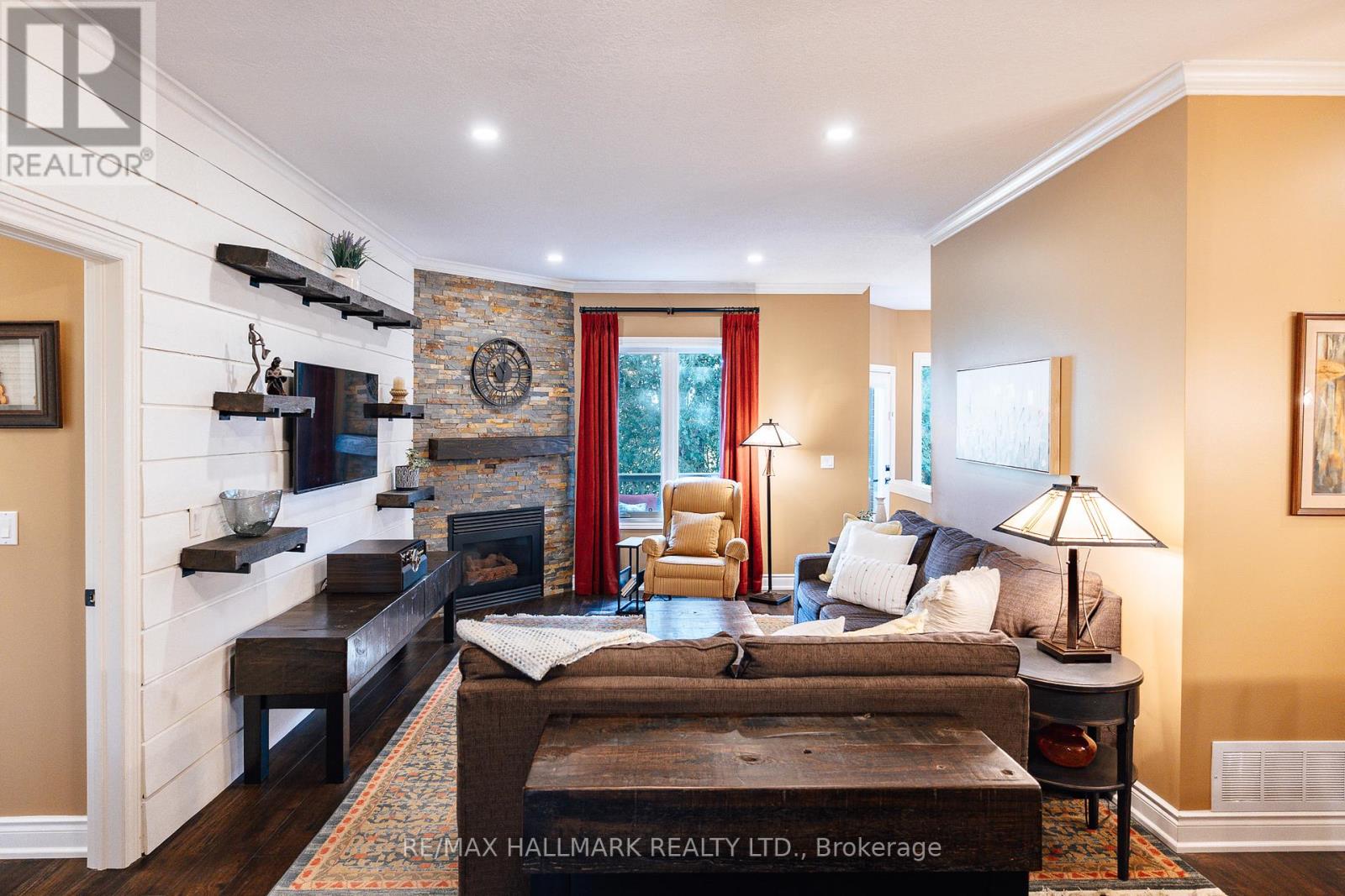 Some addresses are just coordinates. This one backs directly onto the Guelph Country Club.Welcome to The Fairways - 38 executive residences, private rear yards, double garages, and a setting that genuinely earns the name. This bungalow-style condo delivers over 3,000 sq ft of finished living across two levels, designed for the life you've actually earned.The main floor surprises immediately. A renovated kitchen with navy blue shaker cabinetry, quartz countertops, geometric mosaic backsplash, under-cabinet lighting, and stainless appliances. An open-concept great room with a stone-surround gas fireplace on a shiplap feature wall. Crown moulding, dark hardwood, a dining room with a sliding barn door. Main floor laundry. Main floor primary suite with walk-in closet and a fully renovated ensuite - floor-to-ceiling marble tile, frameless glass slider, vessel sink on black granite, matte black hardware. No stairs required. The lower level delivers more than expected: a TV lounge, dedicated music studio, exercise room, guest bedroom with sitting area, and a full bathroom. This doesn't feel like a basement. It feels like a bonus. Step outside to the private deck - two chairs, a gas grill, and the fairway rolling out behind you. Lawn, snow, exterior - handled. Your Sundays are yours again. (id:64974)