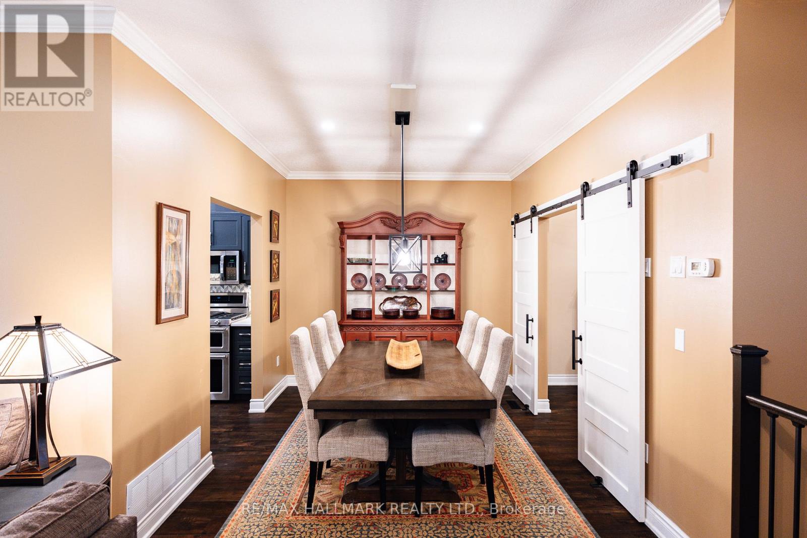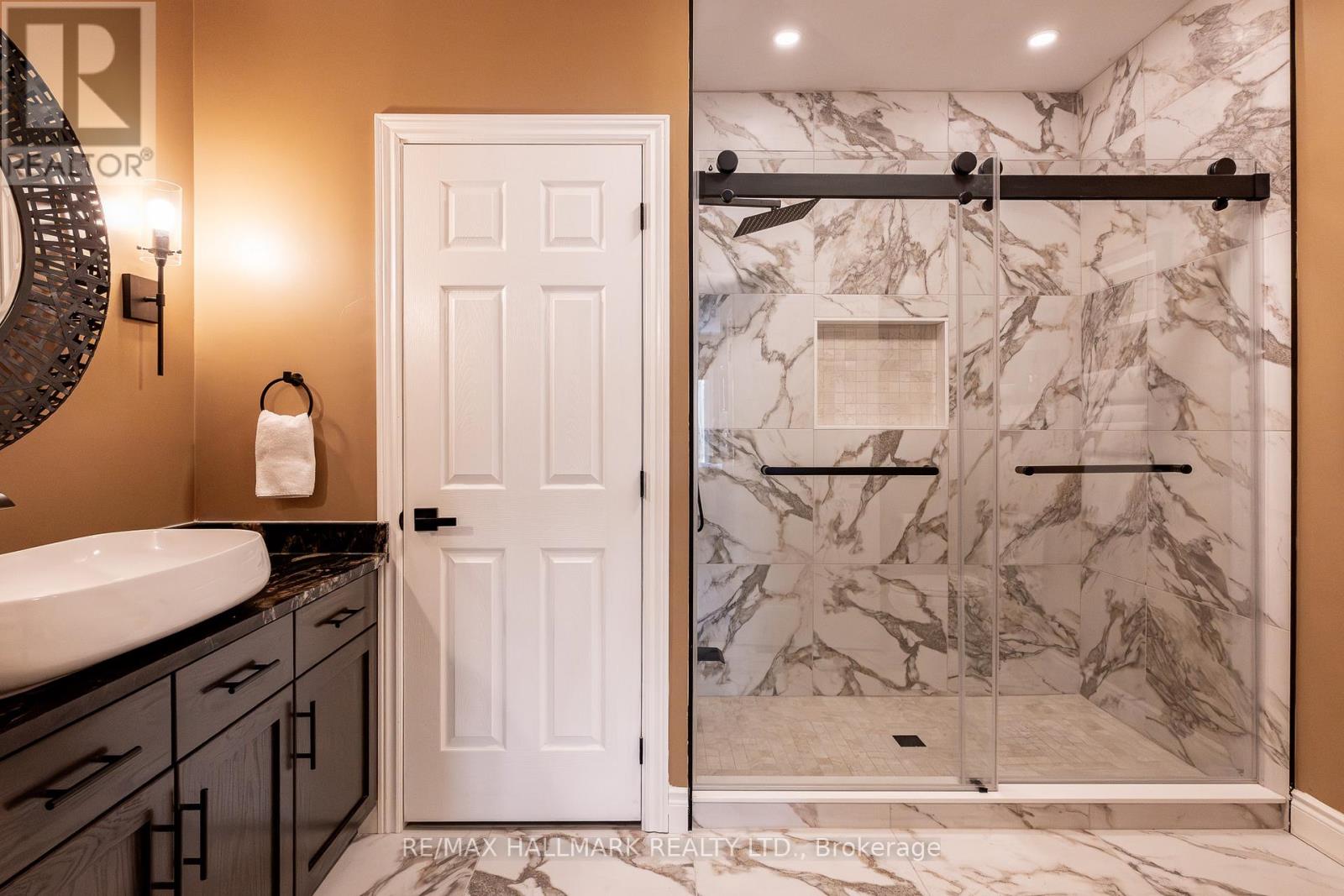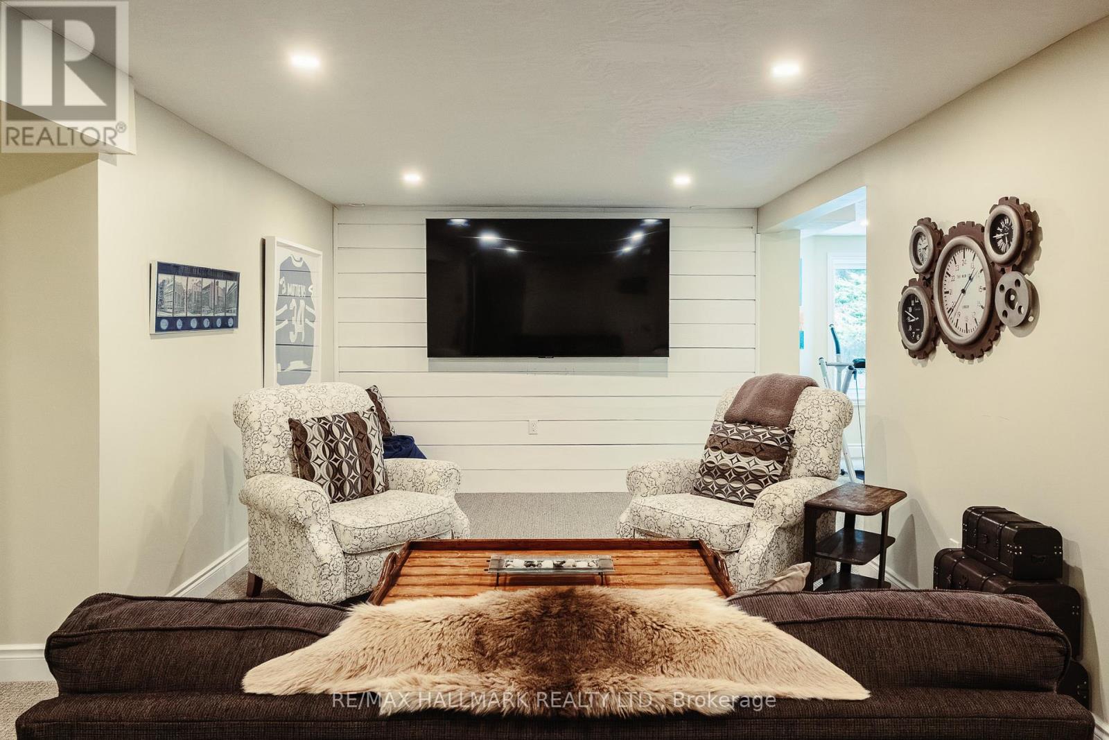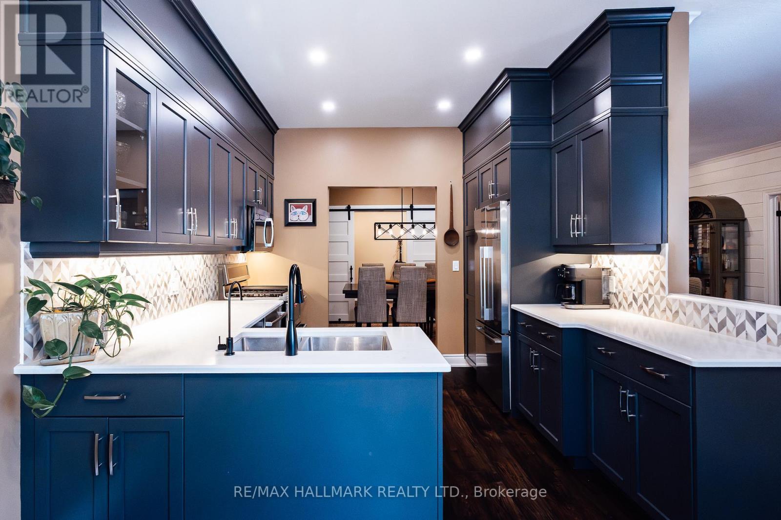 Some addresses are just coordinates. This one backs directly onto the Guelph Country Club.Welcome to The Fairways - 38 executive residences, private rear yards, double garages, and a setting that genuinely earns the name. This bungalow-style condo delivers over 3,000 sq ft of finished living across two levels, designed for the life you've actually earned.The main floor surprises immediately. A renovated kitchen with navy blue shaker cabinetry, quartz countertops, geometric mosaic backsplash, under-cabinet lighting, and stainless appliances. An open-concept great room with a stone-surround gas fireplace on a shiplap feature wall. Crown moulding, dark hardwood, a dining room with a sliding barn door. Main floor laundry. Main floor primary suite with walk-in closet and a fully renovated ensuite - floor-to-ceiling marble tile, frameless glass slider, vessel sink on black granite, matte black hardware. No stairs required. The lower level delivers more than expected: a TV lounge, dedicated music studio, exercise room, guest bedroom with sitting area, and a full bathroom. This doesn't feel like a basement. It feels like a bonus. Step outside to the private deck - two chairs, a gas grill, and the fairway rolling out behind you. Lawn, snow, exterior - handled. Your Sundays are yours again. (id:64974)
