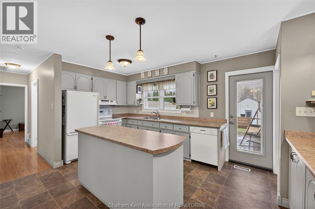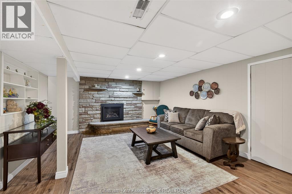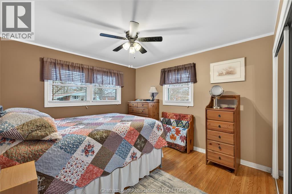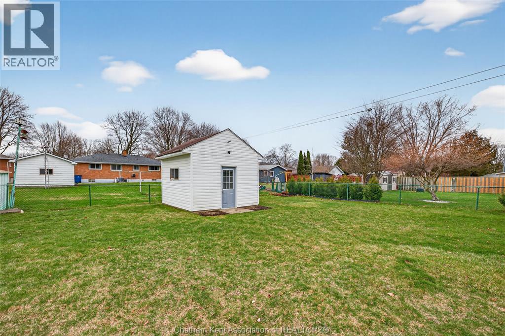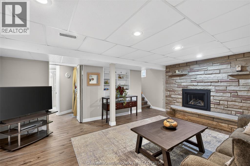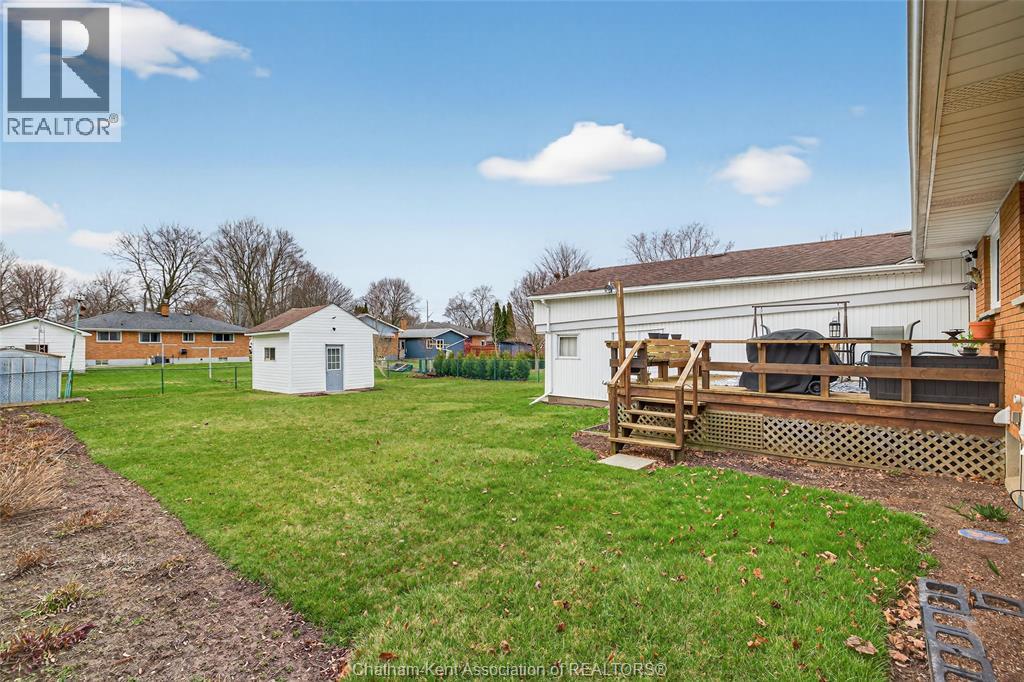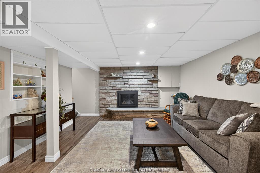 Pride of ownership shows throughout this solid brick bungalow in one of Chatham's most established neighbourhoods — 2 main floor bedrooms, hardwood floors, bright living and dining area, and an updated kitchen with painted cabinetry, centre island, pendant lighting, and mudroom entry with patio doors leading to a rear deck overlooking a beautifully maintained backyard. The main floor 4-piece bath is complemented by a fully finished lower level that genuinely impresses — large rec room with stacked-stone gas fireplace, second living area, 2 additional bedrooms, and a 3-piece bath with glass shower. Four bedrooms total with a layout that suits growing families, multi-generational living, or anyone needing extra space. The oversized attached garage offers serious storage and workspace potential, a separate storage shed adds even more utility, and the wide concrete driveway ties together an outdoor package that's as functional as it is attractive. (id:64974)