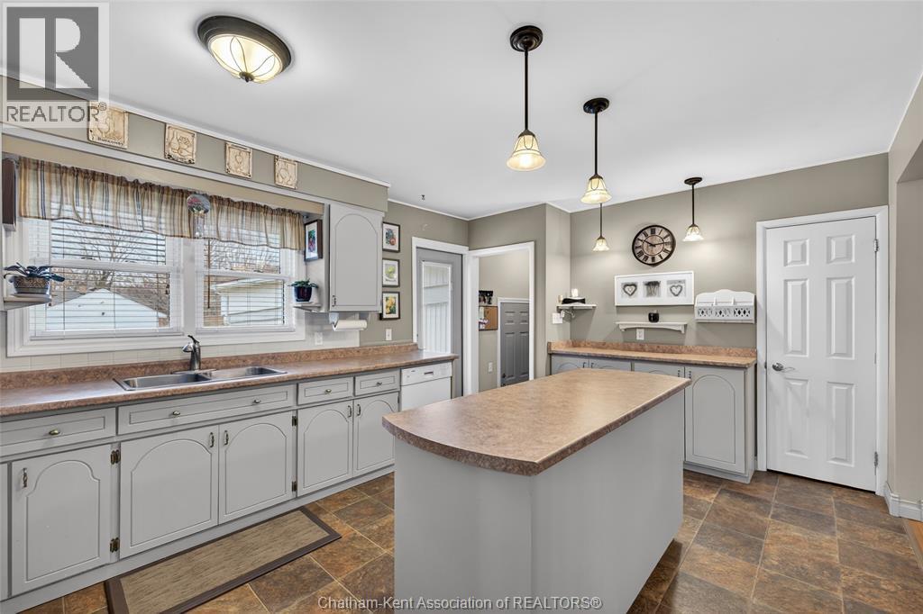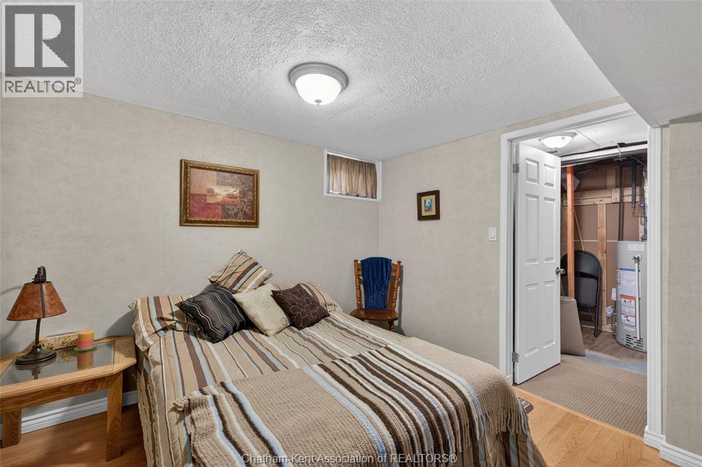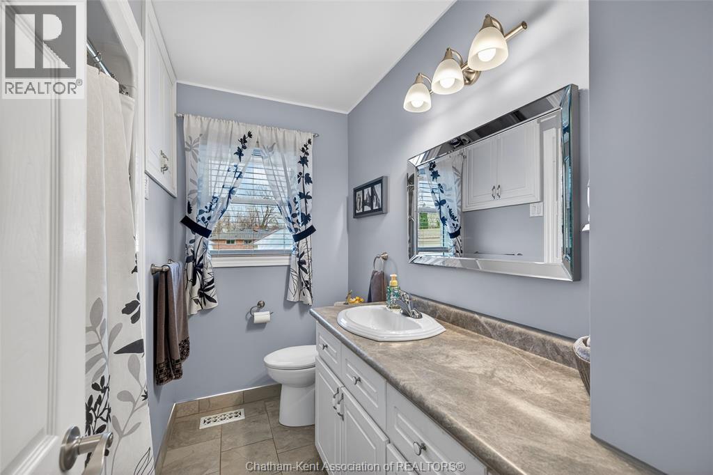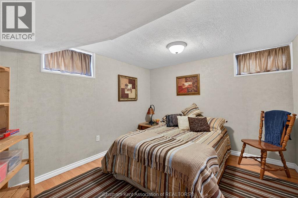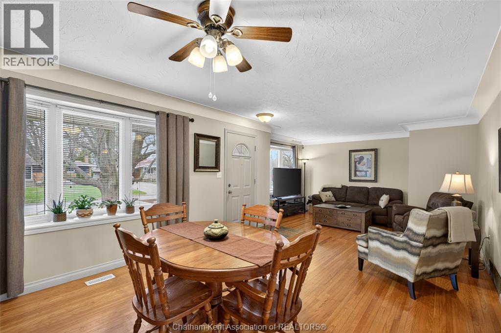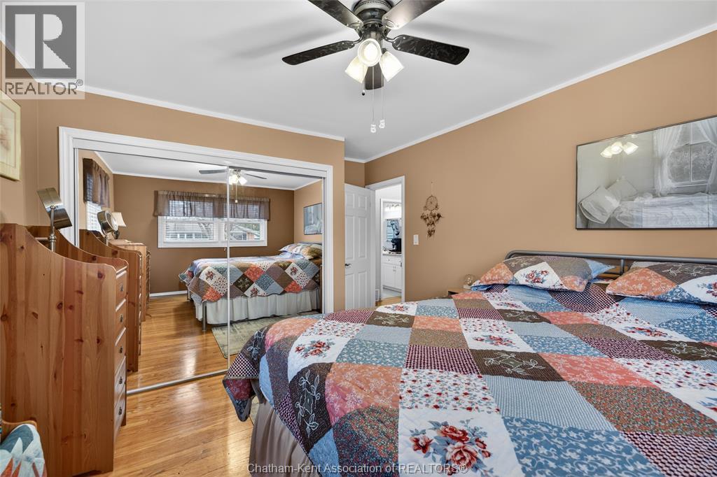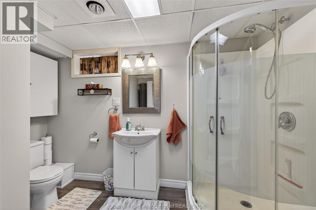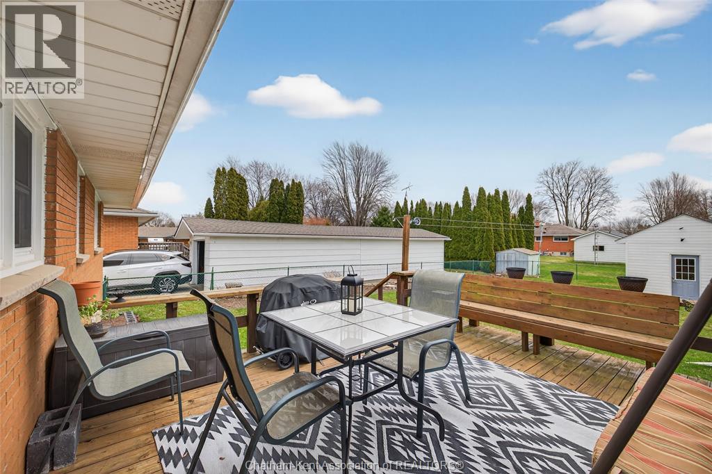 Pride of ownership shows throughout this solid brick bungalow in one of Chatham's most established neighbourhoods — 2 main floor bedrooms, hardwood floors, bright living and dining area, and an updated kitchen with painted cabinetry, centre island, pendant lighting, and mudroom entry with patio doors leading to a rear deck overlooking a beautifully maintained backyard. The main floor 4-piece bath is complemented by a fully finished lower level that genuinely impresses — large rec room with stacked-stone gas fireplace, second living area, 2 additional bedrooms, and a 3-piece bath with glass shower. Four bedrooms total with a layout that suits growing families, multi-generational living, or anyone needing extra space. The oversized attached garage offers serious storage and workspace potential, a separate storage shed adds even more utility, and the wide concrete driveway ties together an outdoor package that's as functional as it is attractive. (id:64974)