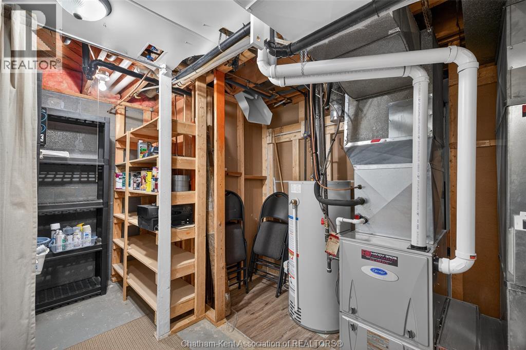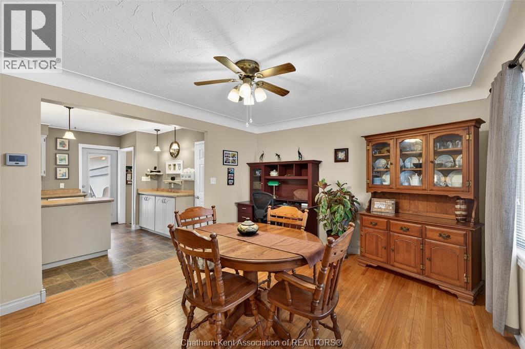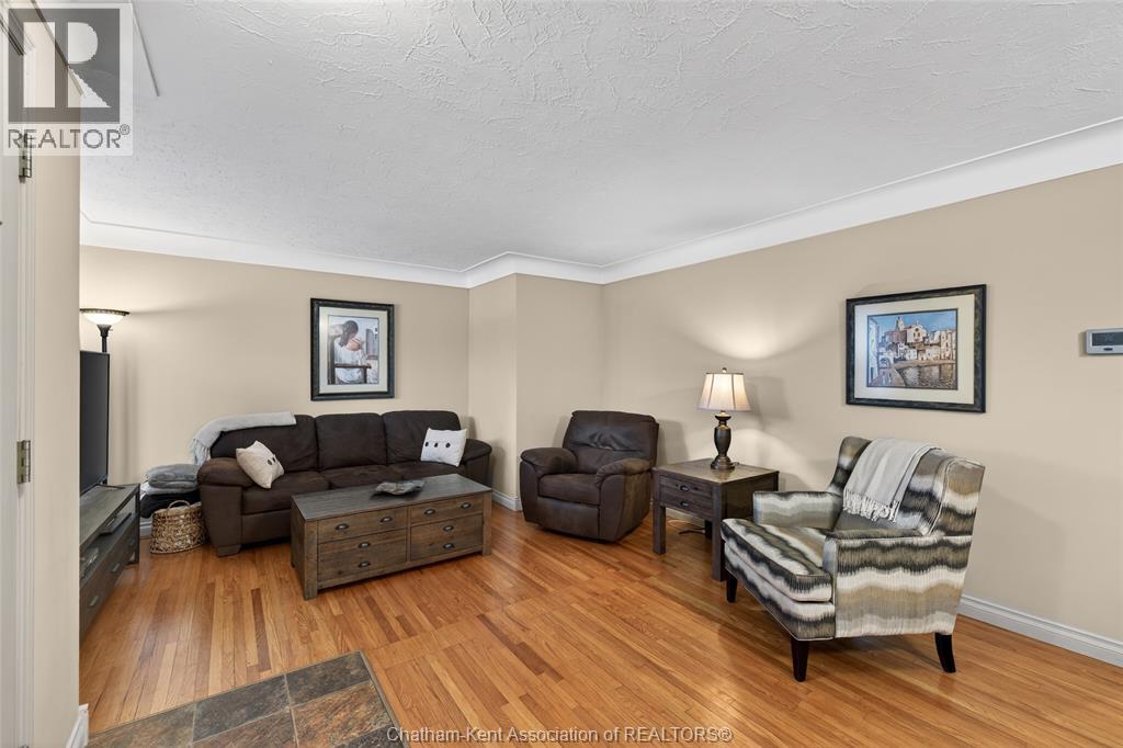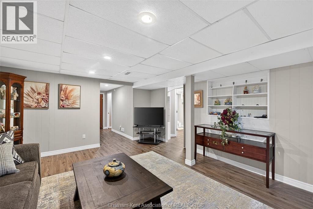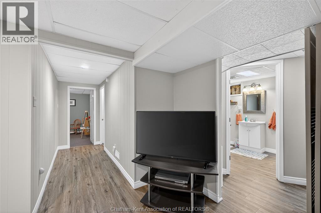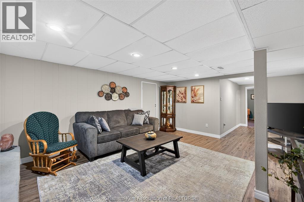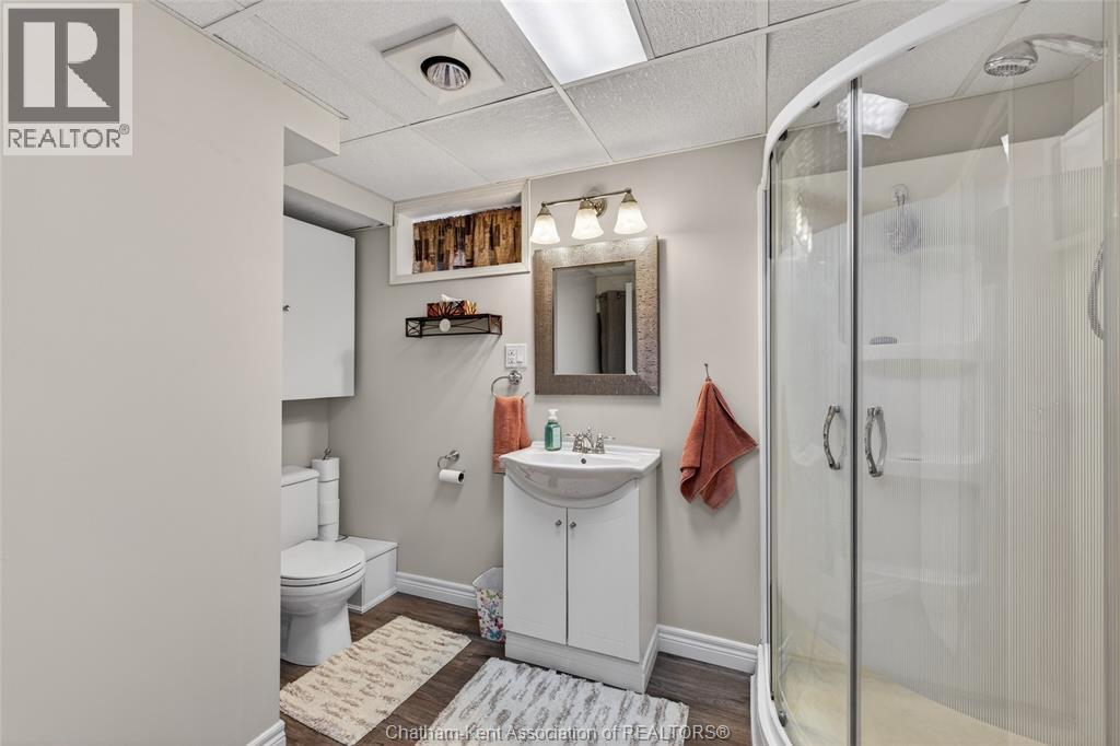 Pride of ownership shows throughout this solid brick bungalow in one of Chatham's most established neighbourhoods — 2 main floor bedrooms, hardwood floors, bright living and dining area, and an updated kitchen with painted cabinetry, centre island, pendant lighting, and mudroom entry with patio doors leading to a rear deck overlooking a beautifully maintained backyard. The main floor 4-piece bath is complemented by a fully finished lower level that genuinely impresses — large rec room with stacked-stone gas fireplace, second living area, 2 additional bedrooms, and a 3-piece bath with glass shower. Four bedrooms total with a layout that suits growing families, multi-generational living, or anyone needing extra space. The oversized attached garage offers serious storage and workspace potential, a separate storage shed adds even more utility, and the wide concrete driveway ties together an outdoor package that's as functional as it is attractive. (id:64974)