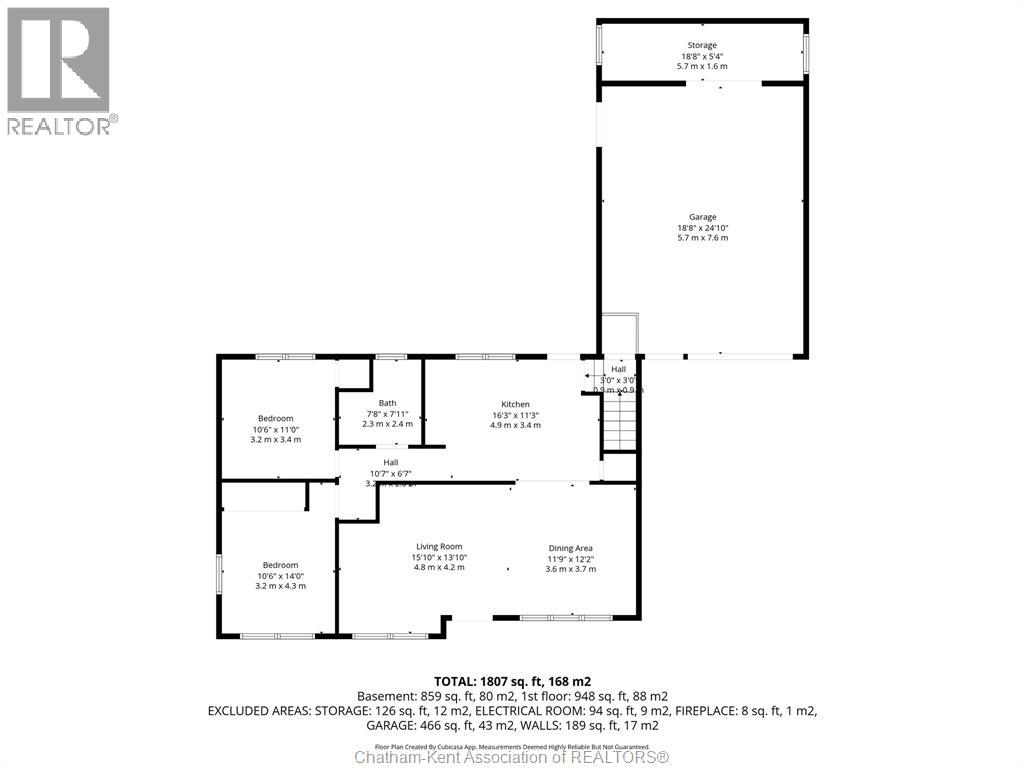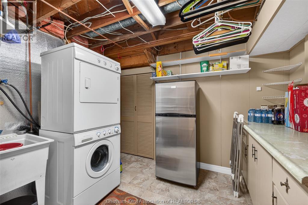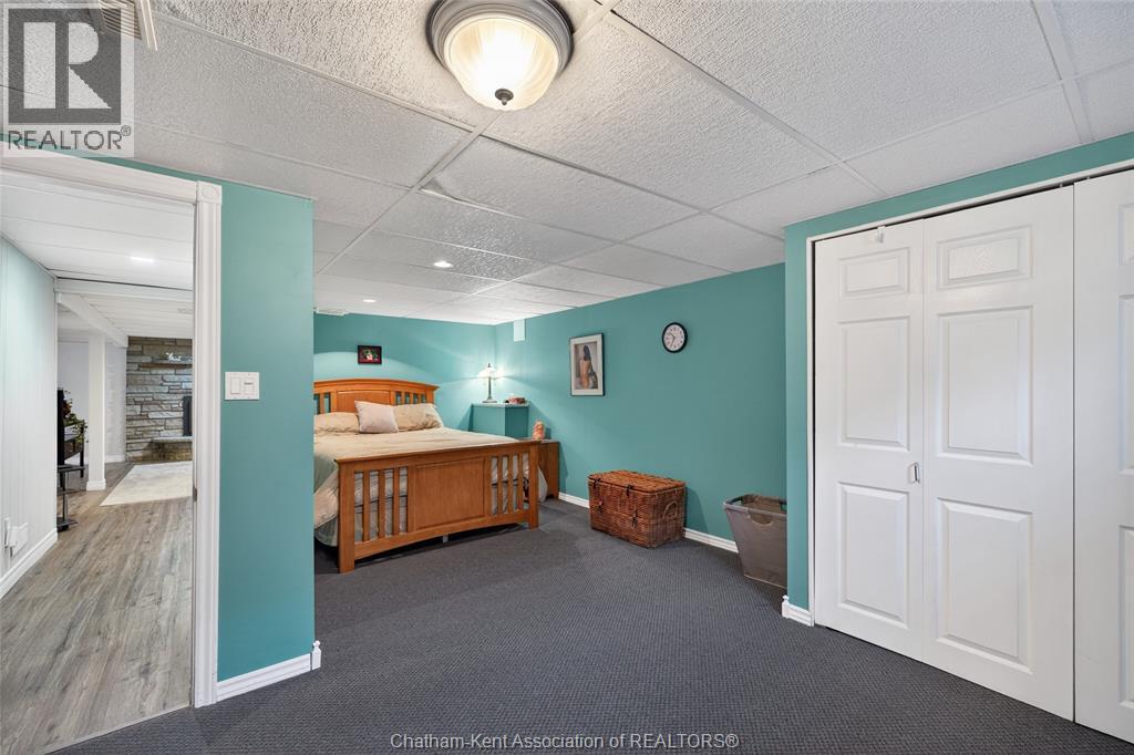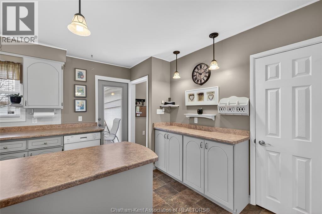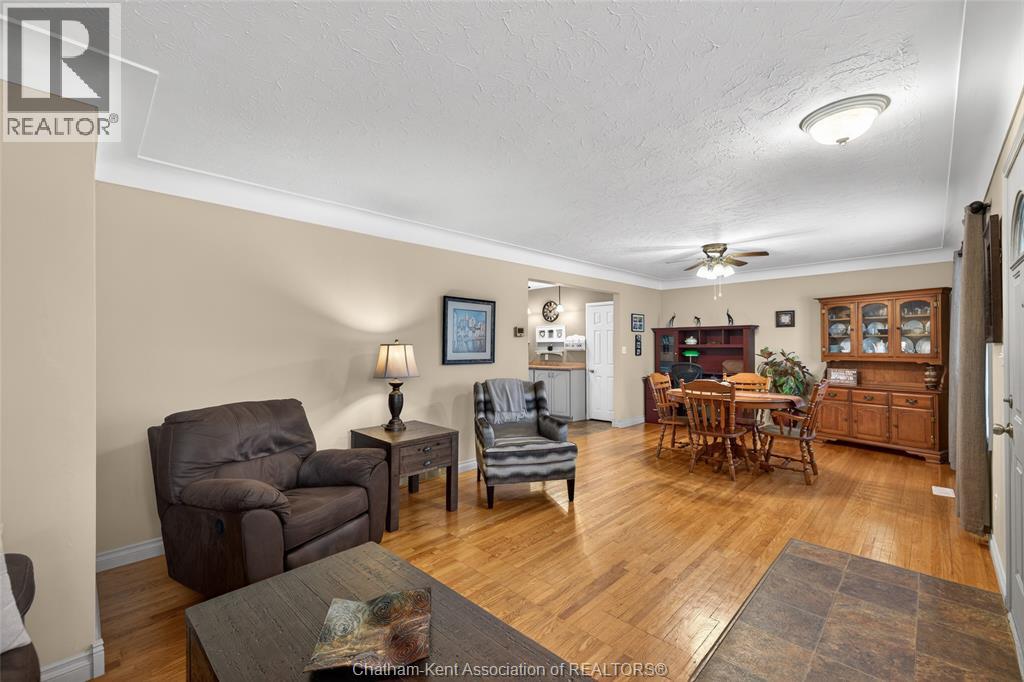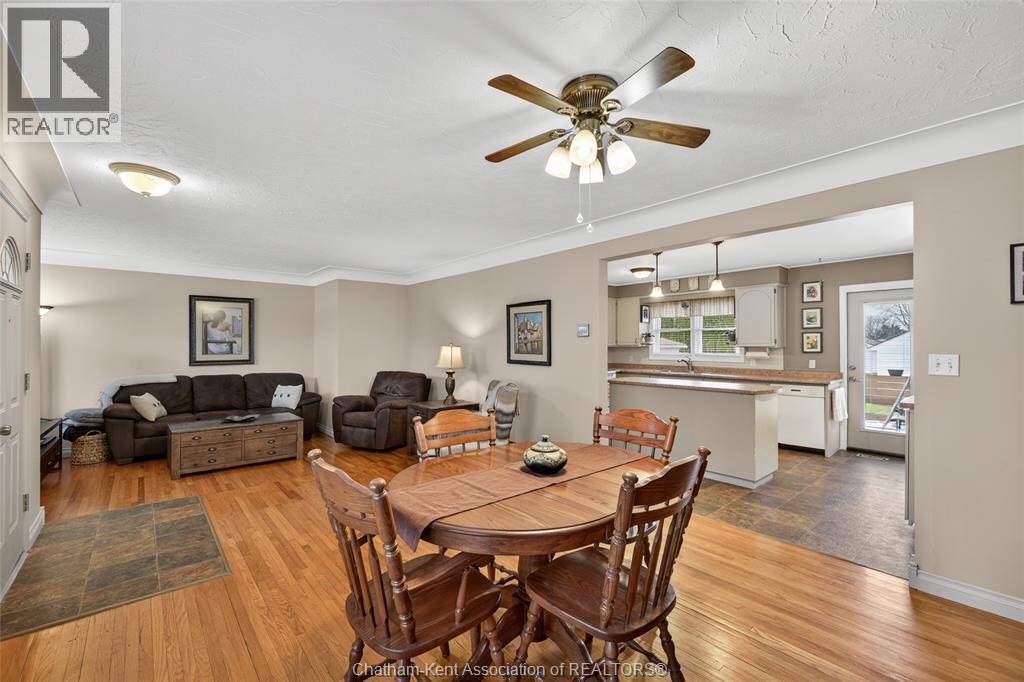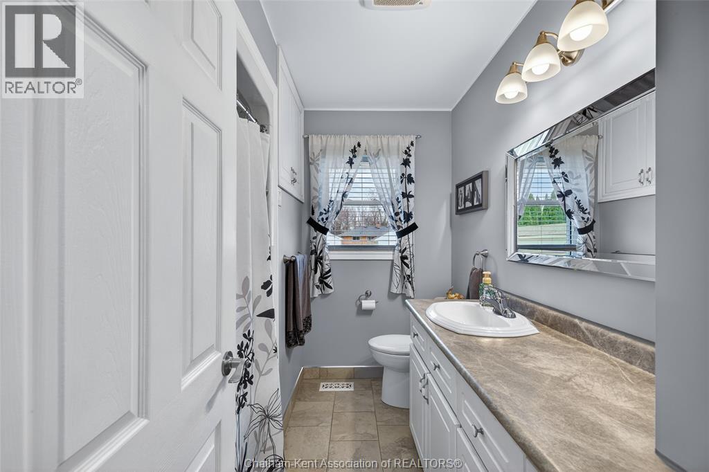 Pride of ownership shows throughout this solid brick bungalow in one of Chatham's most established neighbourhoods — 2 main floor bedrooms, hardwood floors, bright living and dining area, and an updated kitchen with painted cabinetry, centre island, pendant lighting, and mudroom entry with patio doors leading to a rear deck overlooking a beautifully maintained backyard. The main floor 4-piece bath is complemented by a fully finished lower level that genuinely impresses — large rec room with stacked-stone gas fireplace, second living area, 2 additional bedrooms, and a 3-piece bath with glass shower. Four bedrooms total with a layout that suits growing families, multi-generational living, or anyone needing extra space. The oversized attached garage offers serious storage and workspace potential, a separate storage shed adds even more utility, and the wide concrete driveway ties together an outdoor package that's as functional as it is attractive. (id:64974)
