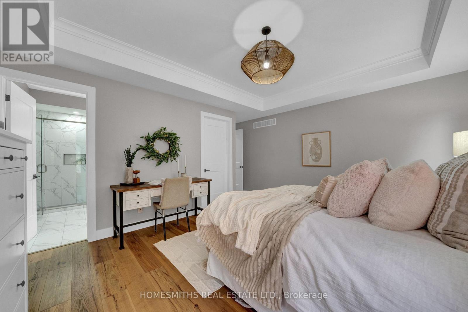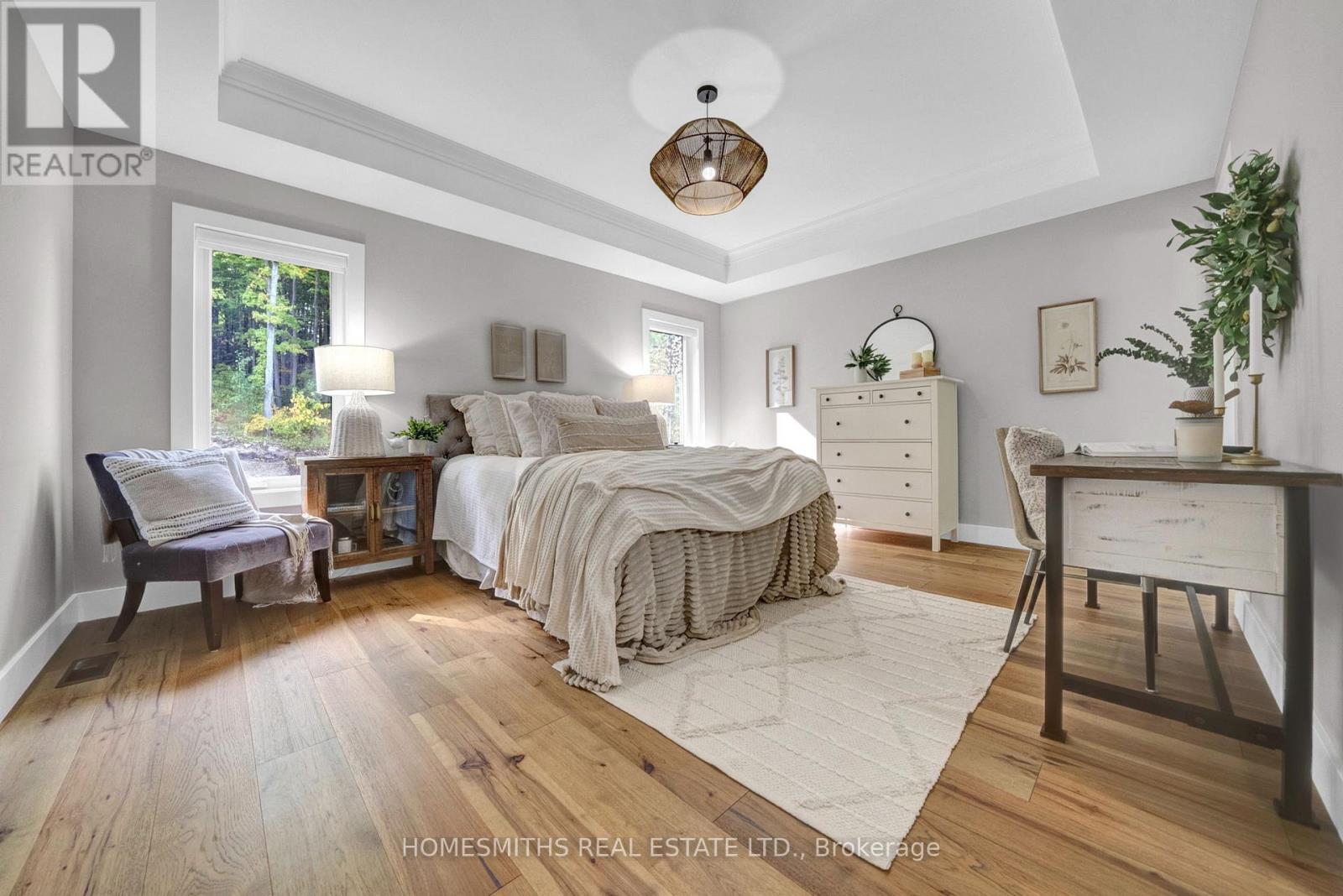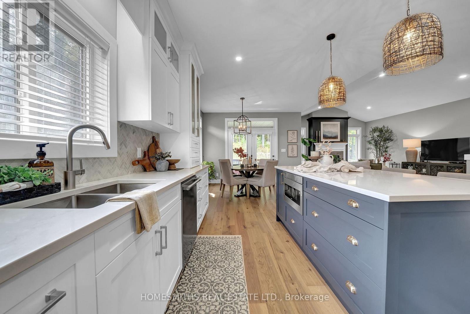This stunning custom built brick-and-stone bungalow was thoughtfully designed with elegance and comfort in mind. Located in the sought after Haven on the Trent, where luxury living meets natural beauty. The main floor boasts an open-concept layout with engineered hardwood throughout, soaring vaulted ceilings, and an abundance of natural light. A versatile formal dining room or office sits at the front of the home, complemented by a stylish powder room.The chef-inspired kitchen features a large centre island with breakfast bar, custom cabinetry, quartz countertops, and premium GE Cafe fridge and stove, seamlessly flowing into the eat-in dining area with a walkout to the deck and professionally landscaped backyard. The great room impresses with a dramatic gas fireplace and vaulted ceilings, perfect for both everyday living and entertaining.The main-floor primary suite overlooks the ravine lot and showcases tray ceilings, a walk-in closet and a 4pc ensuite with double sinks and tiled shower. A second bedroom on the main level also enjoys its own private 4pc ensuite. Convenient main-floor laundry/mudroom with garage access completes this level.The lower level is bright and inviting, with above-grade windows, a spacious rec room, a bar area with rough-in for sink, a full 3pc bathroom, and two additional bedrooms one with a soundproof walk-in closet ideal for musicians or gamers, and another featuring two oversized walk-in closets. Outdoors, enjoy a fenced backyard oasis with professional landscaping, this 250ft deep lot is perfect for relaxing or entertaining. Ideally located, this home offers the best of both worlds peaceful nature and everyday convenience. Just steps from the Trent River, scenic trails, and Sunny Life Recreation & Wellness Centre, and close to Seymour Conservation Area, Ferris Provincial Park, the suspension bridge, downtown Campbellford shops, bakeries, and the hospital.This is more than just a home its a lifestyle. (id:64974)