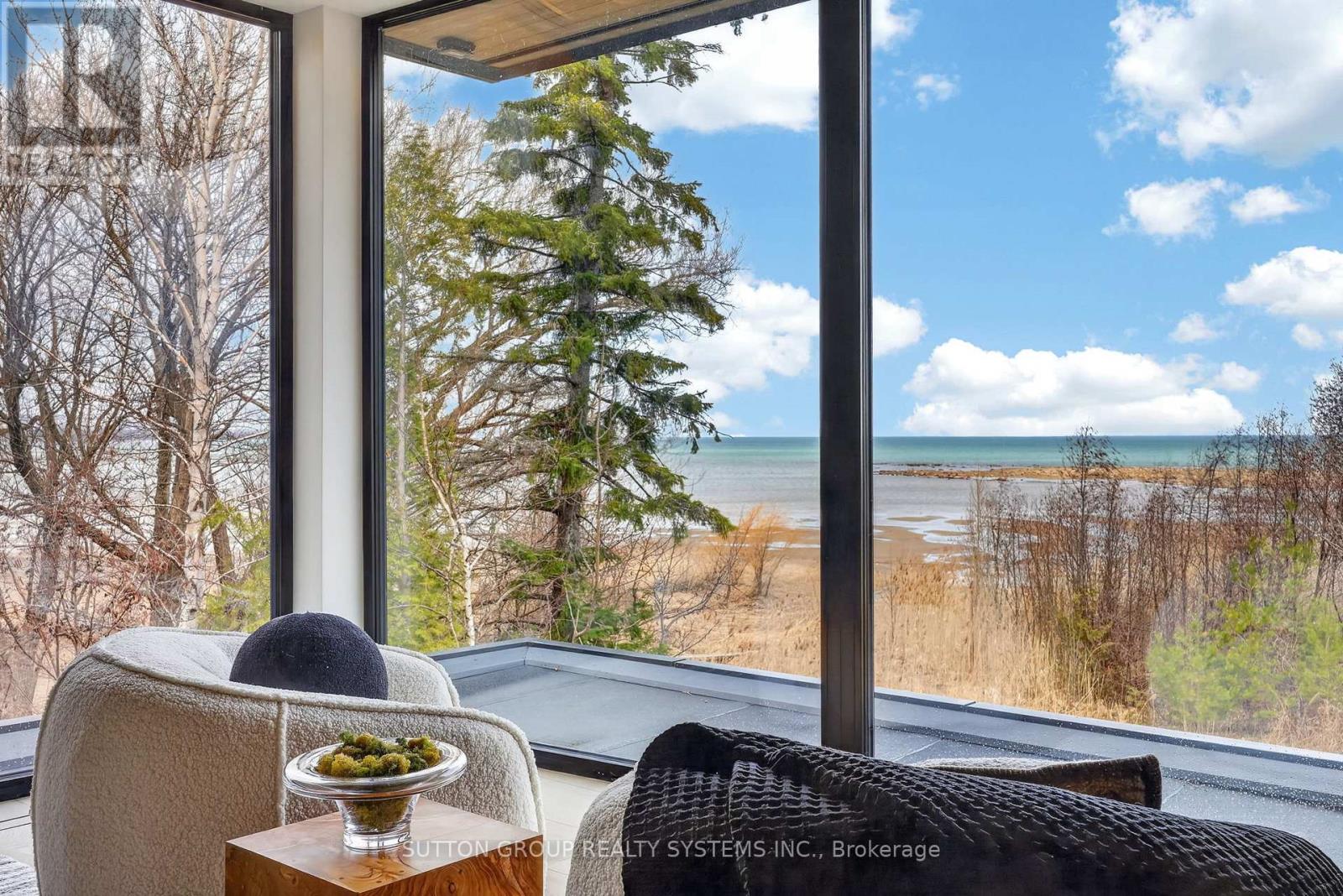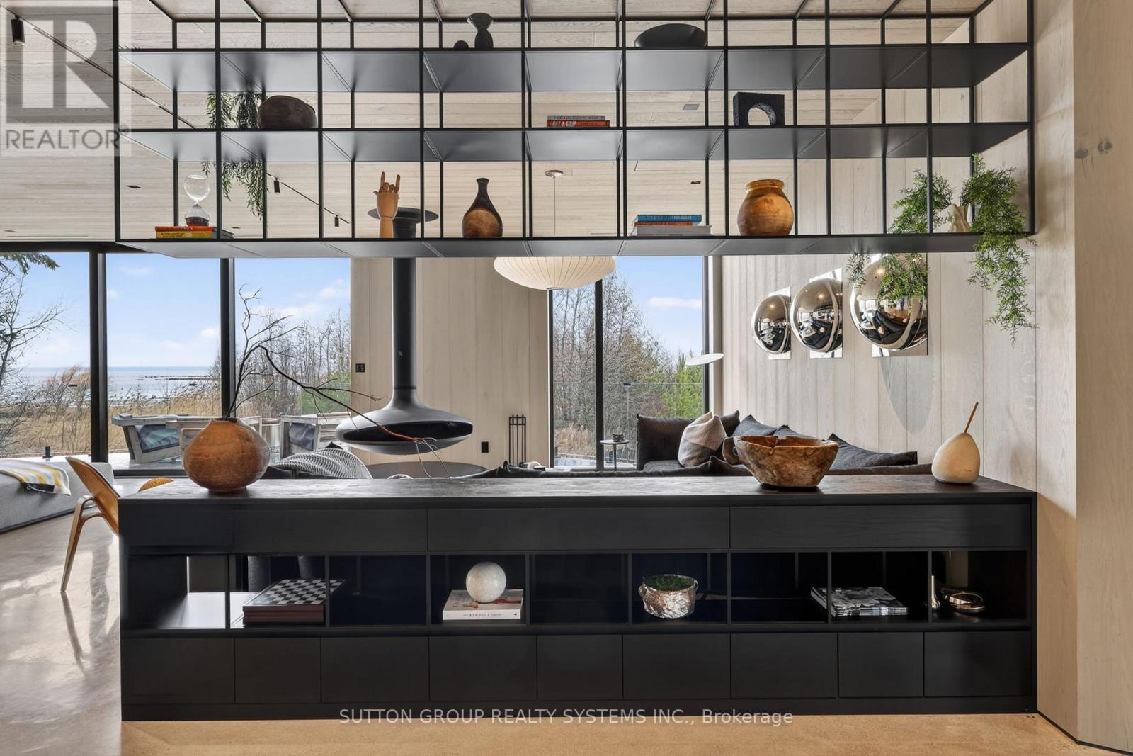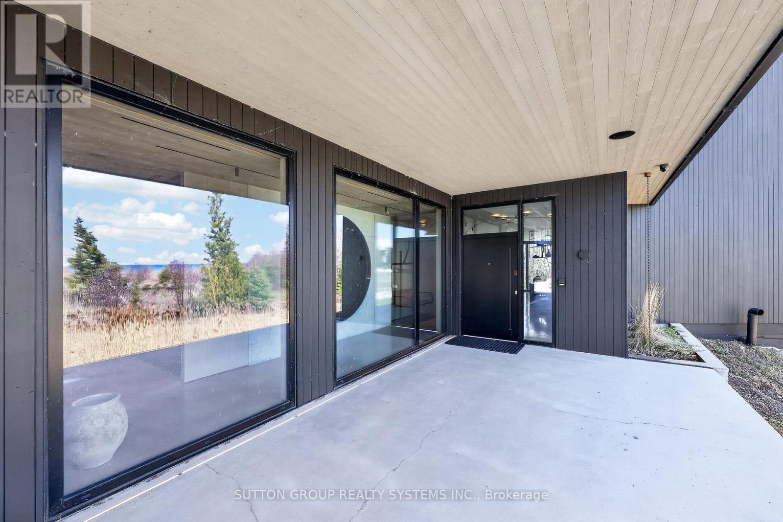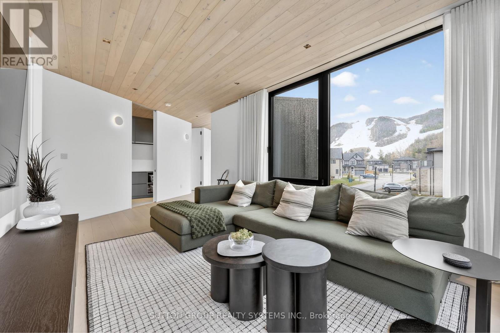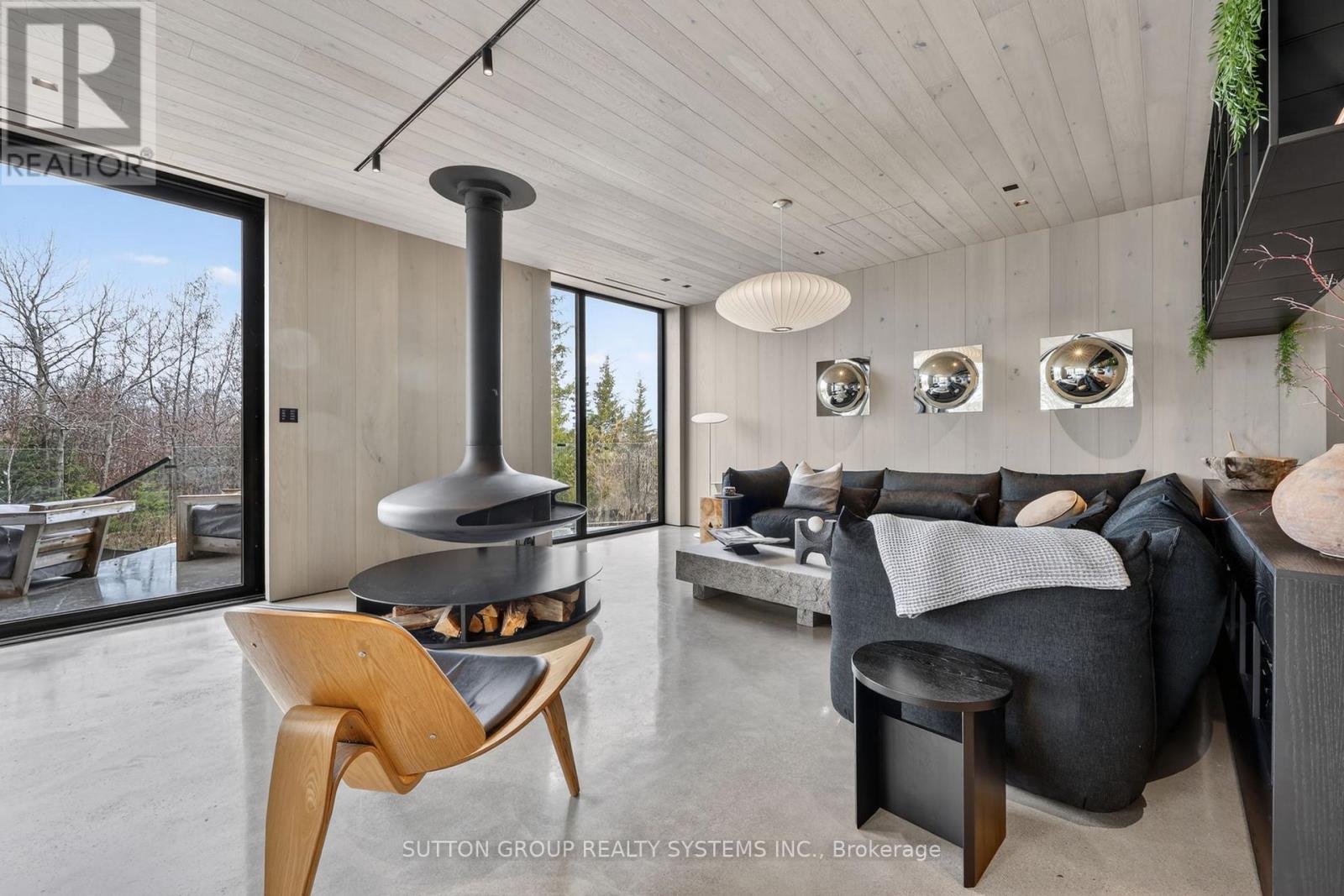 Exceptional newly built, custom-crafted 2-storey residence, ideally positioned between the shores of Georgian Bay and the ski slopes of Georgian Peaks. Designed by Foreshew Design Associates this 4-bedroom, 3.5-bath home showcases a seamless blend of modern architecture, premium materials and advanced technology. Exterior features include striking black thermal pine siding, durable metal roof & energy-efficient Drutex triple-pane windows & doors. Fully integrated Lutron&Control 4 system w/ multiple control panels provides effortless control of lighting & ambiance throughout. Open-concept main level is designed for both everyday living & entertaining, featuring dramatic floor-to-ceiling windows an iconic floating wood-burning fireplace, custom metal shelving & built-in cabinetry. Heated polished concrete floors w/hydronic radiant heating extend throughout main level & into garage. Designer kitchen by Chervin Kitchen & Bath offers panelled 36" JennAir fridge, 36" Bosch gas range, marble countertops & backsplash and two panelled drawer dishwashers by Fisher & Paykel. Hidden coffee station with double fridge/freezer drawers and automated pocket doors along with spacious walk-in pantry adds both style & functionality. Additional main floor features include soundproof gym with dedicated ventilation system and Elkay bottle filling station as well as designer powder room with statement finishes. Outdoors heated driveway & walkways with snow-melt system ensure low-maintenance winter living. Upper level offers bright family room with custom built-ins, luxurious primary retreat featuring vaulted ceilings, refined finishes, private loft space ideal for meditation, reading or quiet retreat, custom walk-in closet and spa-inspired 5-piece ensuite with walk-in glass shower & integrated tub. Three additional bedrooms, two bathrooms and second-floor laundry complete upper level. Rare offering combining design, comfort and unbeatable four-season lifestyle steps to water & slopes! (id:64974)