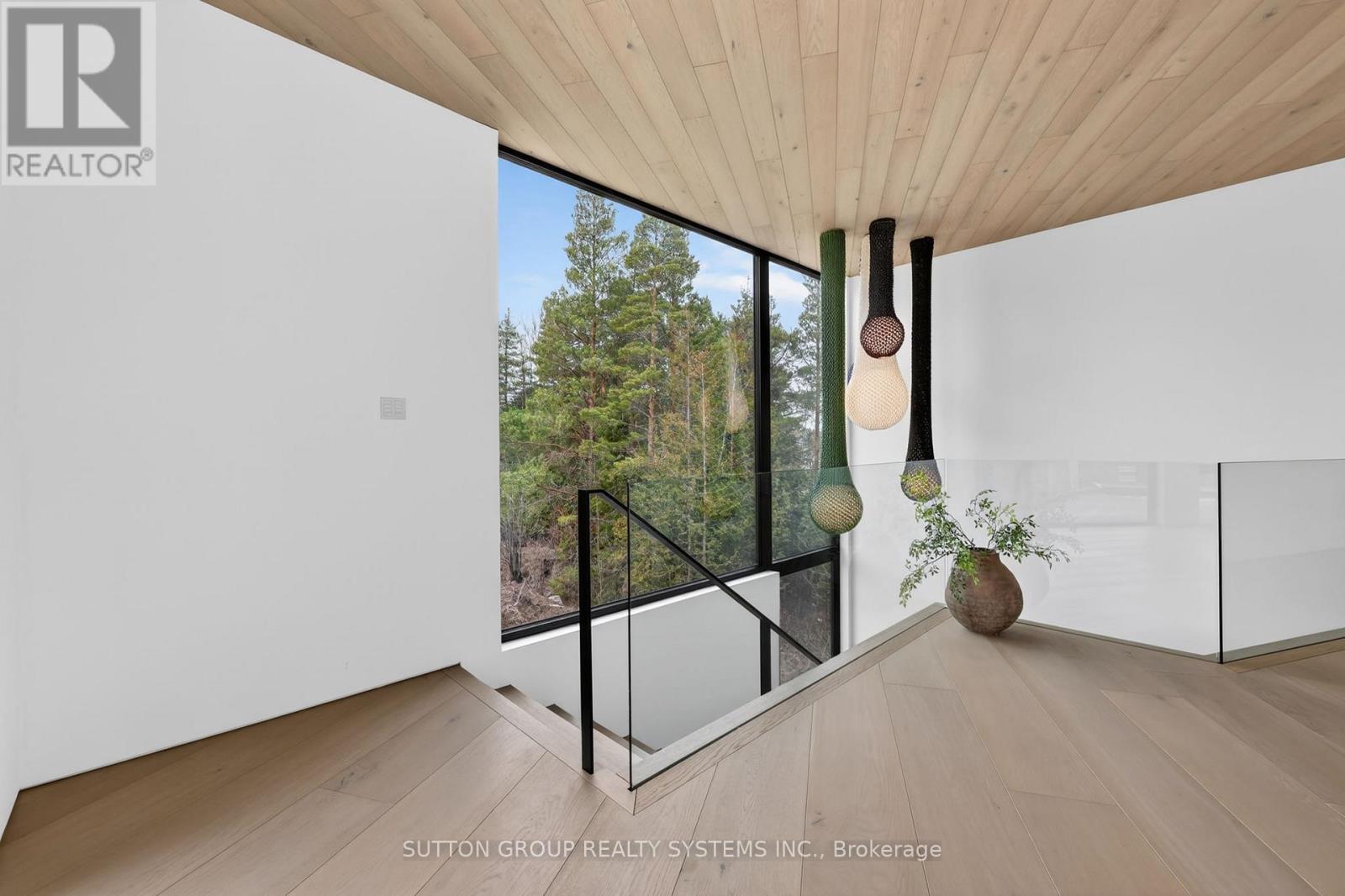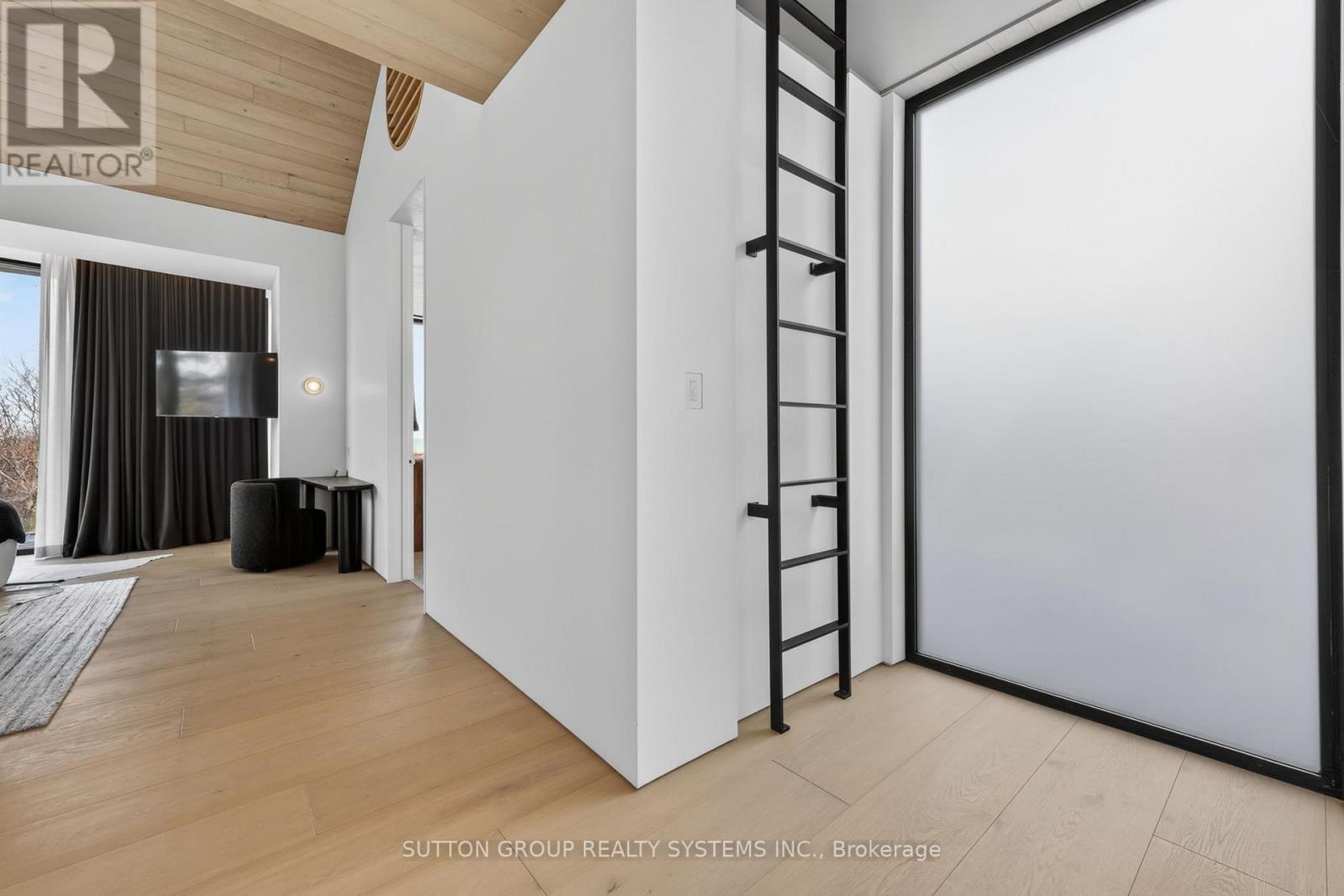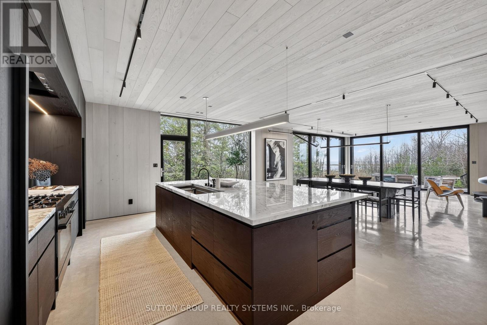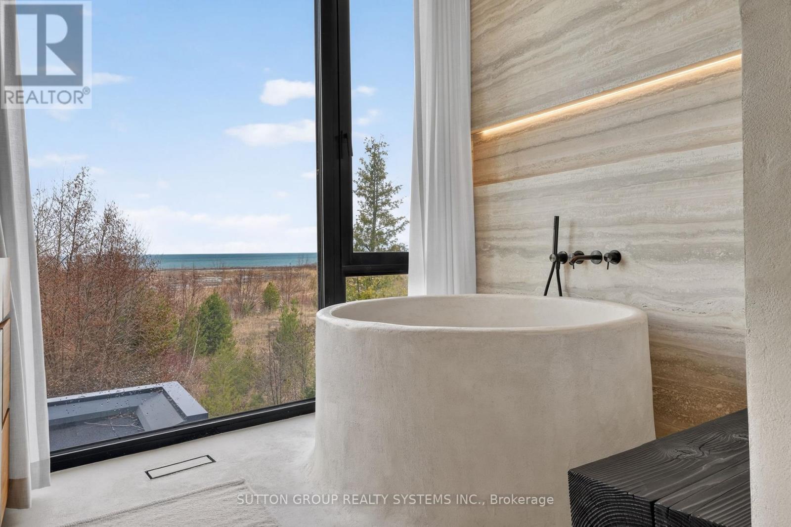 Exceptional newly built, custom-crafted 2-storey residence, ideally positioned between the shores of Georgian Bay and the ski slopes of Georgian Peaks. Designed by Foreshew Design Associates this 4-bedroom, 3.5-bath home showcases a seamless blend of modern architecture, premium materials and advanced technology. Exterior features include striking black thermal pine siding, durable metal roof & energy-efficient Drutex triple-pane windows & doors. Fully integrated Lutron&Control 4 system w/ multiple control panels provides effortless control of lighting & ambiance throughout. Open-concept main level is designed for both everyday living & entertaining, featuring dramatic floor-to-ceiling windows an iconic floating wood-burning fireplace, custom metal shelving & built-in cabinetry. Heated polished concrete floors w/hydronic radiant heating extend throughout main level & into garage. Designer kitchen by Chervin Kitchen & Bath offers panelled 36" JennAir fridge, 36" Bosch gas range, marble countertops & backsplash and two panelled drawer dishwashers by Fisher & Paykel. Hidden coffee station with double fridge/freezer drawers and automated pocket doors along with spacious walk-in pantry adds both style & functionality. Additional main floor features include soundproof gym with dedicated ventilation system and Elkay bottle filling station as well as designer powder room with statement finishes. Outdoors heated driveway & walkways with snow-melt system ensure low-maintenance winter living. Upper level offers bright family room with custom built-ins, luxurious primary retreat featuring vaulted ceilings, refined finishes, private loft space ideal for meditation, reading or quiet retreat, custom walk-in closet and spa-inspired 5-piece ensuite with walk-in glass shower & integrated tub. Three additional bedrooms, two bathrooms and second-floor laundry complete upper level. Rare offering combining design, comfort and unbeatable four-season lifestyle steps to water & slopes! (id:64974)
