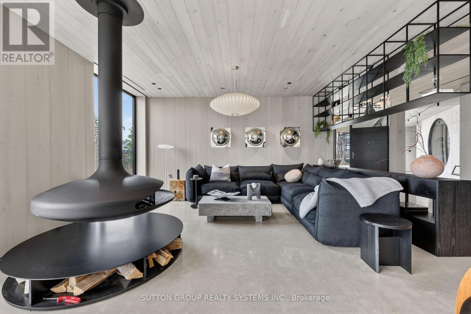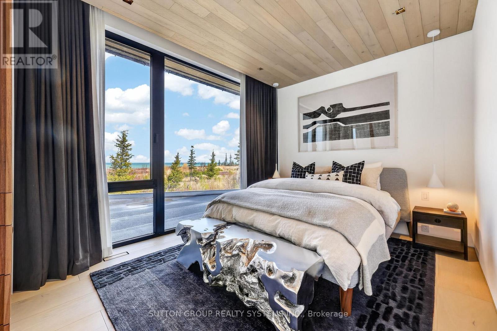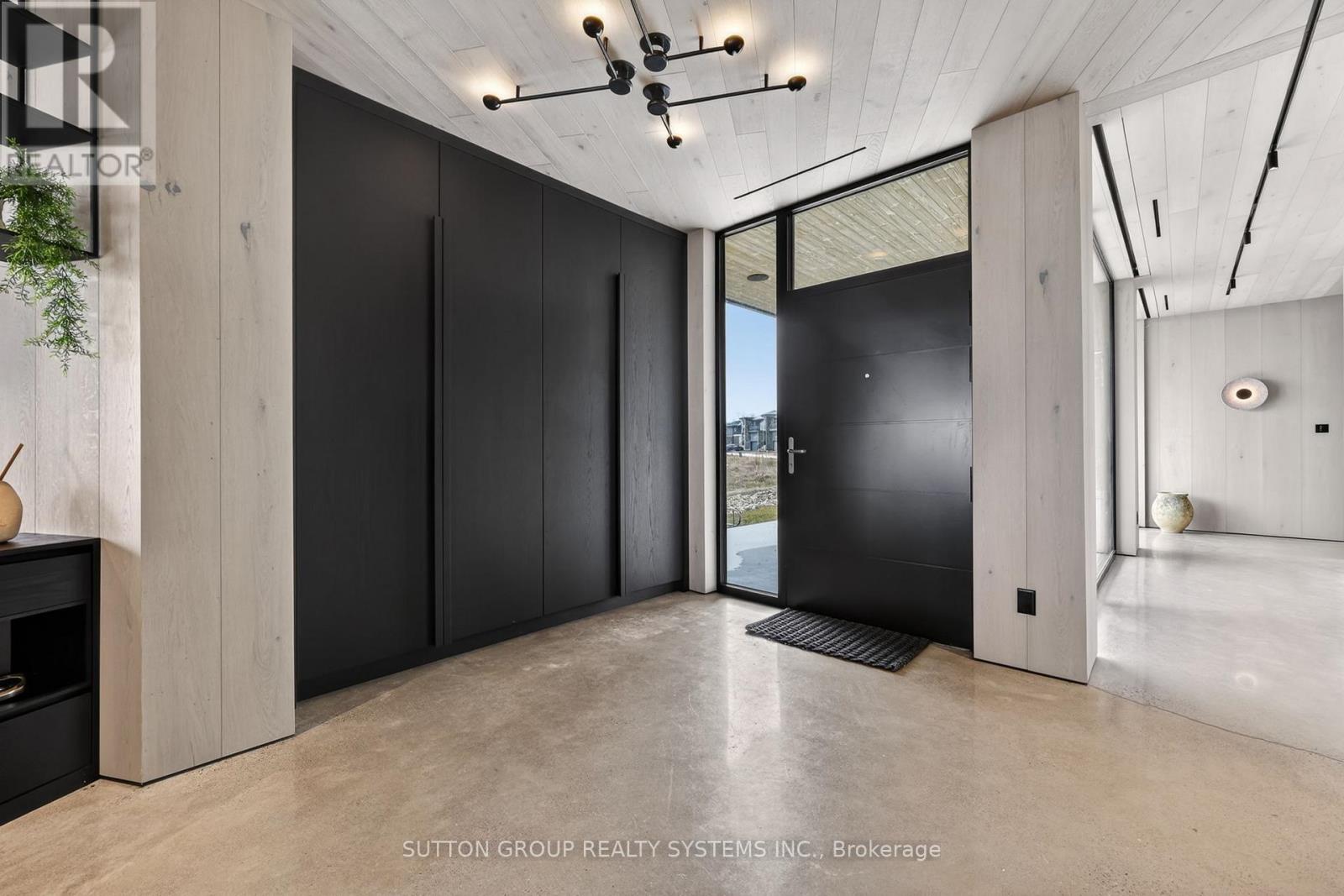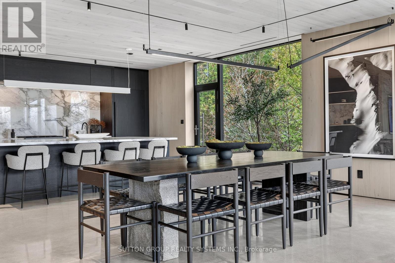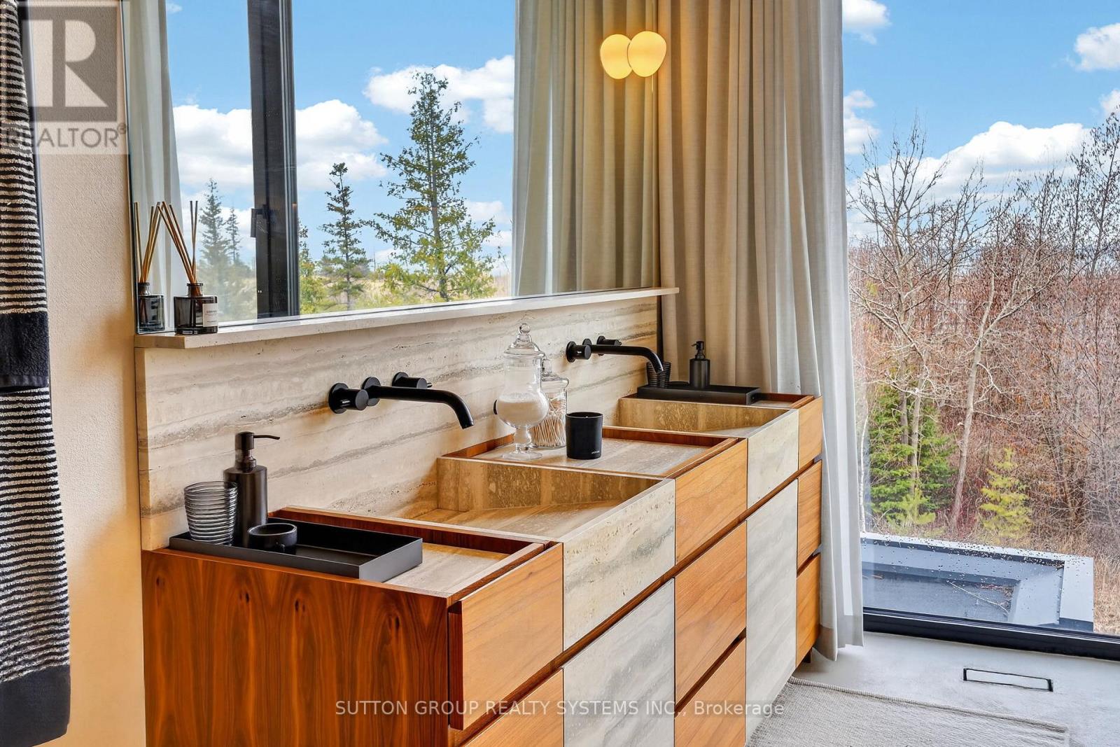 Exceptional newly built, custom-crafted 2-storey residence, ideally positioned between the shores of Georgian Bay and the ski slopes of Georgian Peaks. Designed by Foreshew Design Associates this 4-bedroom, 3.5-bath home showcases a seamless blend of modern architecture, premium materials and advanced technology. Exterior features include striking black thermal pine siding, durable metal roof & energy-efficient Drutex triple-pane windows & doors. Fully integrated Lutron&Control 4 system w/ multiple control panels provides effortless control of lighting & ambiance throughout. Open-concept main level is designed for both everyday living & entertaining, featuring dramatic floor-to-ceiling windows an iconic floating wood-burning fireplace, custom metal shelving & built-in cabinetry. Heated polished concrete floors w/hydronic radiant heating extend throughout main level & into garage. Designer kitchen by Chervin Kitchen & Bath offers panelled 36" JennAir fridge, 36" Bosch gas range, marble countertops & backsplash and two panelled drawer dishwashers by Fisher & Paykel. Hidden coffee station with double fridge/freezer drawers and automated pocket doors along with spacious walk-in pantry adds both style & functionality. Additional main floor features include soundproof gym with dedicated ventilation system and Elkay bottle filling station as well as designer powder room with statement finishes. Outdoors heated driveway & walkways with snow-melt system ensure low-maintenance winter living. Upper level offers bright family room with custom built-ins, luxurious primary retreat featuring vaulted ceilings, refined finishes, private loft space ideal for meditation, reading or quiet retreat, custom walk-in closet and spa-inspired 5-piece ensuite with walk-in glass shower & integrated tub. Three additional bedrooms, two bathrooms and second-floor laundry complete upper level. Rare offering combining design, comfort and unbeatable four-season lifestyle steps to water & slopes! (id:64974)