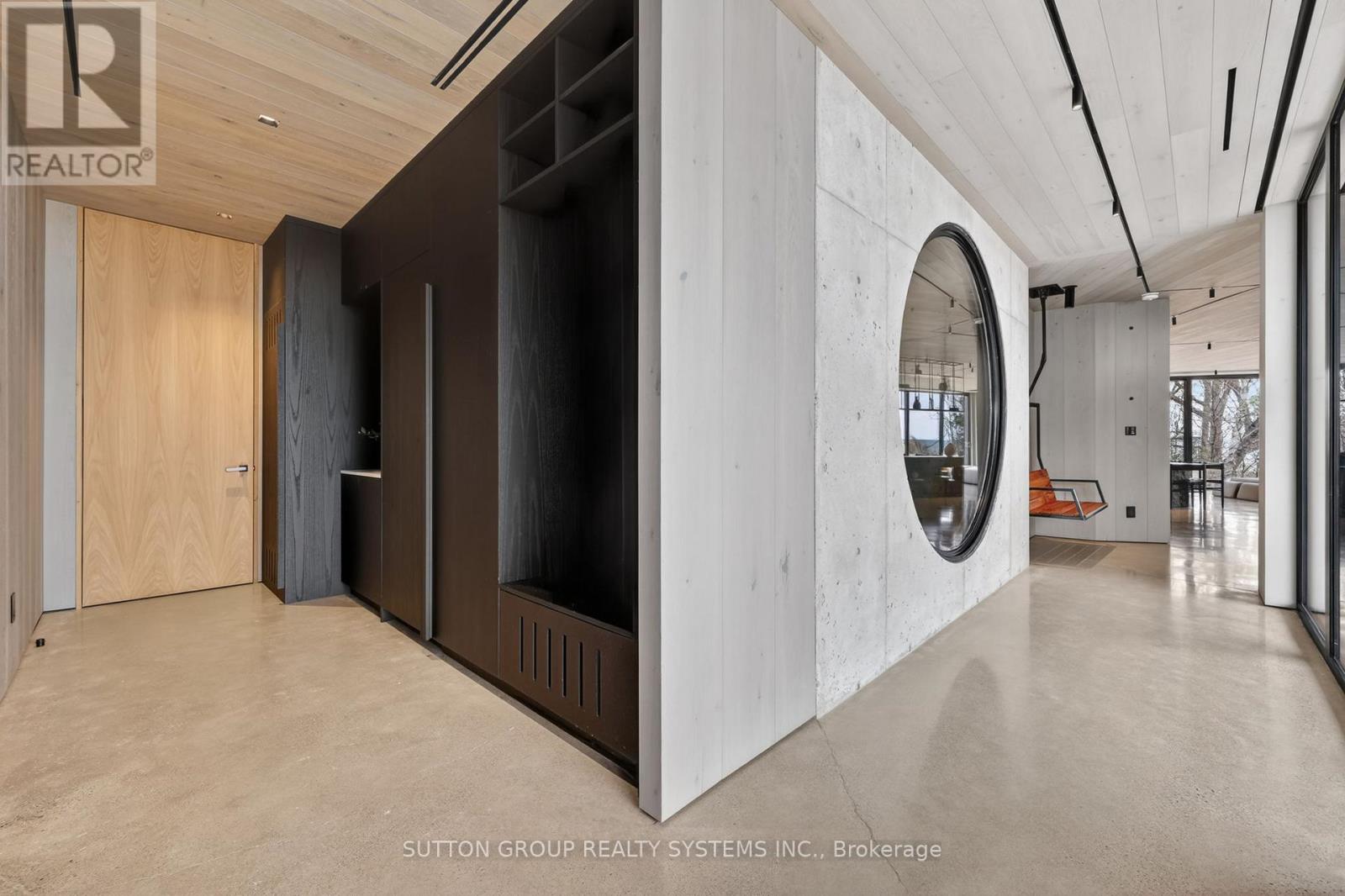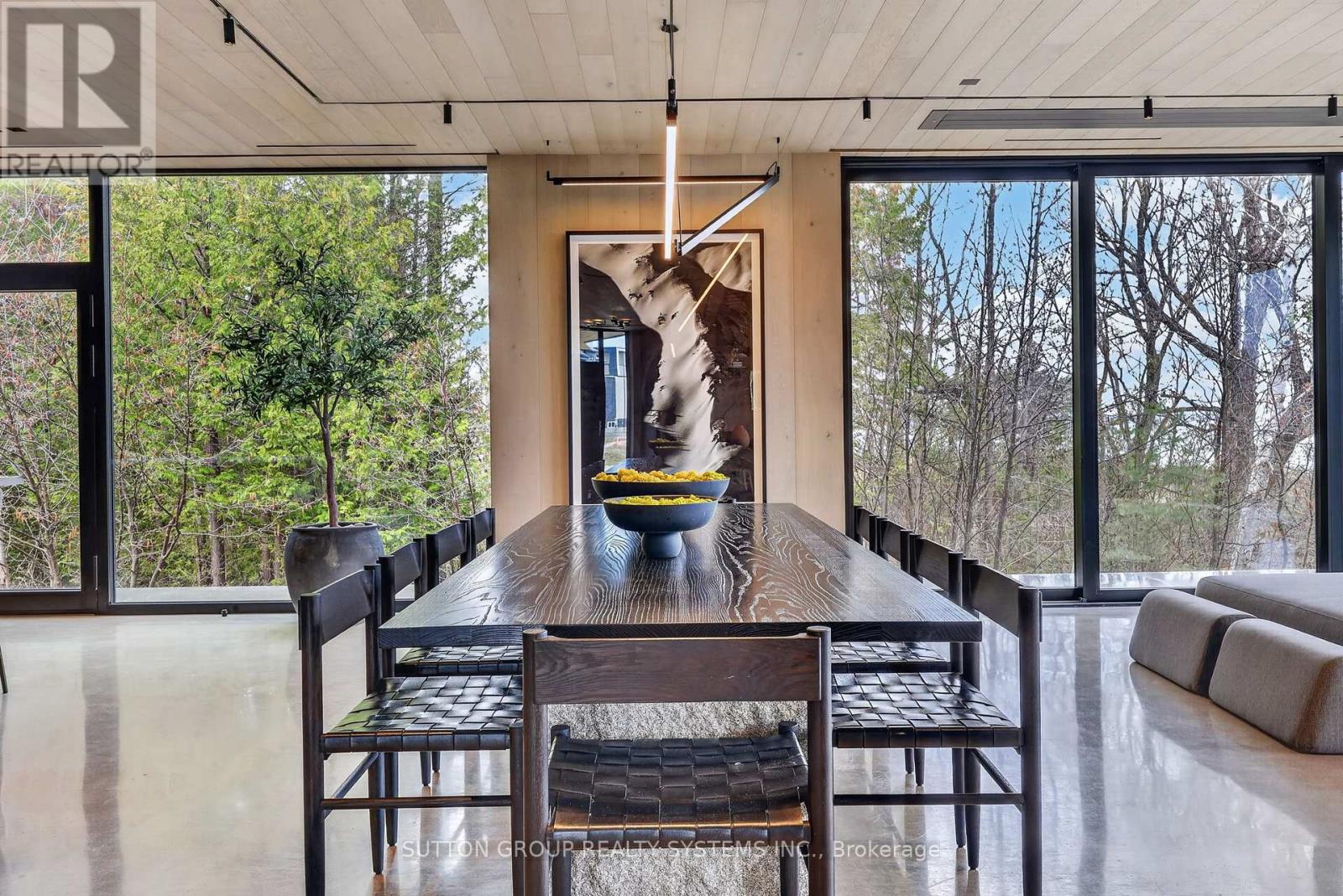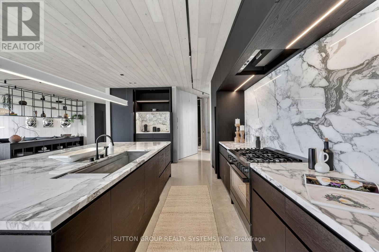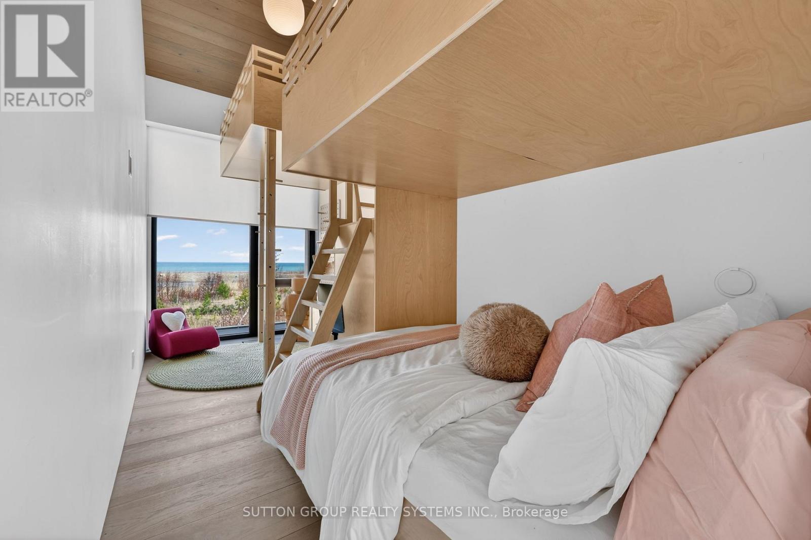 Exceptional newly built, custom-crafted 2-storey residence, ideally positioned between the shores of Georgian Bay and the ski slopes of Georgian Peaks. Designed by Foreshew Design Associates this 4-bedroom, 3.5-bath home showcases a seamless blend of modern architecture, premium materials and advanced technology. Exterior features include striking black thermal pine siding, durable metal roof & energy-efficient Drutex triple-pane windows & doors. Fully integrated Lutron&Control 4 system w/ multiple control panels provides effortless control of lighting & ambiance throughout. Open-concept main level is designed for both everyday living & entertaining, featuring dramatic floor-to-ceiling windows an iconic floating wood-burning fireplace, custom metal shelving & built-in cabinetry. Heated polished concrete floors w/hydronic radiant heating extend throughout main level & into garage. Designer kitchen by Chervin Kitchen & Bath offers panelled 36" JennAir fridge, 36" Bosch gas range, marble countertops & backsplash and two panelled drawer dishwashers by Fisher & Paykel. Hidden coffee station with double fridge/freezer drawers and automated pocket doors along with spacious walk-in pantry adds both style & functionality. Additional main floor features include soundproof gym with dedicated ventilation system and Elkay bottle filling station as well as designer powder room with statement finishes. Outdoors heated driveway & walkways with snow-melt system ensure low-maintenance winter living. Upper level offers bright family room with custom built-ins, luxurious primary retreat featuring vaulted ceilings, refined finishes, private loft space ideal for meditation, reading or quiet retreat, custom walk-in closet and spa-inspired 5-piece ensuite with walk-in glass shower & integrated tub. Three additional bedrooms, two bathrooms and second-floor laundry complete upper level. Rare offering combining design, comfort and unbeatable four-season lifestyle steps to water & slopes! (id:64974)