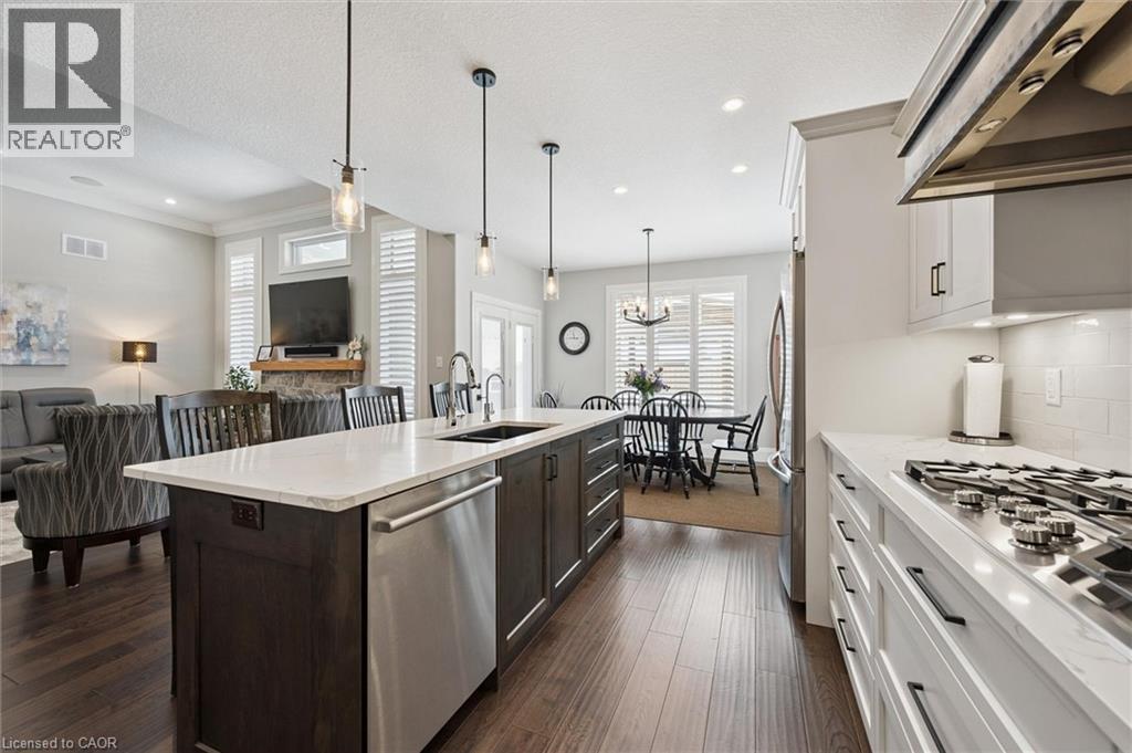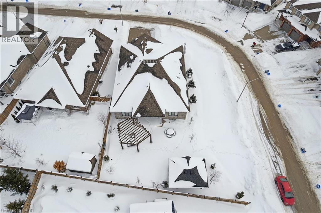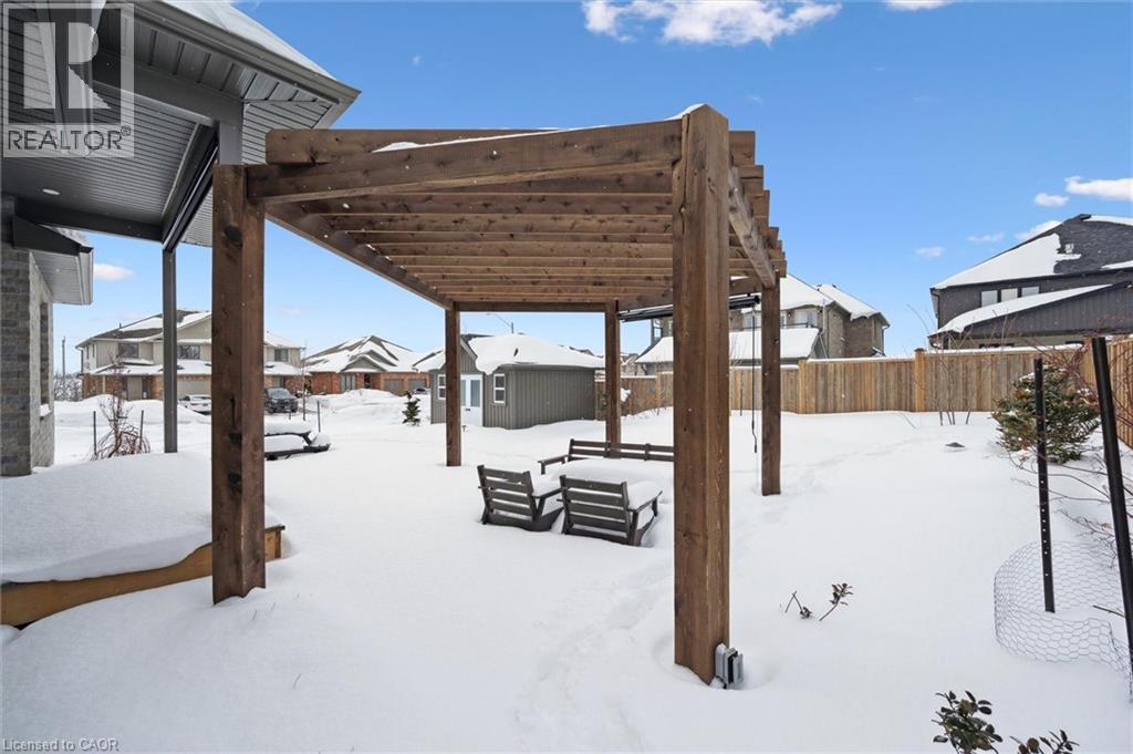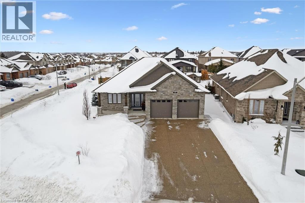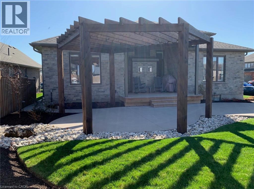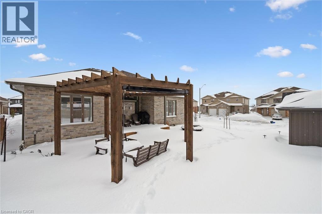 This CAPTIVATING custom- built bungalow has been lovingly maintained and cared for by the original owners. You'll love the stunning kitchen with white cupboards, elegant creamy white quartz counter tops, custom range hood crafted by Thak Ironworks, lots of storage and workspace, a spacious walk-in pantry, and a huge center island in contrasting wood. Gracious entertaining can be yours in the elegant dining room with large windows to offer a romantic setting for special moments. Here you will also find the entrance to the back porch overlooking the tranquil yard. The welcoming great room boasts engineered hardwood floors, soaring ceilings and large windows flanking the cozy gas stone fireplace. Relax and unwind in the tranquil primary bedroom retreat with large walk-in closet and inviting primary spa bath with deep soaker tub and separate shower. You'll appreciate the convenience of the main floor laundry that you can access off the garage and the kitchen, a second main floor bedroom with spacious closet and an additional full bath. Be comfy-cozy by the rustic stone fireplace in the spacious rec room designed for informal gatherings and room for a pool table. The basement also features 2 roomy bedrooms, a full bath, loads of storage and staircase to insulated double garage! Enjoy cool summer evenings on the lovely back porch or under the pergola with a picturesque view of the lawn and gardens. Apollo Shade Screens on back patio and pergola. Ambient garden lights throughout. Custom 12' x 16' shed. Quality craftmanship by Stroh Homes! Desirably located close to the school, scenic walking trails, gently rolling hills and valleys and the meandering Nith River. HOUSE AND GARDEN! (id:64974)