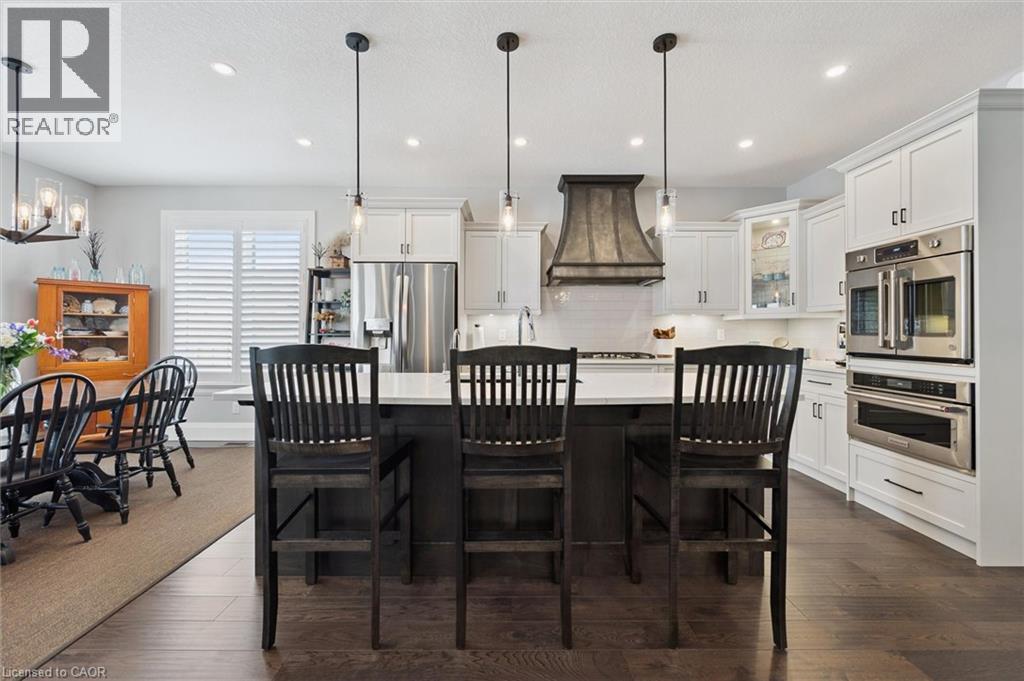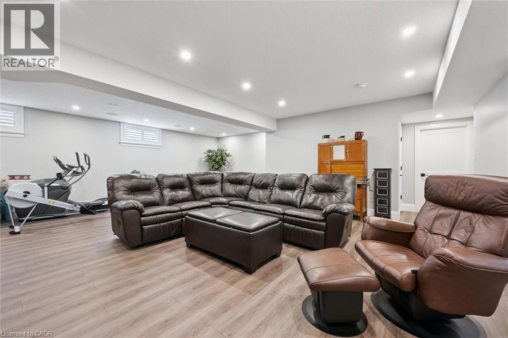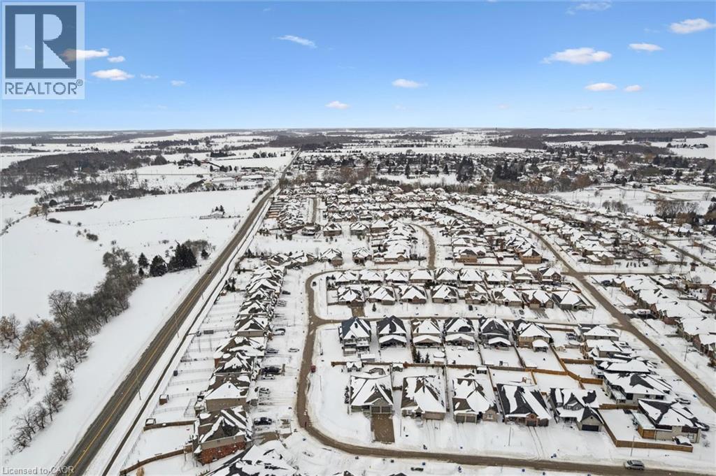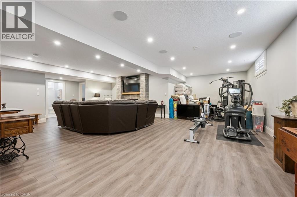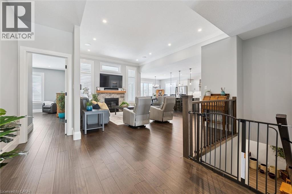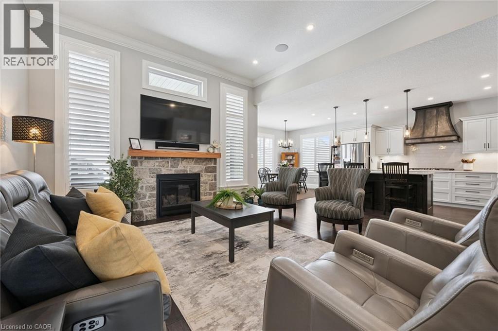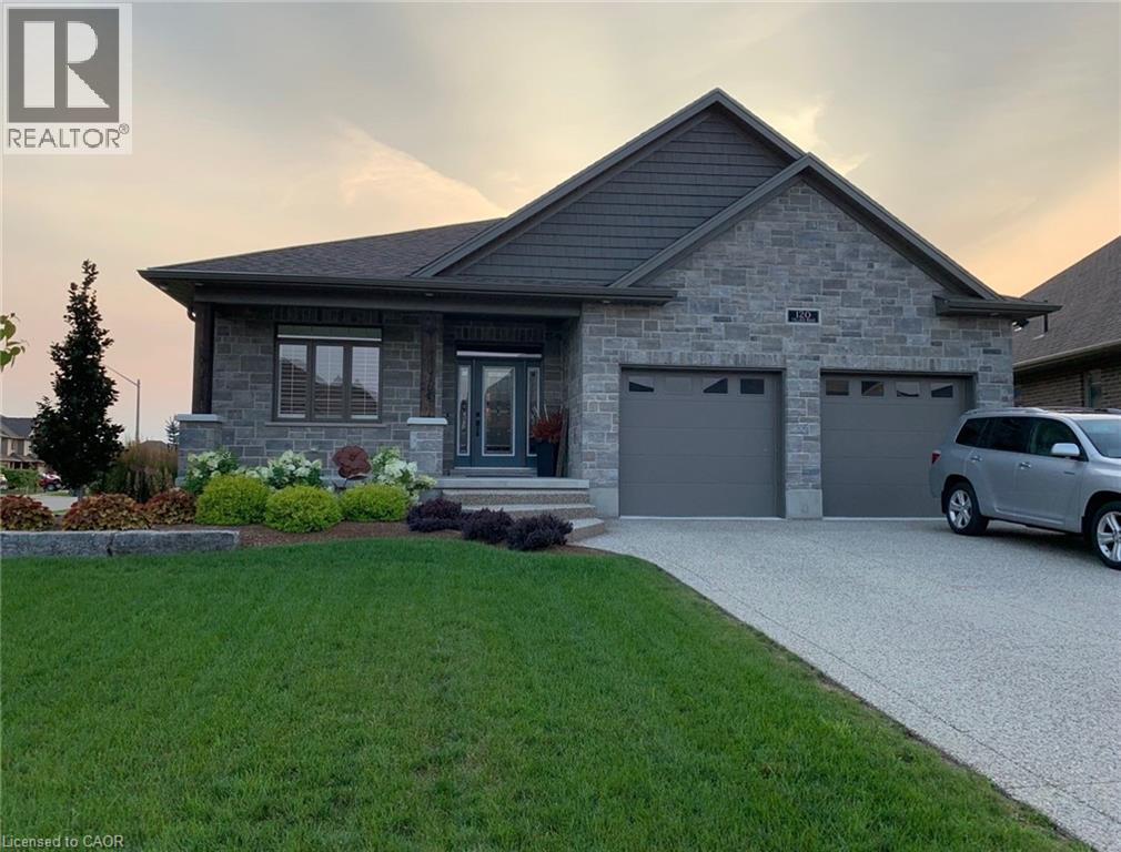 This CAPTIVATING custom- built bungalow has been lovingly maintained and cared for by the original owners. You'll love the stunning kitchen with white cupboards, elegant creamy white quartz counter tops, custom range hood crafted by Thak Ironworks, lots of storage and workspace, a spacious walk-in pantry, and a huge center island in contrasting wood. Gracious entertaining can be yours in the elegant dining room with large windows to offer a romantic setting for special moments. Here you will also find the entrance to the back porch overlooking the tranquil yard. The welcoming great room boasts engineered hardwood floors, soaring ceilings and large windows flanking the cozy gas stone fireplace. Relax and unwind in the tranquil primary bedroom retreat with large walk-in closet and inviting primary spa bath with deep soaker tub and separate shower. You'll appreciate the convenience of the main floor laundry that you can access off the garage and the kitchen, a second main floor bedroom with spacious closet and an additional full bath. Be comfy-cozy by the rustic stone fireplace in the spacious rec room designed for informal gatherings and room for a pool table. The basement also features 2 roomy bedrooms, a full bath, loads of storage and staircase to insulated double garage! Enjoy cool summer evenings on the lovely back porch or under the pergola with a picturesque view of the lawn and gardens. Apollo Shade Screens on back patio and pergola. Ambient garden lights throughout. Custom 12' x 16' shed. Quality craftmanship by Stroh Homes! Desirably located close to the school, scenic walking trails, gently rolling hills and valleys and the meandering Nith River. HOUSE AND GARDEN! (id:64974)