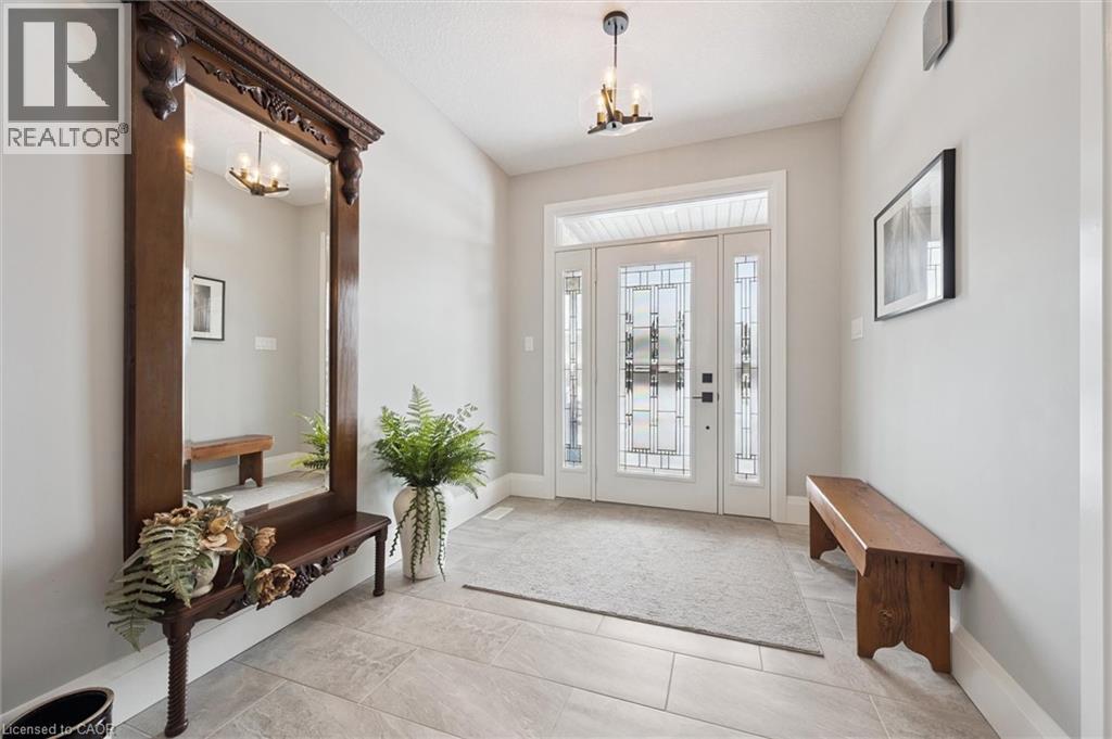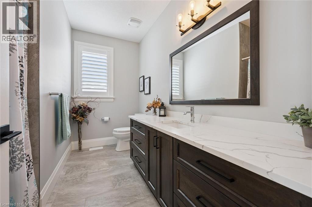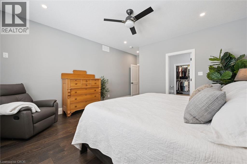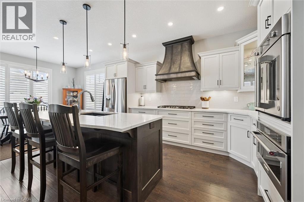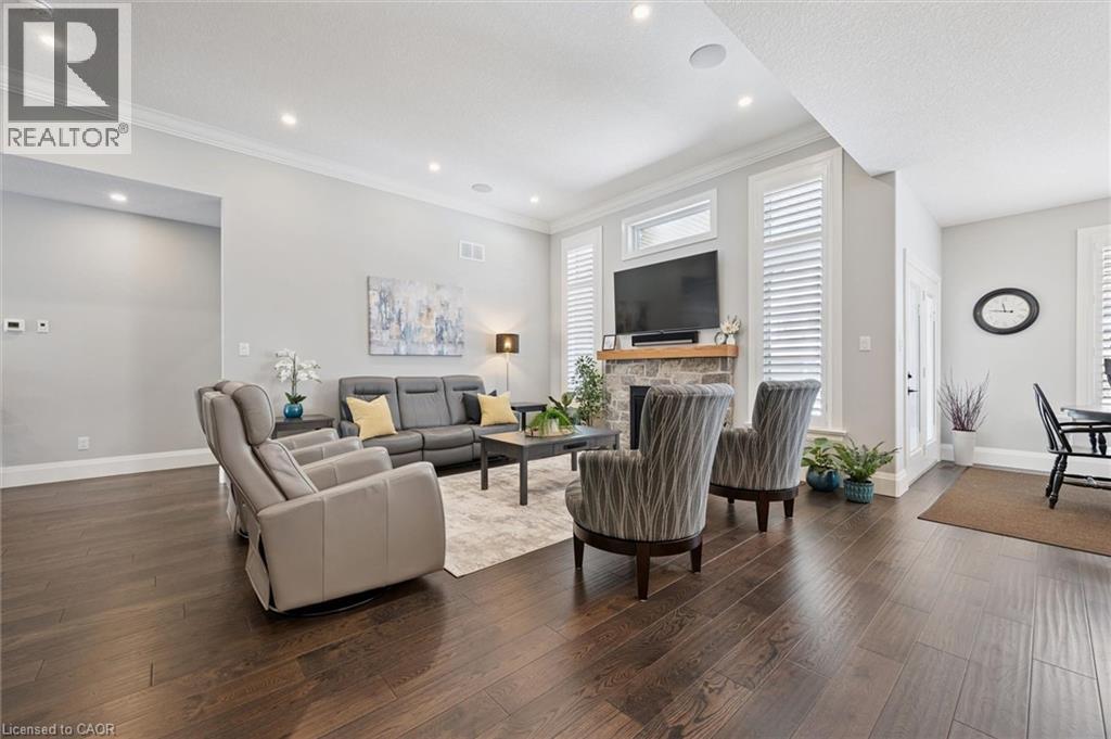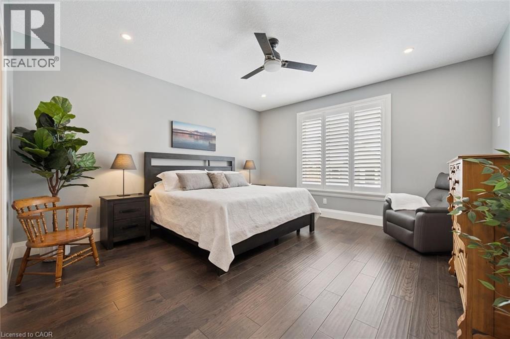 This CAPTIVATING custom- built bungalow has been lovingly maintained and cared for by the original owners. You'll love the stunning kitchen with white cupboards, elegant creamy white quartz counter tops, custom range hood crafted by Thak Ironworks, lots of storage and workspace, a spacious walk-in pantry, and a huge center island in contrasting wood. Gracious entertaining can be yours in the elegant dining room with large windows to offer a romantic setting for special moments. Here you will also find the entrance to the back porch overlooking the tranquil yard. The welcoming great room boasts engineered hardwood floors, soaring ceilings and large windows flanking the cozy gas stone fireplace. Relax and unwind in the tranquil primary bedroom retreat with large walk-in closet and inviting primary spa bath with deep soaker tub and separate shower. You'll appreciate the convenience of the main floor laundry that you can access off the garage and the kitchen, a second main floor bedroom with spacious closet and an additional full bath. Be comfy-cozy by the rustic stone fireplace in the spacious rec room designed for informal gatherings and room for a pool table. The basement also features 2 roomy bedrooms, a full bath, loads of storage and staircase to insulated double garage! Enjoy cool summer evenings on the lovely back porch or under the pergola with a picturesque view of the lawn and gardens. Apollo Shade Screens on back patio and pergola. Ambient garden lights throughout. Custom 12' x 16' shed. Quality craftmanship by Stroh Homes! Desirably located close to the school, scenic walking trails, gently rolling hills and valleys and the meandering Nith River. HOUSE AND GARDEN! (id:64974)