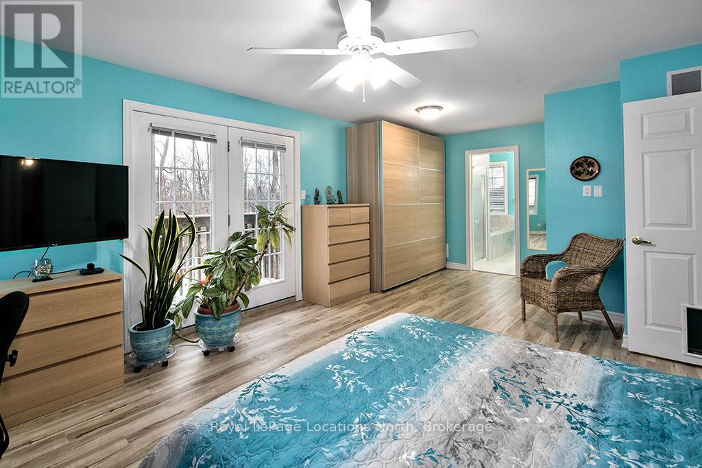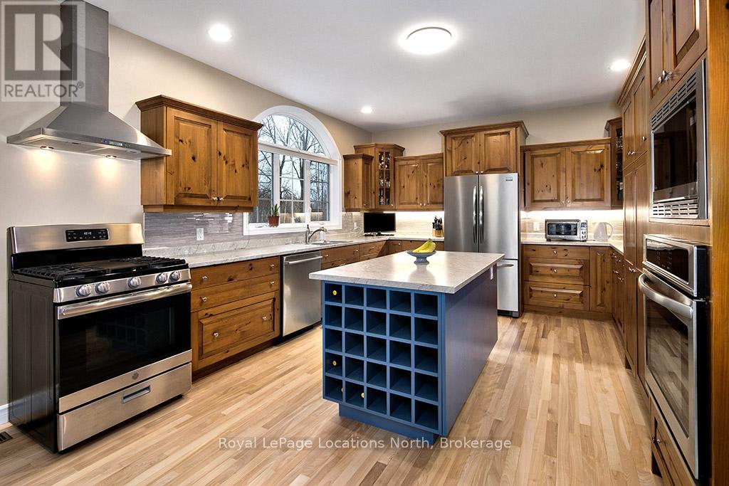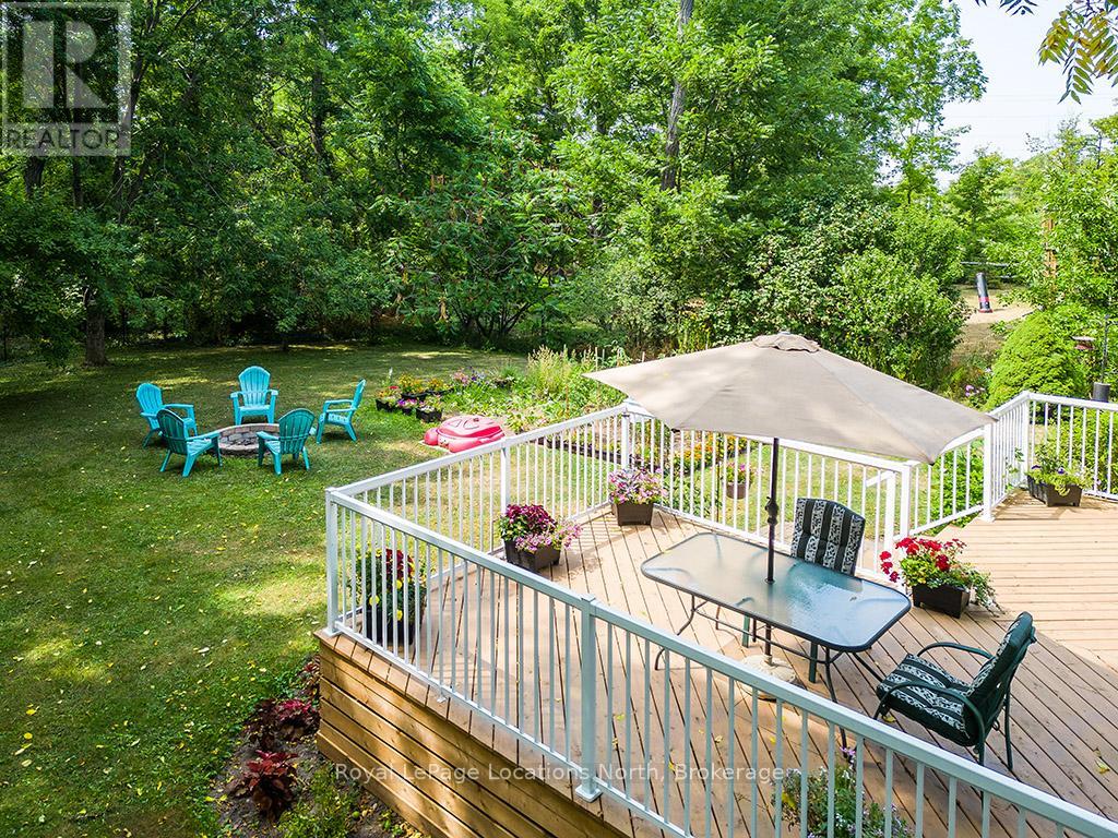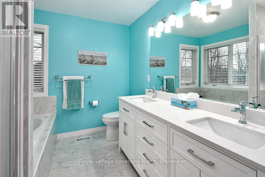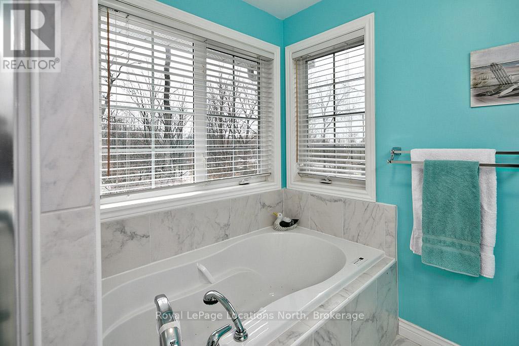 Where Every Season Beckons - And Every Detail Delivers. Perfectly positioned between Collingwood and Thornbury, this exceptional family home places you minutes from The Peaks, Alpine, and Craigleith ski clubs, steps to the Georgian Trail, and just across the road from Georgian Bay Public Access. Bike the Georgian Trail into town in summer, snowshoe through the forest in winter, paddle at sunrise in fall - this is four-season living at its finest. Set on a lush, private lot over 200 feet deep, surrounded by mature trees and protected land with ski hills framing the distance, this dead-end road retreat offers rare tranquility without sacrificing convenience. Charming gardens and a welcoming front porch set the tone - your morning coffee has never had a better backdrop. Inside, soaring cathedral ceilings anchor a generous great room that flows seamlessly into the eat-in dining area and chef's kitchen, complete with warm, wooden cabinetry and ample prep space for entertaining after a day on the slopes or trails. A 2-piece powder room, laundry, and oversized double garage complete the main level. Upstairs, the primary suite is a true sanctuary - featuring a recently updated spa-inspired ensuite with soaker tub, glass shower, and double vanity, plus a private walk-out balcony. Two additional bedrooms share a 4-piece bath, while a second primary suite with its own ensuite offers ideal flexibility for in-laws, teens, or guests craving their own retreat. The lower level rounds out the package with a dedicated gym area, two versatile bonus rooms perfect as a den, office, or second living space, and generous storage throughout. Too many upgrades to list - highlights include furnace/AC (2019), whole-home generator (2023), large, new back deck (2024), updated appliances, refined finishes, and more. This home has been thoughtfully maintained and improved for true turn-key living.This is more than a home - it's a lifestyle address. (id:64974)