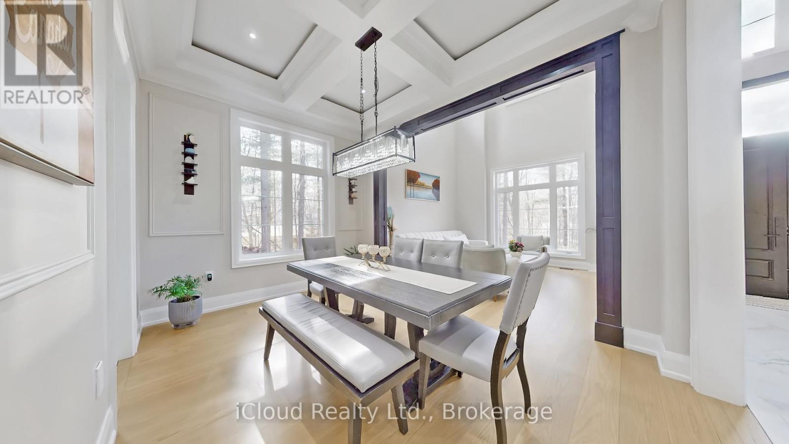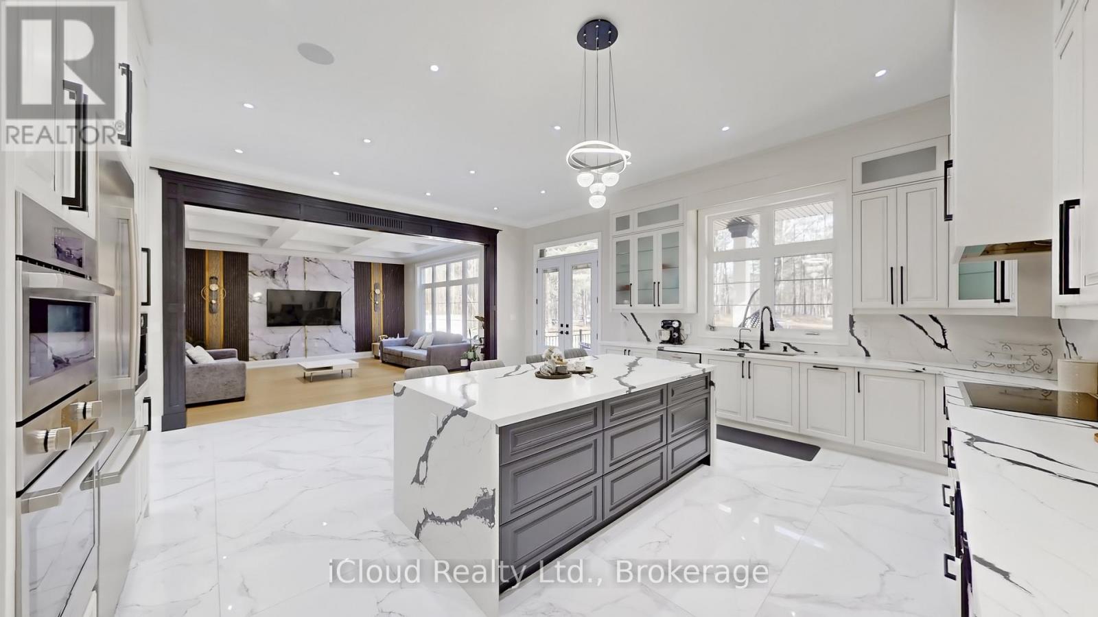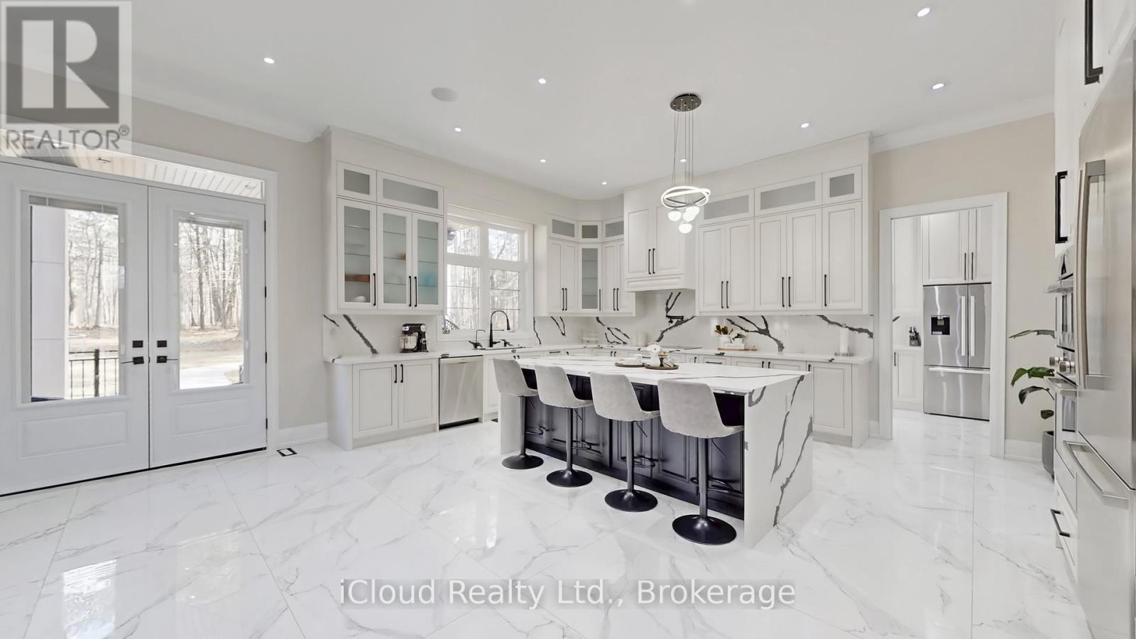 Stunning newly built custom estate on 4+ acres in Milton's rural corridor! 5,103 sq.ft. above grade, finished walk-out basement - over 7,600 sq.ft. of total luxury living. Grand double-height foyer with marble porcelain tile and curved staircase with wrought-iron spindles. Formal living with soaring open-to-above ceilings. Dining room with coffered ceiling, wainscoting and crystal chandelier. Great room with coffered ceilings, marble feature wall, gold sconces and stunning forest views. Chef's kitchen: full-height cabinetry, quartz waterfall island seating five, double wall ovens, built-in fridge and coffee maker. Full spice kitchen with cabinetry, quartz counters, double sink, fridge and range hood - ideal for entertaining! Main floor guest bed for in-laws. Primary suite with tray ceiling, French doors to a private balcony, custom walk-in closet and spa ensuite with dual vanities, soaker tub, heated towel bar and glass shower with gold marble surround. Three additional beds with tray ceilings, hardwood floors and private ensuites. Upper laundry with full cabinetry. Finished W/O basement: home theatre, gym, games area, rec room, guest bed, full marble bath, cold room and private walk-out entrance. Backyard paradise: covered rear deck, concrete fire pit patio with stone surround, full-size outdoor basketball and sports court with custom logo, children's treehouse and play structure in the forest, trampoline area and sprawling lawn - all surrounded by mature trees with complete privacy and no rear neighbors. Drone photos reveal the remarkable scale of this private compound, minutes from Milton amenities. 5+1 Bed, 6+ Bath, Triple Garage, 5,103 sq.ft. MPAC | Spice Kitchen, W/O Basement, 4.2-Acre Lot, Marble & Hardwood Floors, Designer Ensuites, Home Theatre, Gym, Basketball Court, Fire Pit, Existing Well, Future Elevator. Main and second floor laundry. Pot lights in side and out side the house. (id:64974)