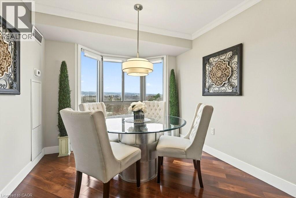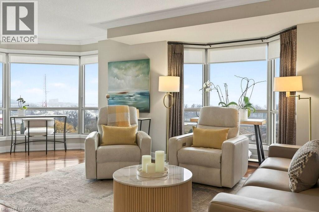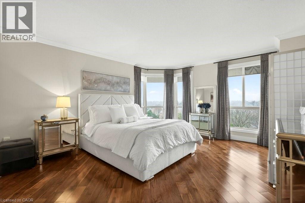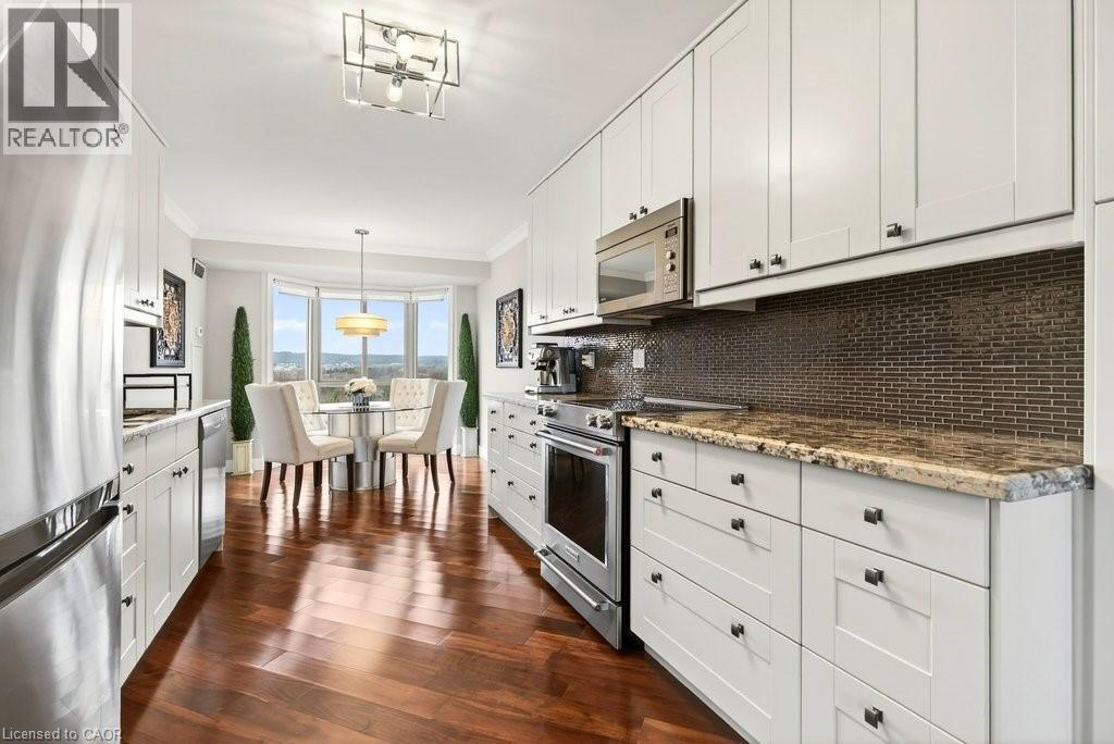 Beautifully updated 2 bedroom corner suite at 'Lake Winds' in prime downtown core location! Just steps to the lake, waterfront park, restaurants, shops, hospital and highway access. 1,532 sq.ft. loaded with natural light featuring southwest exposure and gorgeous views of the lake, bay, bridge, escarpment and beyond! Upgraded eat-in kitchen with granite, stainless steel appliances, glass subway tile backsplash and pantries for extra storage. The primary bedroom features a 4-piece ensuite with soaker tub and custom closet, while the second bedroom is highlighted by a large built-in wardrobe and easy access to an updated 3-piece bathroom with oversized walk-in glass shower. Open living/dining area exudes sophistication with rich engineered hardwood floors, crown moulding, bay windows, electric fireplace, custom window coverings, modern light fixtures, walkout to a private balcony and access to a spacious in-suite laundry with built-in cabinetry. Building amenities include a heated outdoor pool, tennis court, sauna, fitness centre, car wash bay, social room, bicycle storage, workshop and ample visitor parking. Traffic light located at building entrance for safe and easy entering and exiting. 2 underground parking spaces and 1 storage locker. Condo fee includes all utilities. (id:64974)