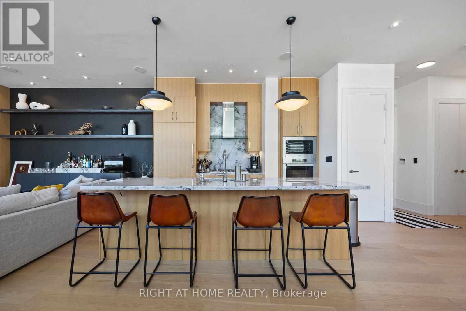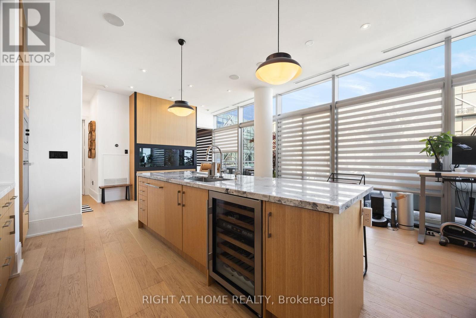 Welcome to Suite 1202 at 39 Queens Quay East, a rare and beautifully renovated penthouse waterfront residence offering over 500 sq ft of private terrace space with sweeping lake views. This exceptional 2 bedroom, 2 bathroom suite has been fully redesigned with high end finishes, custom millwork, and thoughtfully integrated built ins, creating a truly turnkey luxury living experience. The fully furnished interior features curated designer pieces, wide plank hardwood floors, 10 ft ceilings, integrated lighting, built in speakers, and bespoke cabinetry throughout. The living space includes a custom built-in bar and a striking 200 gallon aquarium that creates a unique and elegant focal point. The kitchen is designed for both entertaining and everyday living, featuring premium appliances including Sub Zero refrigeration, Miele dishwasher, fully integrated cabinetry, and a massive 10 ft island that serves as the centerpiece of the open concept space. The primary bedroom features a custom built-in bed with integrated lighting, floors, a walk in closet and heated bathroom floors. The second bedroom includes a built-in Murphy bed, allowing the space to function easily as a guest room, home office, or flexible living area. One of the most remarkable features is the expansive 500+ sq ft private terrace overlooking Lake Ontario. Designed as an extension of the living space, it features a built in BBQ, outdoor cooking area, and lounge furnishings, ideal for entertaining, outdoor dining, or relaxing while enjoying waterfront views. Residents enjoy luxury amenities including 24 hour concierge, indoor and outdoor pools, fitness centre, sauna, party room, guest suites, and visitor parking. Located steps to Sugar Beach, St Lawrence Market, Union Station, the Financial District, waterfront trails, restaurants, and cafés. Includes one parking space and one locker. Second parking space available if required. (id:64974)