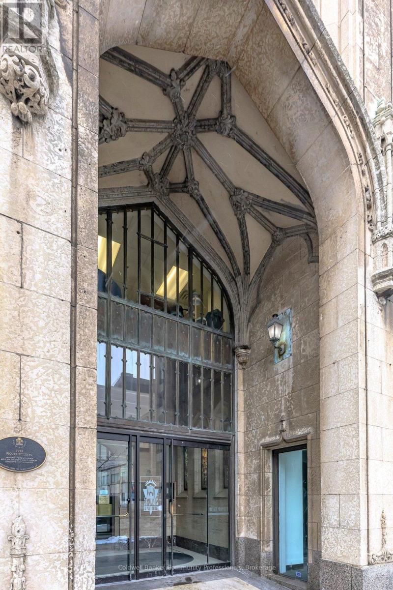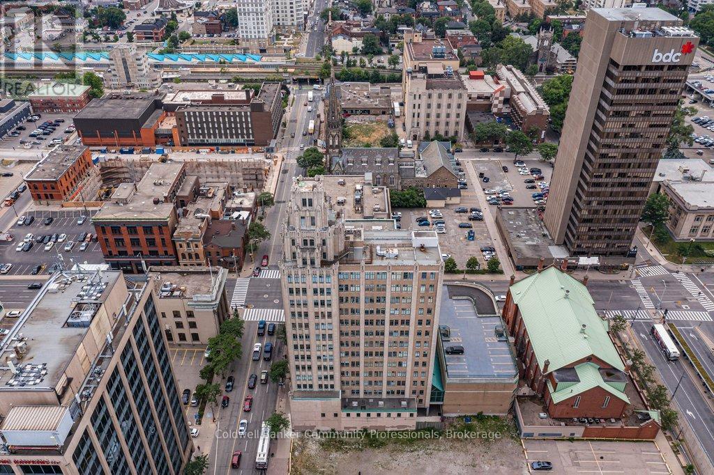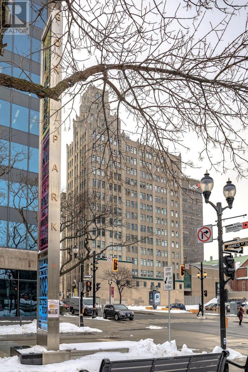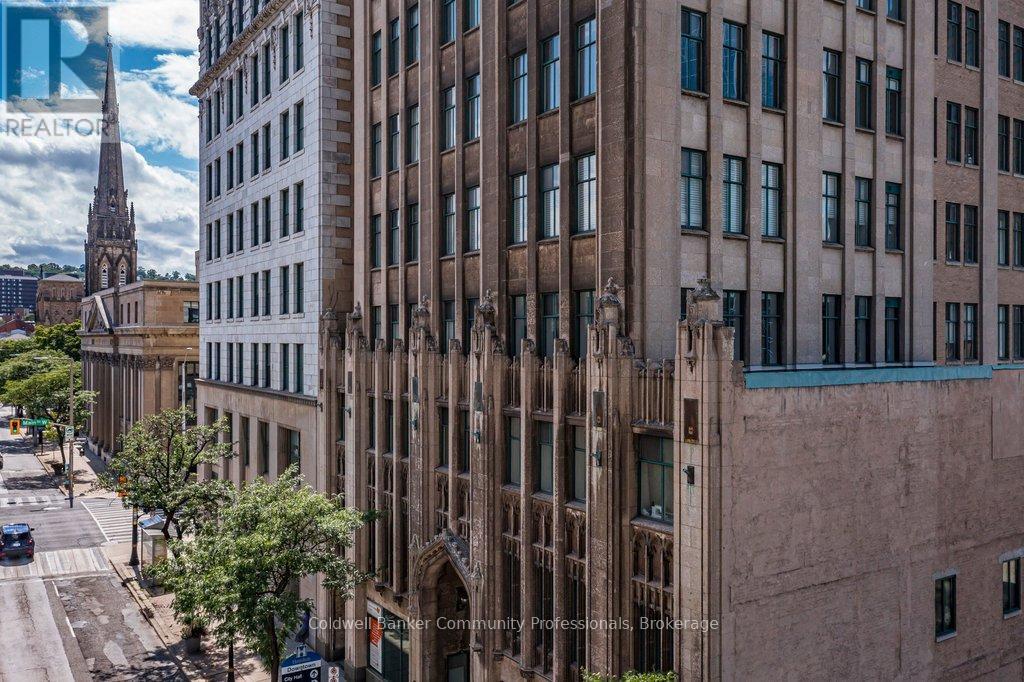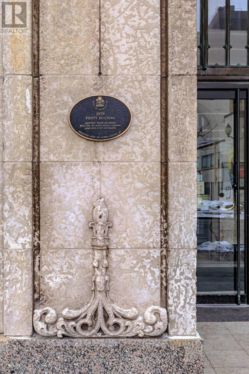 Bright open concept 1 bedroom condo with escarpment and downtown views in the heart of downtown Hamilton in the prestigious Heritage Pigott building. Unique chic open concept loft layout features updated bathroom and kitchen with breakfast bar, stainless steel appliances, in suite laundry with stacking washer and dryer, easy care engineered flooring, owned parking space plus locker. Custom closet built ins provide ample storage. Building features party room plus top floor gym. Easy walk to GO Station, Farmers Market, downtown shops and restaurants, James St. N. art district and all transportation. Short distance to McMaster University, mountain road access, Mohawk College and all hospitals. RSA (id:64974)