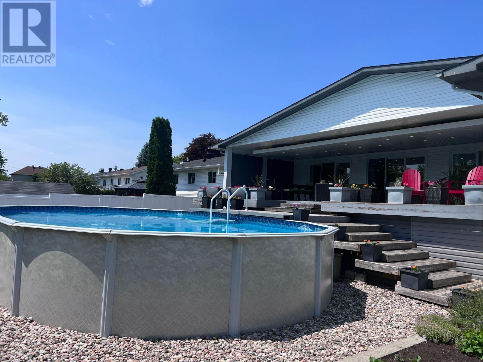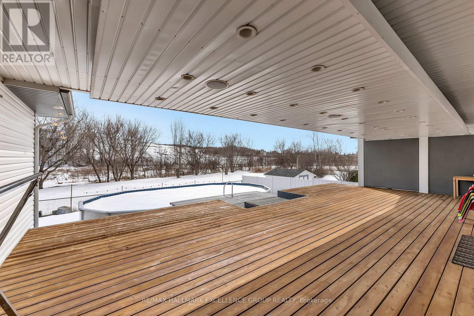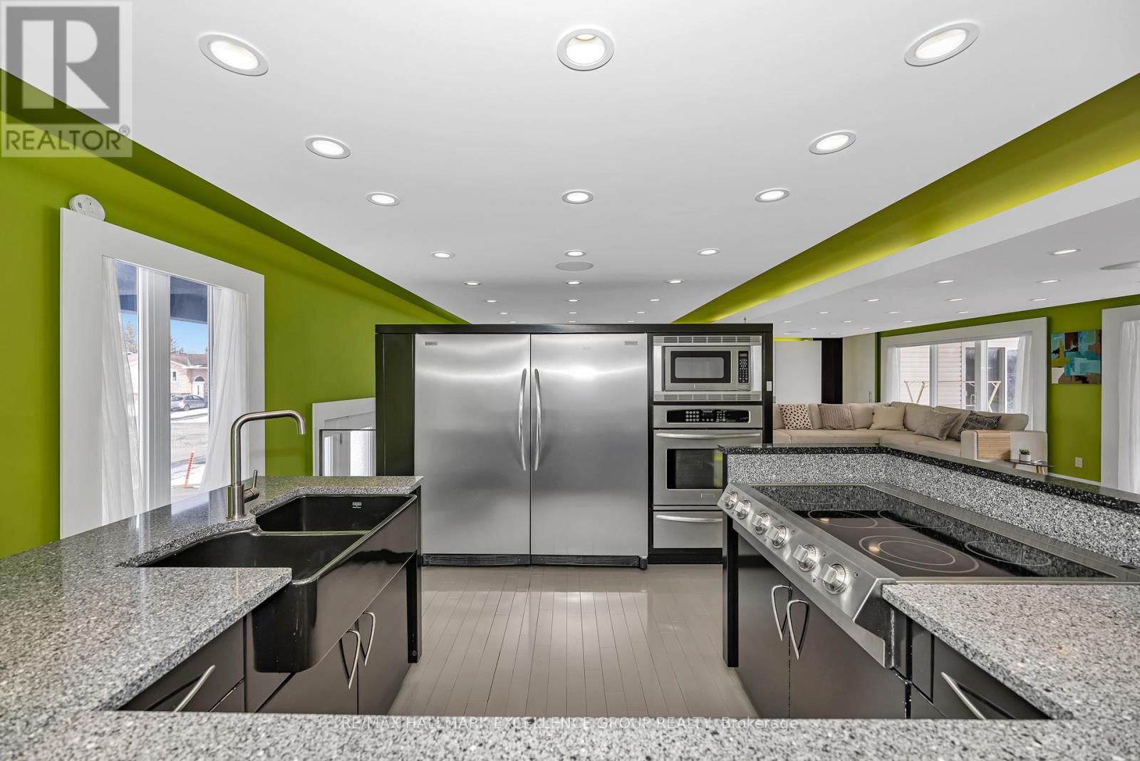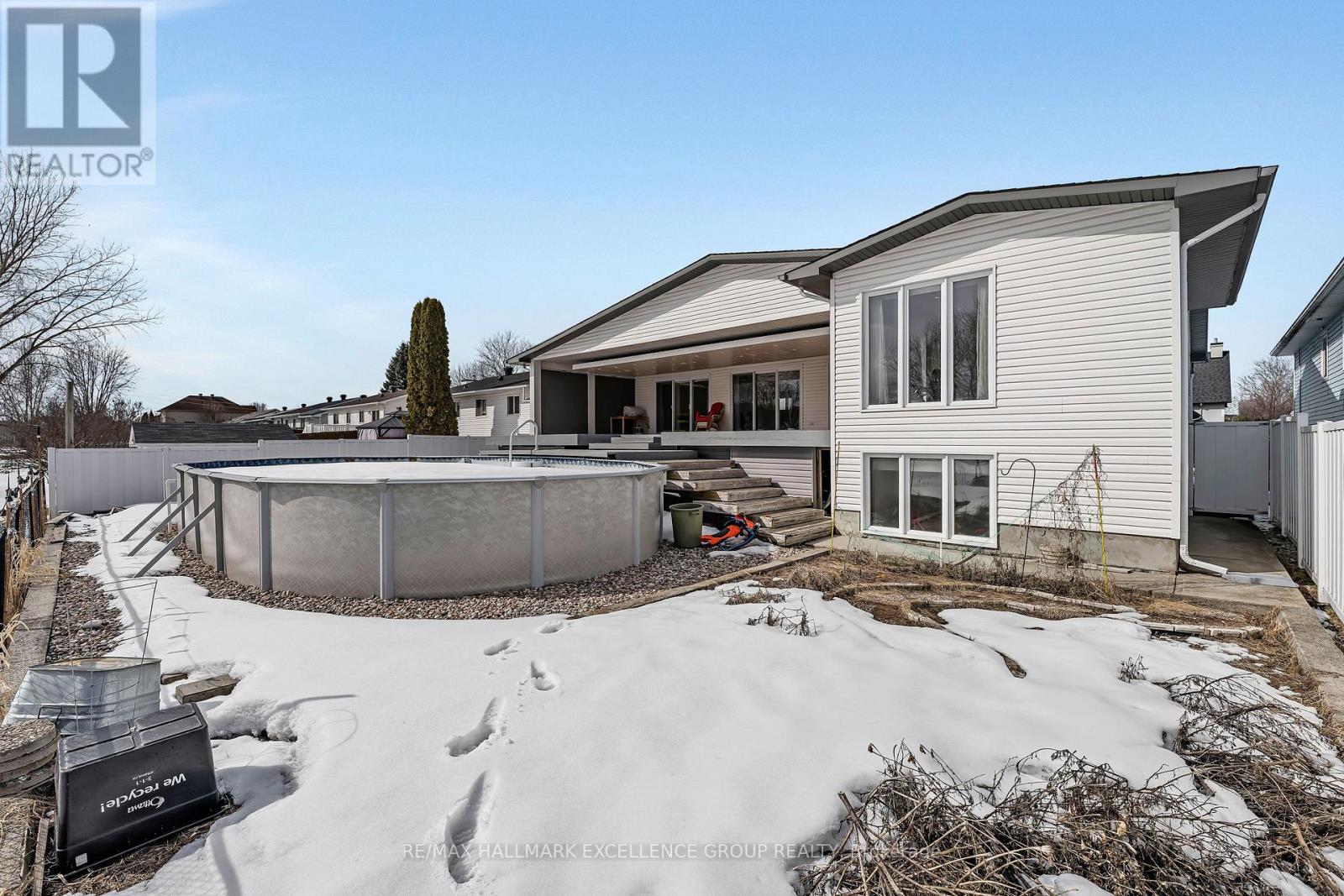 Beautifully private and custom renovated, this exceptional 4-bedroom, 2-bathroom raised bungalow is tucked into a quiet Rockland enclave where comfort, craftsmanship and lifestyle come together seamlessly. Meticulously maintained and thoughtfully redesigned, this stunning home offers timeless curb appeal, premium finishes and an inviting open-concept layout ideal for everyday living and entertaining.The main floor was completely reimagined and now showcases a spectacular Louis L'Artisan kitchen featuring granite counters, bar seating, custom cabinetry and commercial-grade stainless steel appliances. Chic designer hardwood flooring, dramatic tray ceilings and hidden ambient lighting built into walls and coffers elevate the space, while the expansive living and dining areas are filled with natural light from three 9' foot patio doors. The result is a bright, elegant and highly functional main level that flows beautifully outdoors.The spacious primary bedroom offers a peaceful retreat with ensuite bath and direct patio door access to the back deck. Downstairs, the finished lower level provides remarkable flexibility with 3 additional bedrooms, a generous rec room, a large combined laundry/4-pce bath, plus plenty of storage for busy family living.Step outside and discover an incredible backyard oasis designed for privacy and enjoyment. The massive partially covered deck is enhanced with built-in pot lights and surround sound, overlooking the above-ground pool, PVC fencing and beautifully landscaped grounds. With no rear neighbours and yard space long enjoyed beyond the fenced area, this is a true nature lover's dream in a central location. Built with quality and efficiency in mind, this home also features Low-E vinyl windows, central A/C, air exchanger and architectural shingles . Parking for 4 and walking distance to schools, shopping and amenities complete the package. 200 Amp service.Quick closing available but flexible. 24 hour irrevocable on all offers (id:64974)