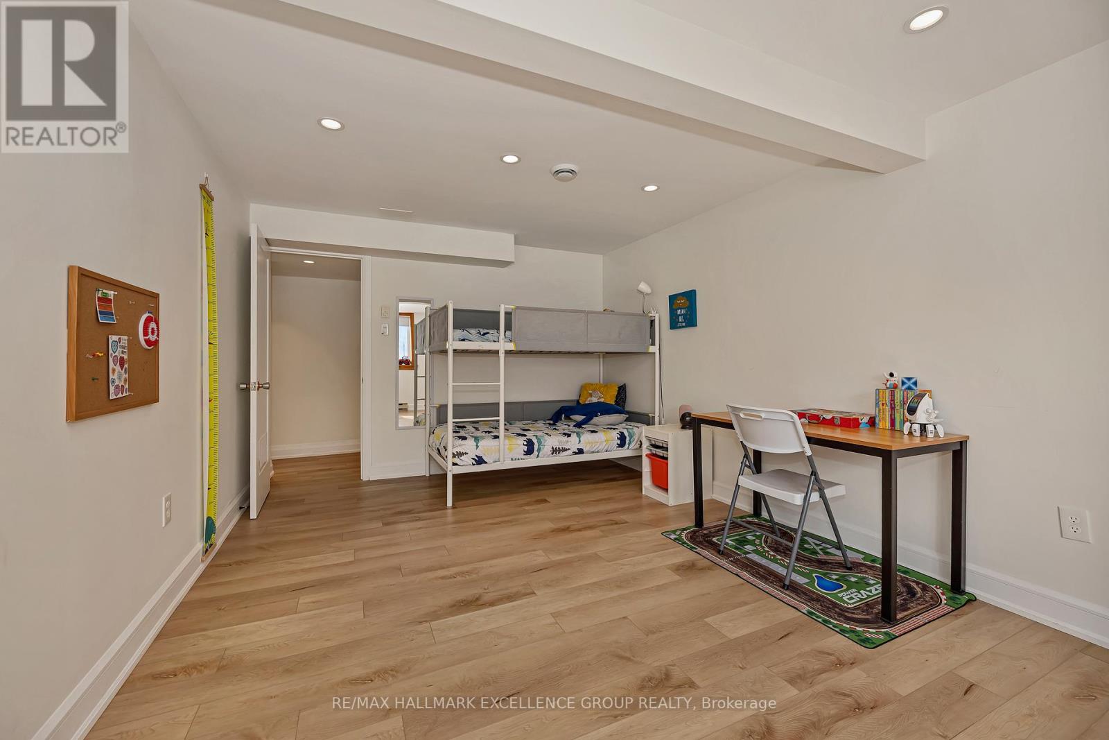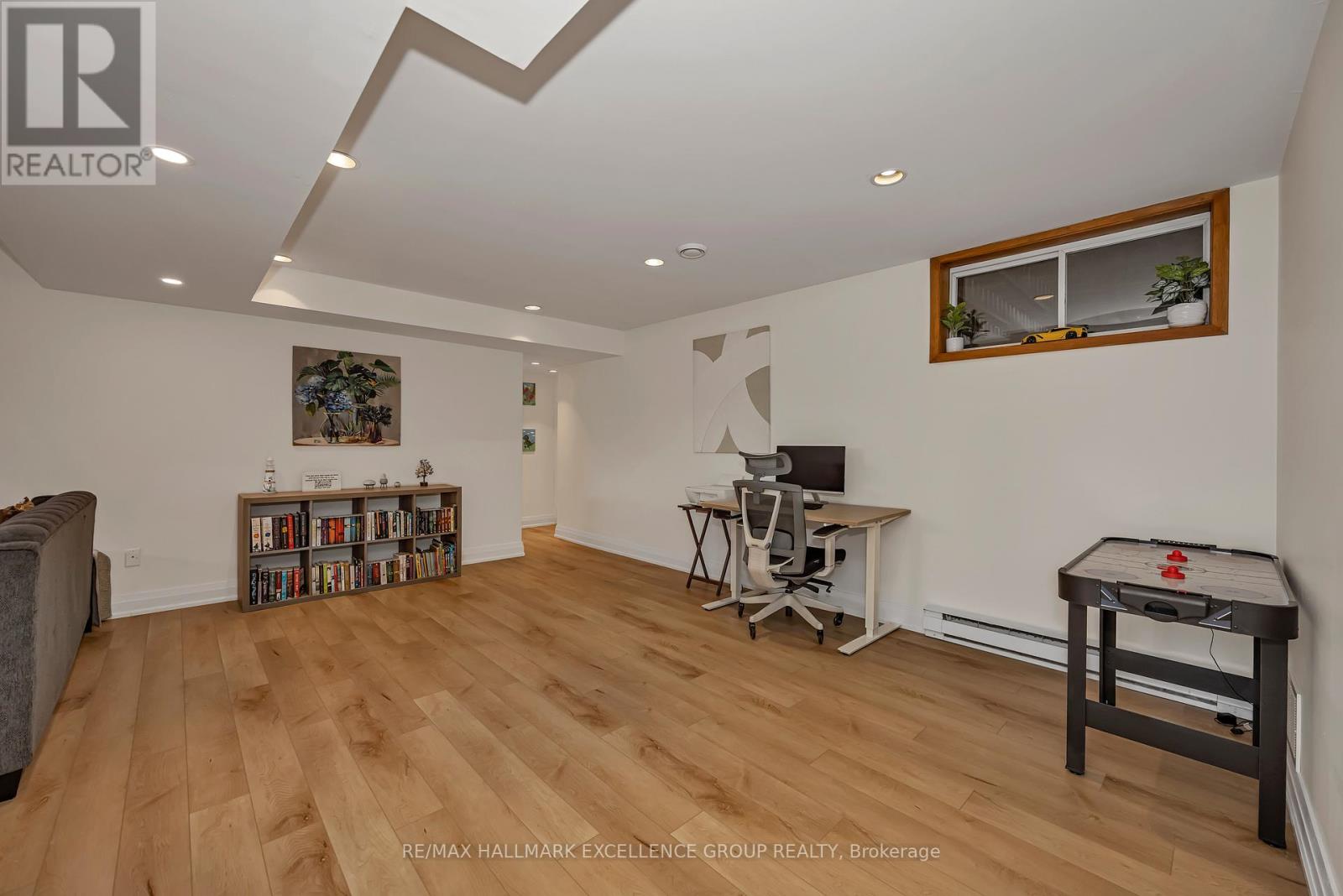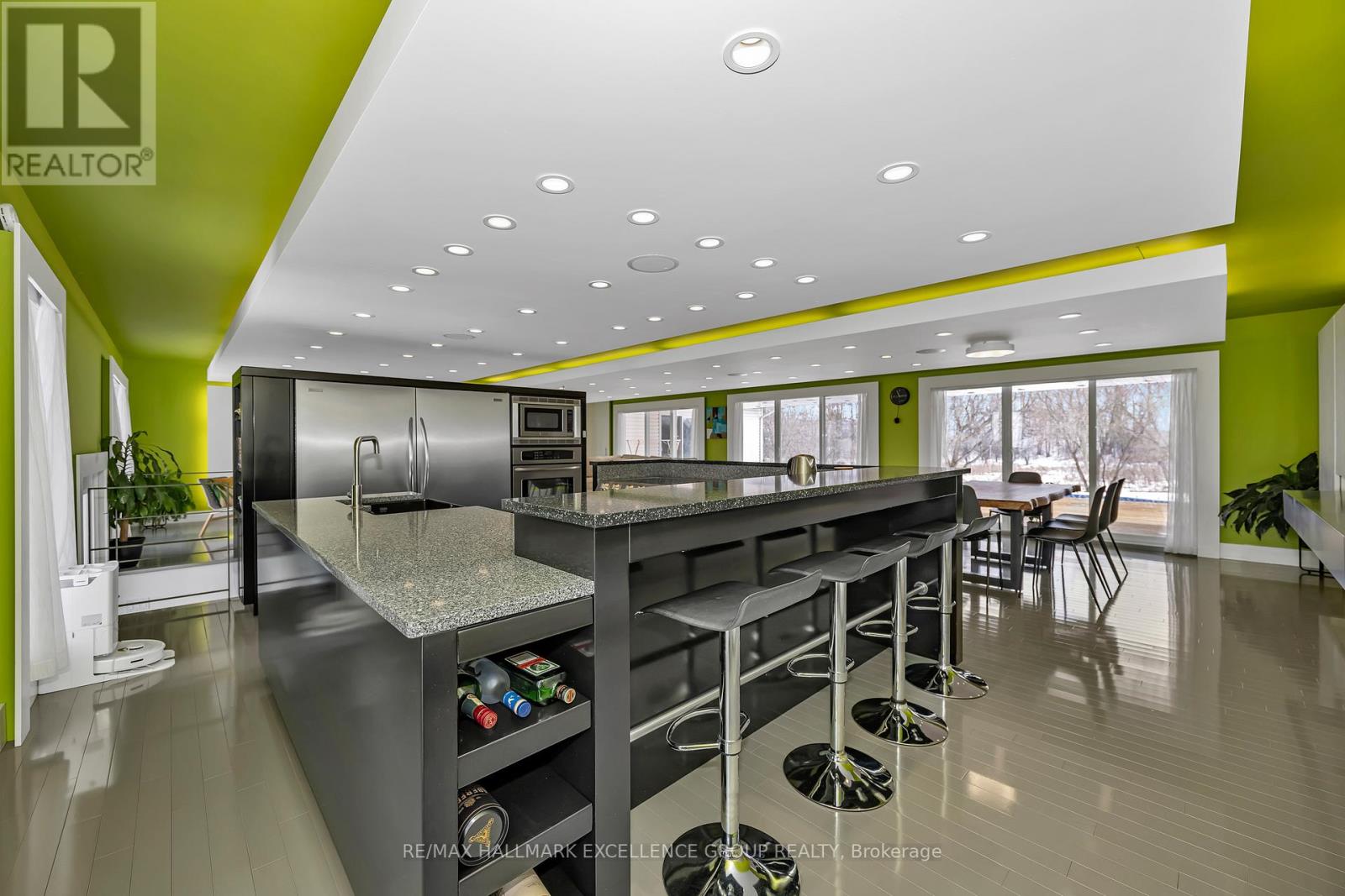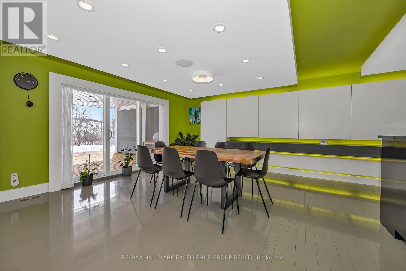 Beautifully private and custom renovated, this exceptional 4-bedroom, 2-bathroom raised bungalow is tucked into a quiet Rockland enclave where comfort, craftsmanship and lifestyle come together seamlessly. Meticulously maintained and thoughtfully redesigned, this stunning home offers timeless curb appeal, premium finishes and an inviting open-concept layout ideal for everyday living and entertaining.The main floor was completely reimagined and now showcases a spectacular Louis L'Artisan kitchen featuring granite counters, bar seating, custom cabinetry and commercial-grade stainless steel appliances. Chic designer hardwood flooring, dramatic tray ceilings and hidden ambient lighting built into walls and coffers elevate the space, while the expansive living and dining areas are filled with natural light from three 9' foot patio doors. The result is a bright, elegant and highly functional main level that flows beautifully outdoors.The spacious primary bedroom offers a peaceful retreat with ensuite bath and direct patio door access to the back deck. Downstairs, the finished lower level provides remarkable flexibility with 3 additional bedrooms, a generous rec room, a large combined laundry/4-pce bath, plus plenty of storage for busy family living.Step outside and discover an incredible backyard oasis designed for privacy and enjoyment. The massive partially covered deck is enhanced with built-in pot lights and surround sound, overlooking the above-ground pool, PVC fencing and beautifully landscaped grounds. With no rear neighbours and yard space long enjoyed beyond the fenced area, this is a true nature lover's dream in a central location. Built with quality and efficiency in mind, this home also features Low-E vinyl windows, central A/C, air exchanger and architectural shingles . Parking for 4 and walking distance to schools, shopping and amenities complete the package. 200 Amp service.Quick closing available but flexible. 24 hour irrevocable on all offers (id:64974)