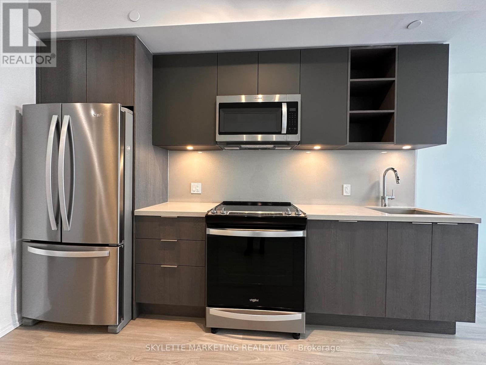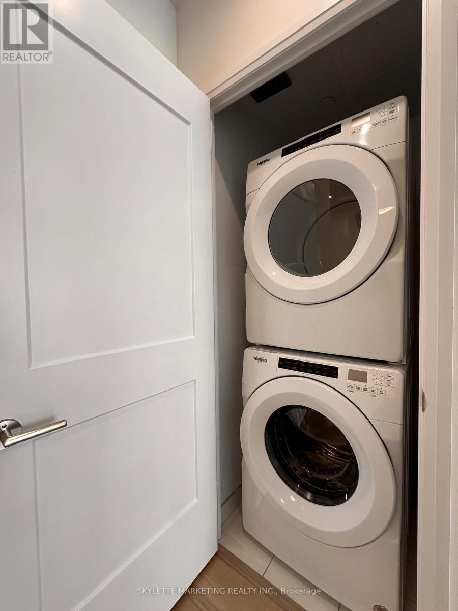 Welcome to the epitome of urban living in a newer condo at 25 Holly Dr, Toronto! This chic one-bedroom plus den, two full baths over 600sf condo offers a perfect blend of style and functionality. Enjoy a modern and practical open concept layout with modern kitchen, primary bedroom with an ensuite bath, extra bath for convenience and a den as a home office, convenient access to Toronto's vibrant city. Ideal for professionals, the sleek design, quartz kitchen featuring an undermount sink, window coverings for added privacy, Moen faucets for a touch of sophistication, and stylish laminate flooring throughout. The kitchen boasts six premium appliances, including stainless steel refrigerator, dishwasher, slide-in glass top stove, and built-in microwave. Unwind in the spa-like bathrooms with ceramic or porcelain floor tiles, deep soaker tubs, and glass-walled showers. (id:64974)