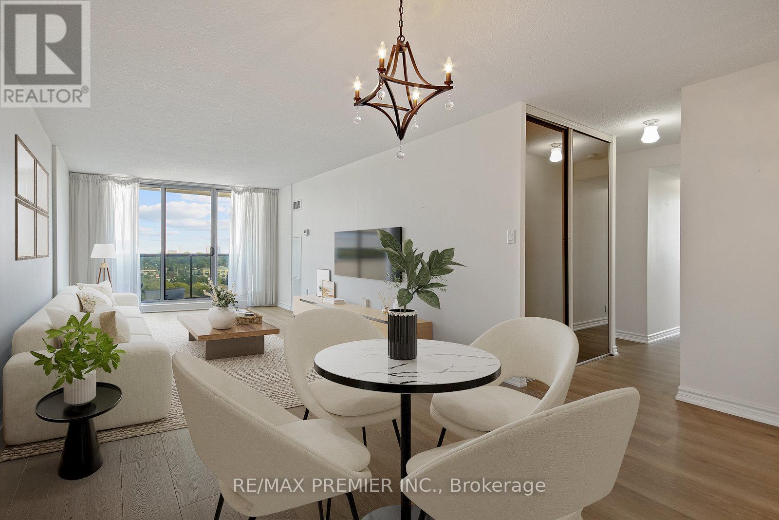 Welcome to Suite 1207 at Millgate Manor in the highly sought-after Markland Woods community of Etobicoke. This bright, sun-filled corner suite offers 2 spacious bedrooms plus a versatile den, ideal for a home office or potential third bedroom.The open-concept living and dining area provides generous space for both everyday comfort and entertaining, with walk-out access to a large balcony showcasing expansive east-facing panoramic views and an abundance of natural light. Updated laminate flooring flows throughout the main living areas, creating a clean and cohesive feel.The kitchen features ample cabinetry, under-cabinet lighting, tile backsplash, and a large single sink, opening seamlessly to the den with built-in shelving.The primary bedroom offers a wall-to-wall triple closet and an updated 3-piece ensuite with a stand-up shower and quartz vanity. The second bedroom is well-sized with a double closet and easy access to the updated 4-piece main bathroom, also featuring a quartz vanity. Both bathrooms were renovated approximately 7-8 years ago.Additional highlights include a generous in-suite laundry room, separate ensuite storage locker, and underground parking.Maintenance fees include all utilities - hydro, heat, water, air conditioning, cable TV, and unlimited high-speed internet - offering exceptional value and convenience.Millgate Manor boasts a beautifully renovated recreation centre featuring resort-style amenities including indoor and outdoor pools, tennis and basketball courts, squash court, golf room, fully equipped gym, sauna, and party room.Centrally located near schools, parks, Centennial Park, shopping, TTC at your door, and quick access to Highways 427, 401, and QEW - with easy commuting to Pearson Airport and downtown Toronto. (id:64974)