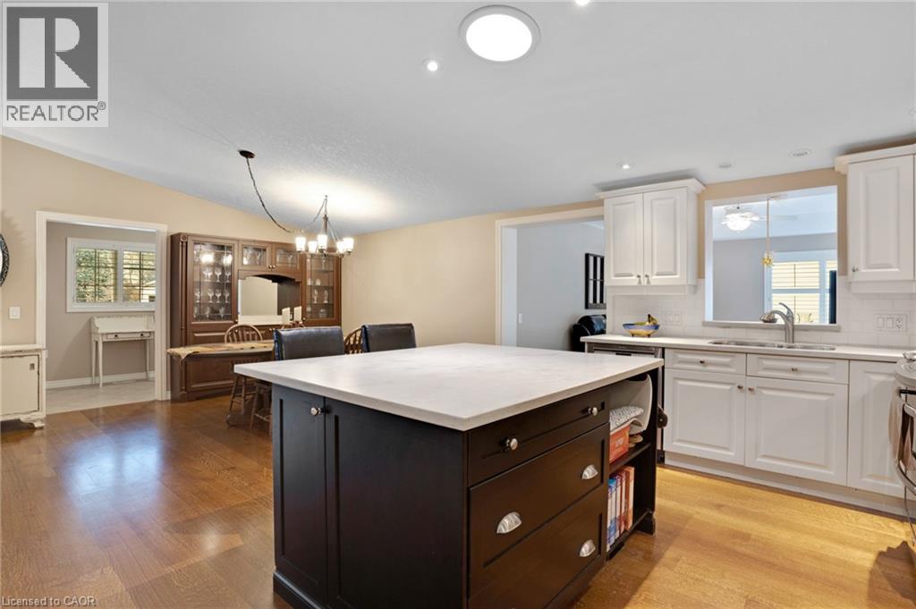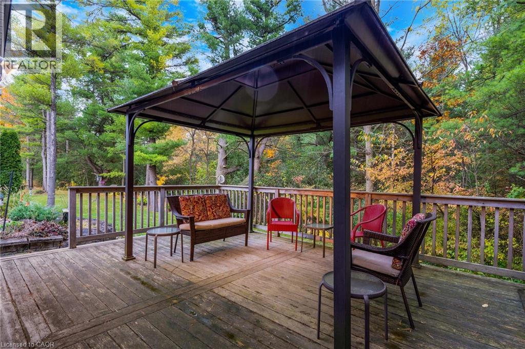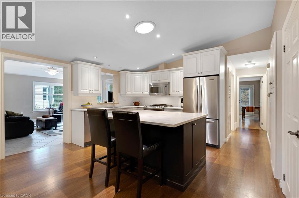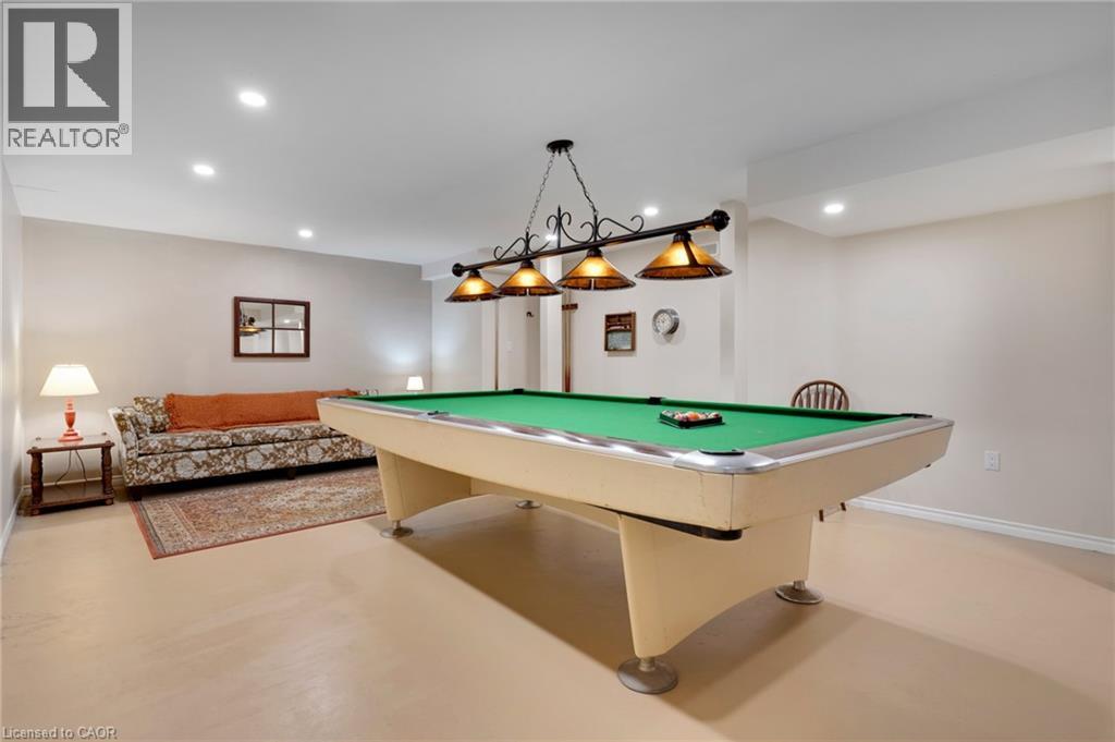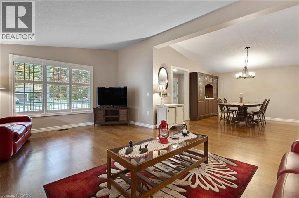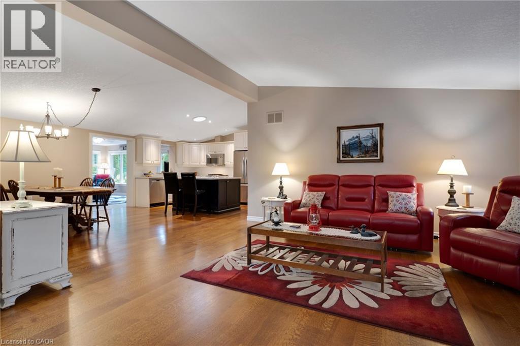 Elevated Adult Living Awaits! Discover what the popular adult lifestyle community of Antrim Glen has to offer. Situated in a tranquil rural setting, yet a scenic 15-minute drive to the conveniences of Cambridge or Waterdown, this location truly offers the best of both worlds. This well maintained custom home checks every box: a double-car garage, a fully finished basement, and a serene, unobstructed view of nature with no rear neighbours. Step inside to an inviting open-concept layout featuring vaulted ceilings & quality hardwood floors in the generous 1,670 Sq. Ft. main level. The heart of the home is the stylish, custom kitchen, which anchors the large living room & dining room plus provides an effortless flow into the bright, east-facing sunroom. Directly off the sunroom, a large private patio offers the ideal spot for morning coffee or evening entertaining, surrounded by the tranquility of the natural woodlot. The generous primary suite is designed as a true retreat, complete with a spacious walk-in closet and an updated luxury ensuite featuring a walk-in glass shower. The second bedroom is strategically positioned with access to a private deck overlooking nature. The trundle bed allows flexibility; guest suite or quiet home office. Spacious comfort is assured with an additional 1,040 Sq. Ft. of finished living space downstairs. The lower level offers incredible versatility, featuring a large family room for secondary entertaining, a dedicated games room, a three-piece bathroom, and an additional third bedroom, plus a dedicated workshop. As a resident of Antrim Glen, you gain access to an array of exceptional amenities designed to foster a lively & engaging social environment. Monthly land lease fees of $1,225.86 include property taxes and full access to facilities. Enjoy the community centre, the heated saltwater pool, & various organized activities where neighbours easily become friends. Schedule your private tour today! (id:64974)