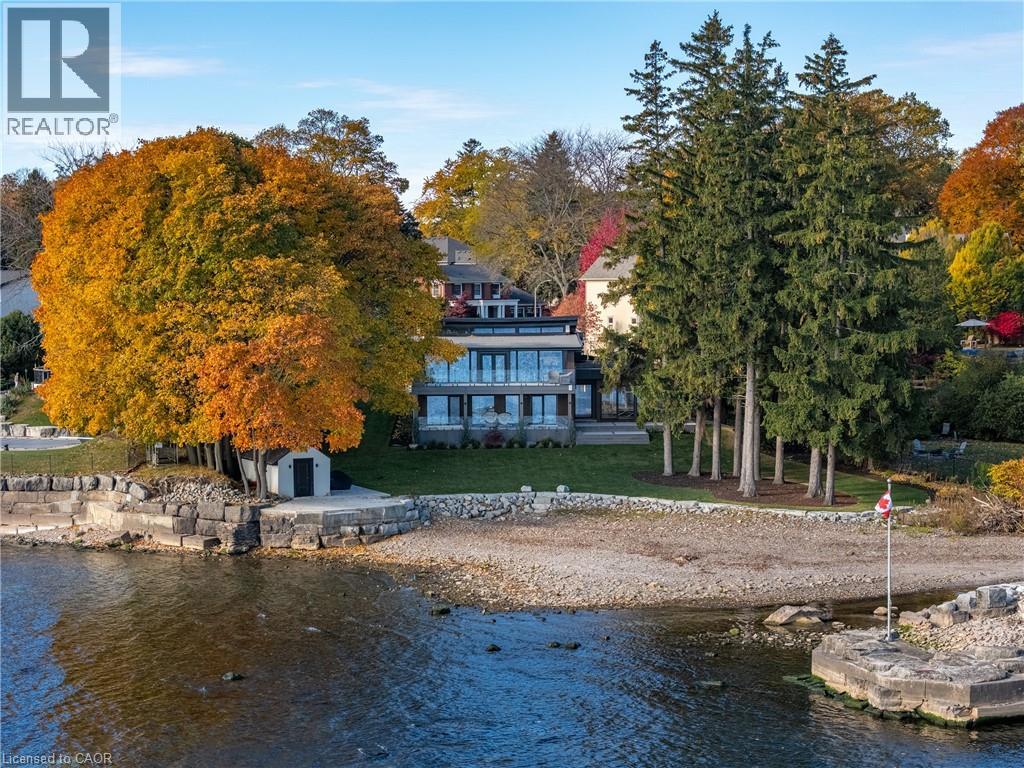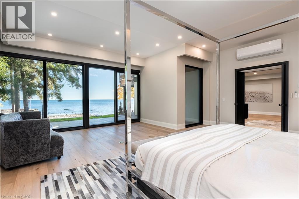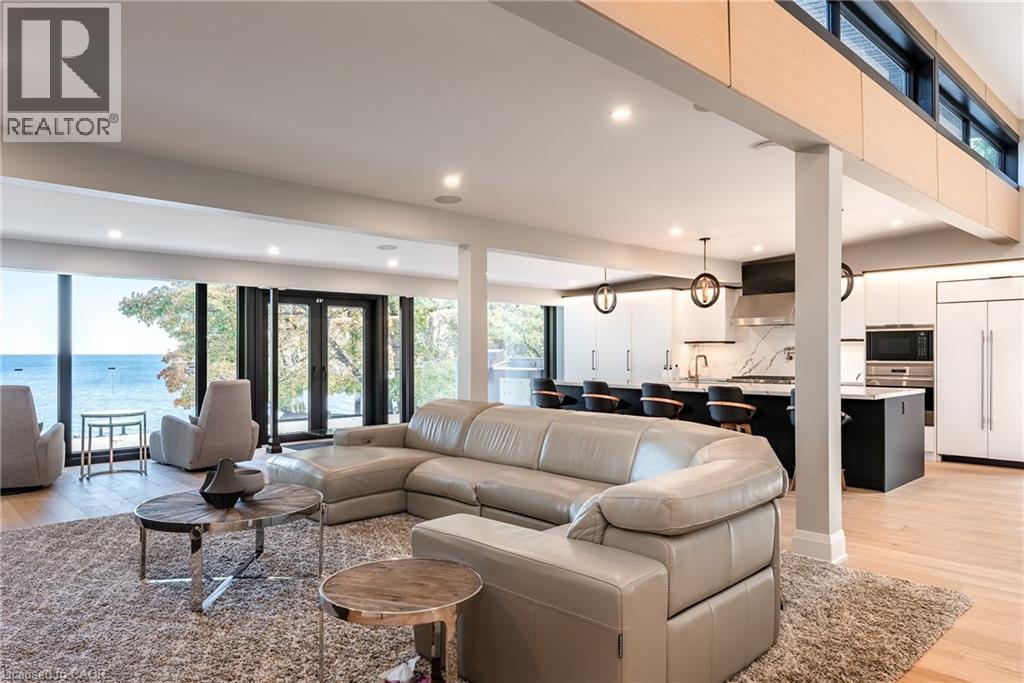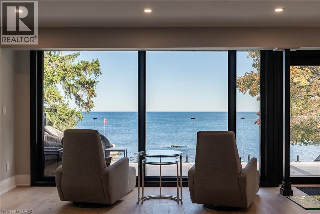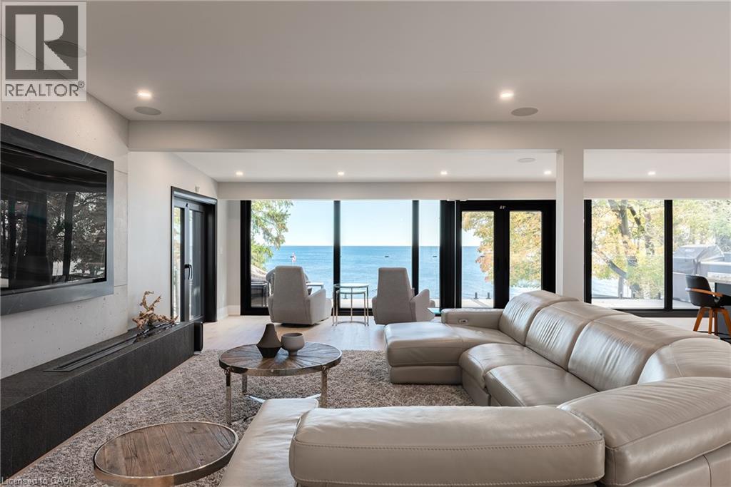 Natural serenity meets modern design at 121 Edgecliffe Place. Set on a rare 29,000 sq. ft. pie-shaped lakefront lot where Appleby Creek meets Lake Ontario, this exceptional property offers 105 feet of direct waterfront and 130 feet along the creek with riparian rights, creating an irreplaceable natural setting in the city. This fully renovated home offers over 5,200 sq. ft. of finished living space with floor-to-ceiling windows that draw the lake and landscape into every room. The open-concept main level features 12-foot peaked ceilings, engineered light hardwood, and dark-framed windows that frame panoramic southern views. A chef’s kitchen anchors the space with a large island and top-tier appliances, ideal for entertaining. The walkout lower level accommodates four bedrooms, each with its own ensuite and ductless air conditioning unit. The primary suite opens directly to the lakeside deck, featuring a spa-inspired ensuite with dual rain showers and a massive walk-in closet with custom cabinetry. Radiant in-floor heating extends throughout the home for year-round comfort. Multiple outdoor living spaces blur the line between indoors and out. A covered lower deck and expansive upper terrace with built-in BBQ maximize lakefront enjoyment and capture the home’s stunning setting. Modern. Peaceful. One of a kind on the water. (id:64974)
