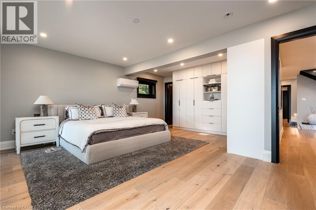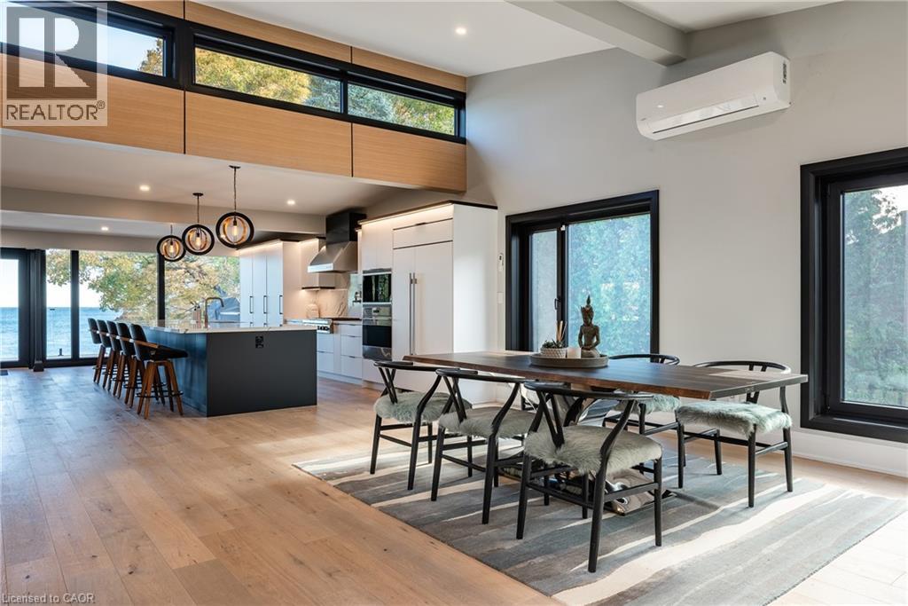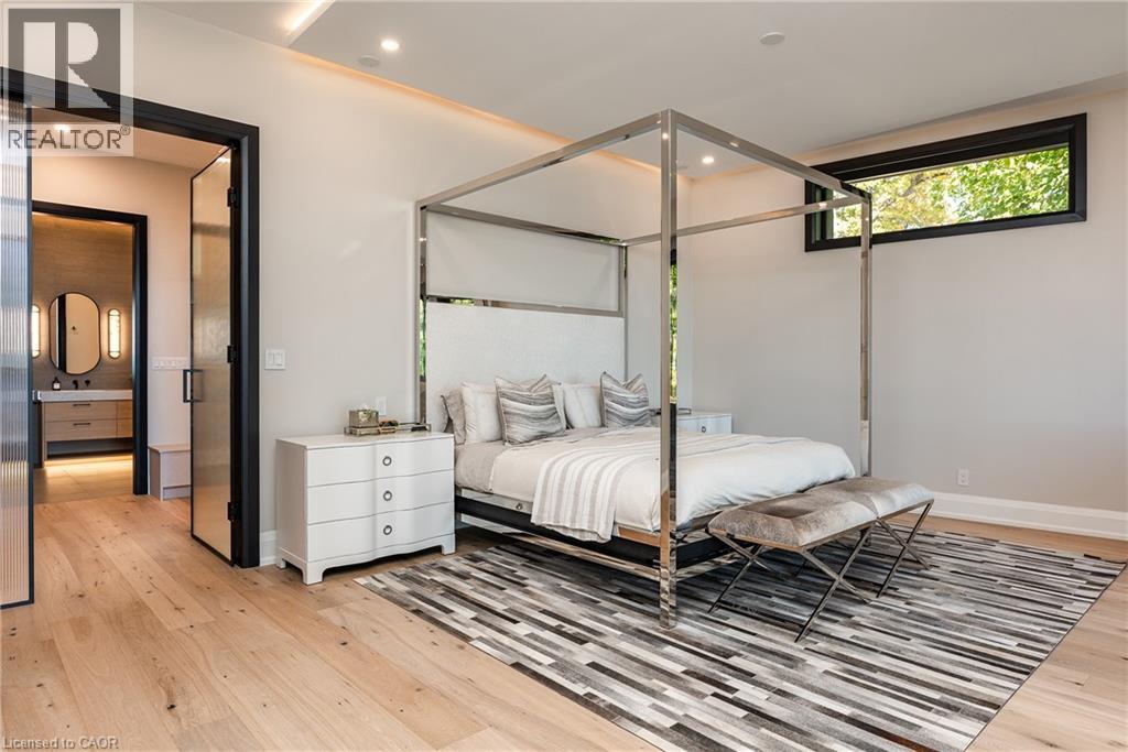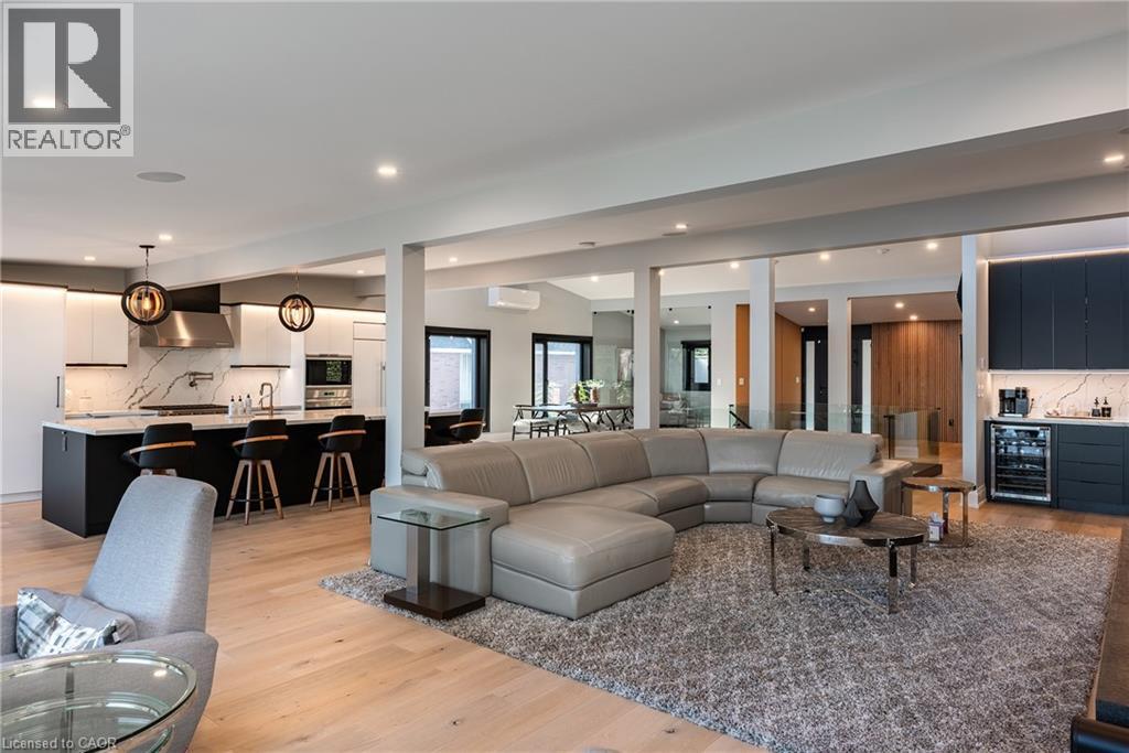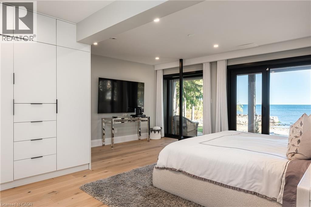 Natural serenity meets modern design at 121 Edgecliffe Place. Set on a rare 29,000 sq. ft. pie-shaped lakefront lot where Appleby Creek meets Lake Ontario, this exceptional property offers 105 feet of direct waterfront and 130 feet along the creek with riparian rights, creating an irreplaceable natural setting in the city. This fully renovated home offers over 5,200 sq. ft. of finished living space with floor-to-ceiling windows that draw the lake and landscape into every room. The open-concept main level features 12-foot peaked ceilings, engineered light hardwood, and dark-framed windows that frame panoramic southern views. A chef’s kitchen anchors the space with a large island and top-tier appliances, ideal for entertaining. The walkout lower level accommodates four bedrooms, each with its own ensuite and ductless air conditioning unit. The primary suite opens directly to the lakeside deck, featuring a spa-inspired ensuite with dual rain showers and a massive walk-in closet with custom cabinetry. Radiant in-floor heating extends throughout the home for year-round comfort. Multiple outdoor living spaces blur the line between indoors and out. A covered lower deck and expansive upper terrace with built-in BBQ maximize lakefront enjoyment and capture the home’s stunning setting. Modern. Peaceful. One of a kind on the water. (id:64974)