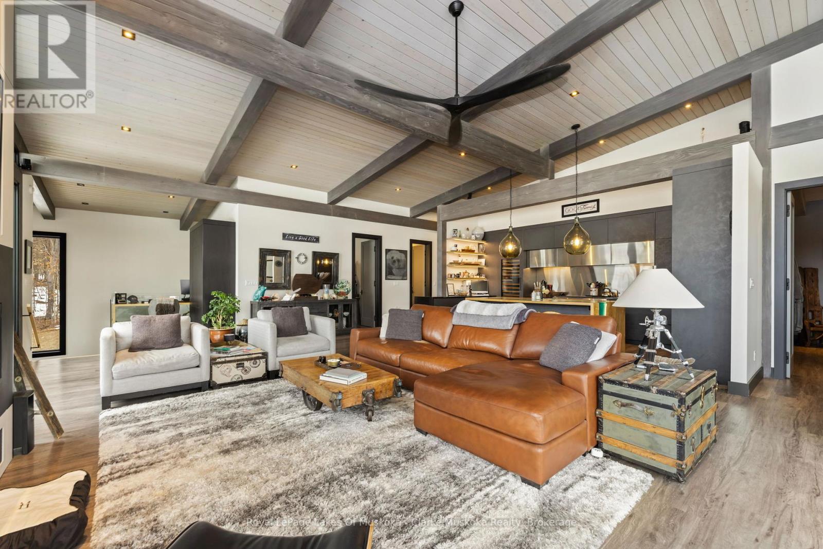 Experience the ultimate in modern country living with this exceptional custom-built estate, completed in 2019 and set on an expansive 94-acre property featuring a charming sugar shack and an extensive network of trails throughout. Offering complete privacy and tranquility, this remarkable home features its own private pond and a fully off-grid lifestyle powered by solar energy. Designed with both elegance and functionality in mind, the open-concept layout showcases a stunning chef's kitchen equipped with a Wolf 8-burner double oven stove, Sub-Zero fridge/freezer, and Miele appliances including a built-in coffee system and dishwasher. A large centre island anchors the space, making it ideal for entertaining.The inviting living room features a propane fireplace, creating a warm and sophisticated atmosphere. Car enthusiasts and hobbyists will appreciate the attached garage with space for up to five vehicles, complemented by an additional detached garage for added storage or workspace. This rare offering combines contemporary design, luxury finishes, and complete self-sufficiency-all within a breathtaking natural setting with private trails and a sugar shack enhancing the property's unique appeal. (id:64974)