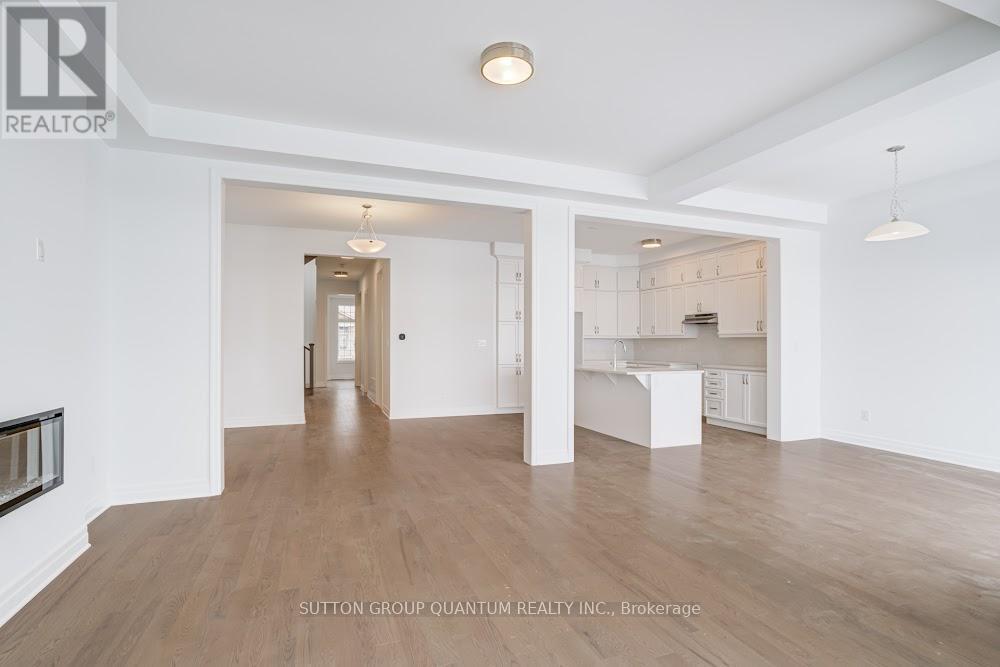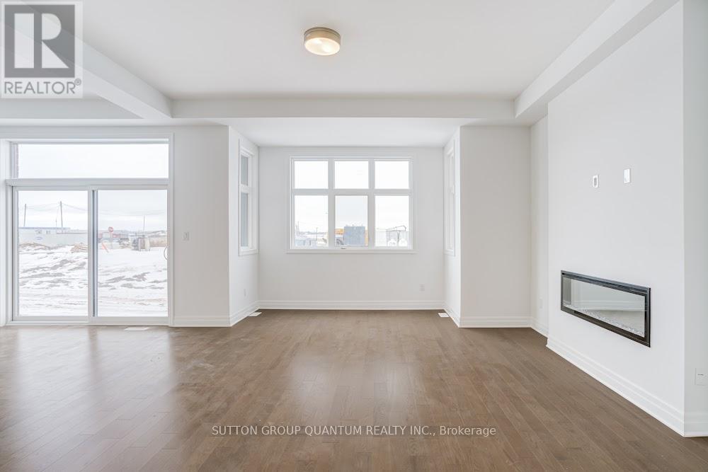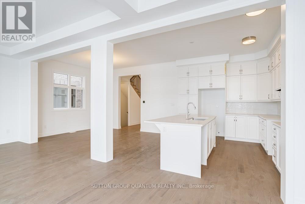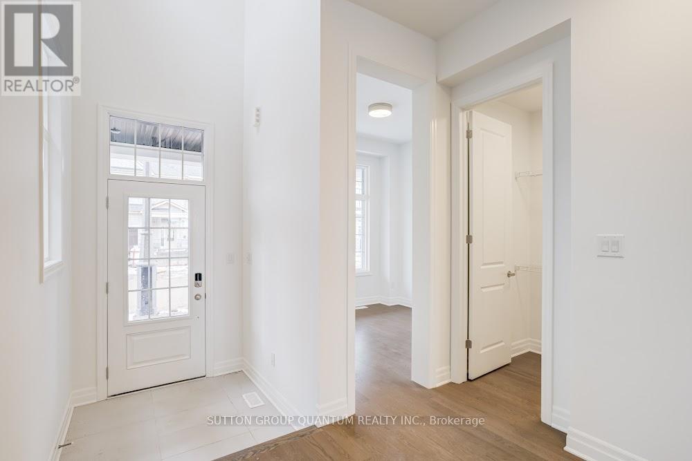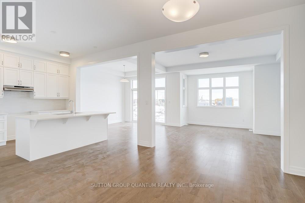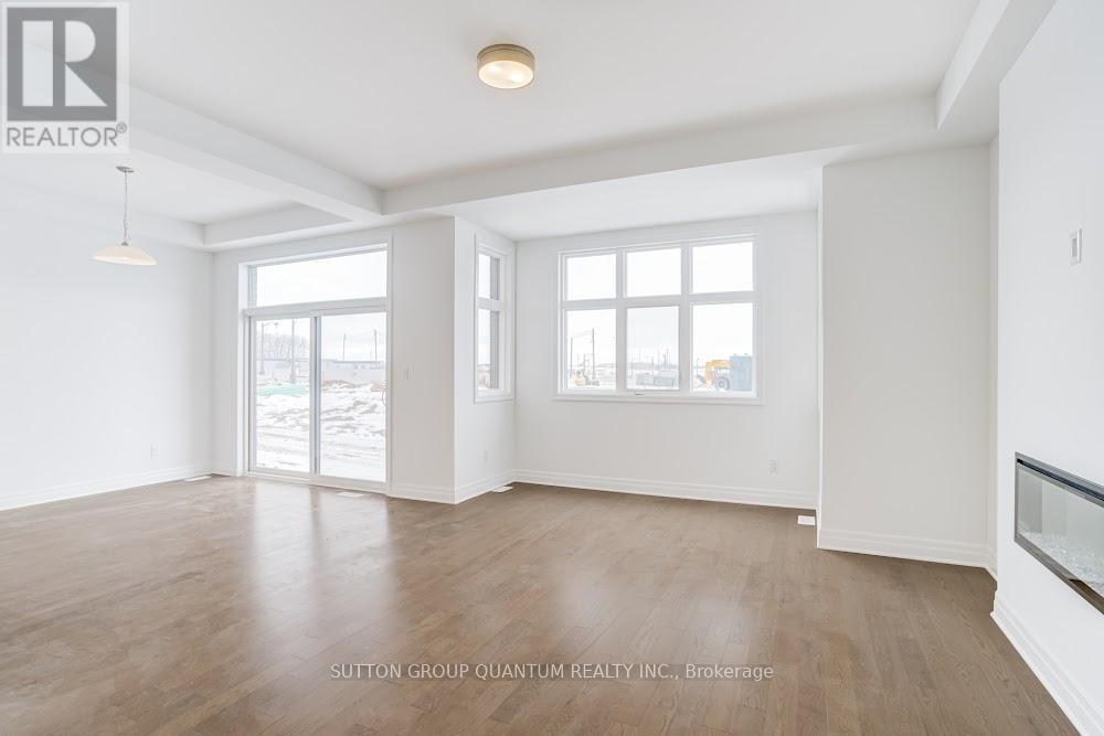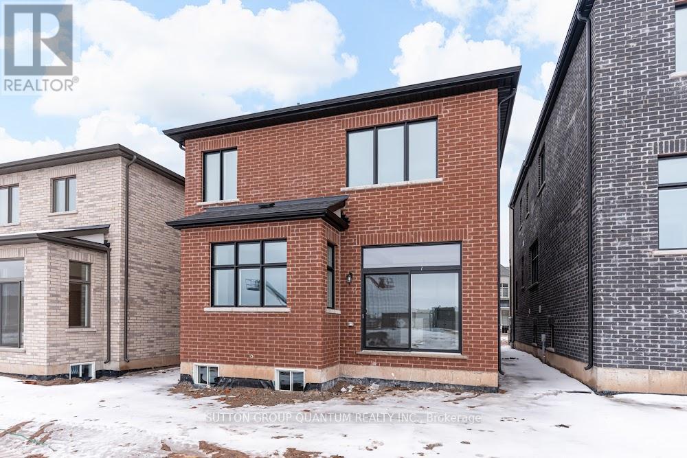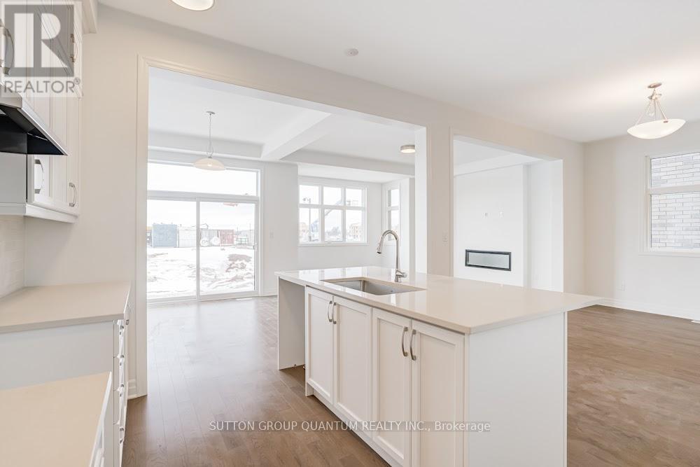 Located at Dundas St. E. and Trafalgar in Joshua Creek, this Mattamy "Reign" model (English Manor elevation) offers 2,758 sq. ft. including 70 sq. ft. open to below, with geothermal energy for long-term efficiency and comfort. Solid brick with stone skirt exterior and single car garage. The main floor features a welcoming foyer open to above, a spacious front walk-in closet to keep daily life organized, and a mudroom with direct garage access. A main floor office/den provides flexibility for work or study. The principal living area is beautifully open and connected - kitchen, dining and family room combined for bright, airy everyday living and easy entertaining. The kitchen is finished in timeless neutral tones with white cabinetry, chrome accents and linen cream quartz counters. Bathrooms are finished in white with Blanco Maple quartz counters and 12" x 24" white floor tiles. Hardwood flooring runs throughout the principal rooms in a neutral Lauzon Talpa finish. Upstairs, the large 14' x 14' primary bedroom comfortably accommodates full bedroom furniture and features a thoughtfully designed "quiet wall" - a clean, uninterrupted wall ideal for anchoring the room and creating a calm focal point. The laundry room is ideally located between the bedrooms for everyday convenience. A Home Office Package is available in select bedrooms and dens (please speak to the Design Consultant for details). Interior doors are Carrara style with two square panels, adding a clean, transitional touch throughout. **Eligible First Time Home Buyers may be able to receive up to an additional 13% savings on the purchase of this home through the proposed Government FTHB Rebate Program** (id:64974)