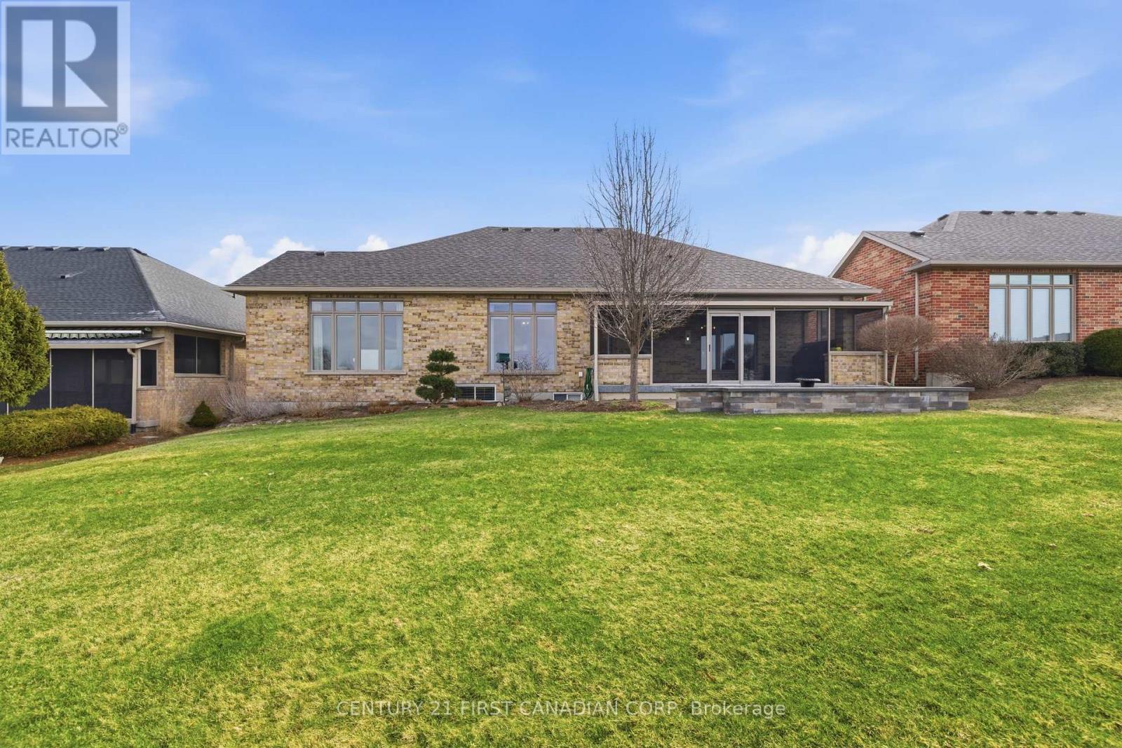 Welcome to carefree adult lifestyle living at RiverBend Golf. The only 'gated' community in London with 24-hour concierge coverage, where more than 475 bungalows are located around the championship RiverBend Golf Course in an Audubon Society-certified setting almost surrounded by the meandering River Thames. This bungalow overlooks the 11th hole delivering fabulous views of this magnificent golf course. Features of the sun filled main floor include: a fabulous Great Room with gas fireplace, large kitchen and island with granite surfaces, plenty of customized cabinetry, breakfast area, dining Room , two bedrooms, four piece ensuite and a second four piece bath, and home office. The lower level includes a magnificent bar area with sink and bar fridge, great room with pool table included, three piece bath and bedroom. Out back enjoy your screened in patio for all day enjoyment plus an outside patio if you are looking for a little sun. Only about half of RiverBend residents are golfers, but all residents have access to the incredible 28,000 sq ft Clubhouse, with its restaurant, bar, and verandah, which allows a breathtaking 135 view of the golf course, as well as its heated indoor pool and exercise facilities. Beyond that, Riverbend offers the opportunity to get involved in a wide range of activities through more than 20 Social Clubs, ranging from Bridge to Photography to Pool and Snooker. Land lease: $873.53/m. and Maintenance: $646.92/mo. covers concierge, lawn care, snow removal and Clubhouse privileges. Come and live the lifestyle ! (id:64974)